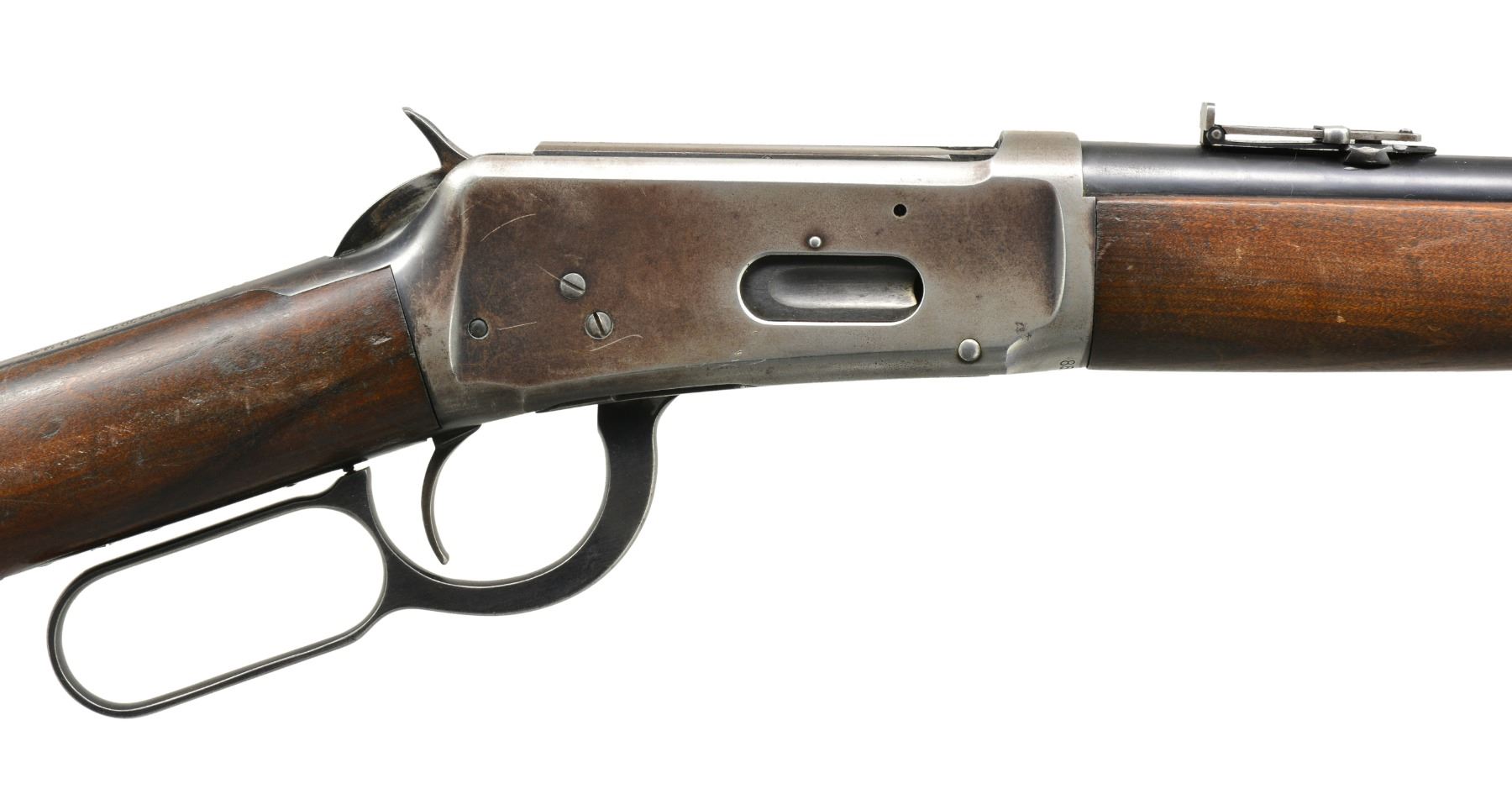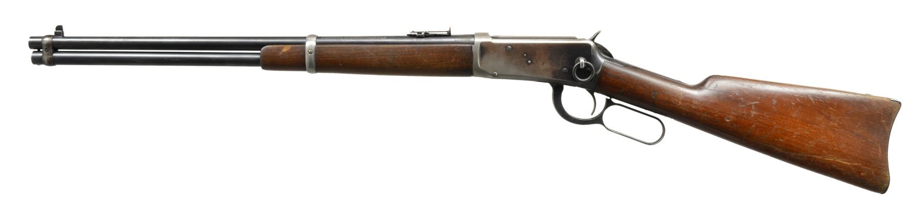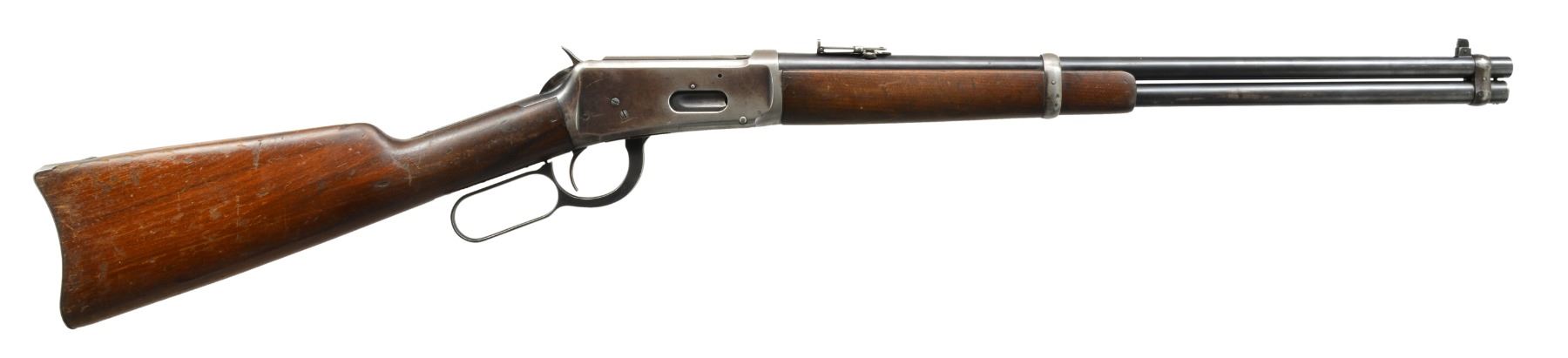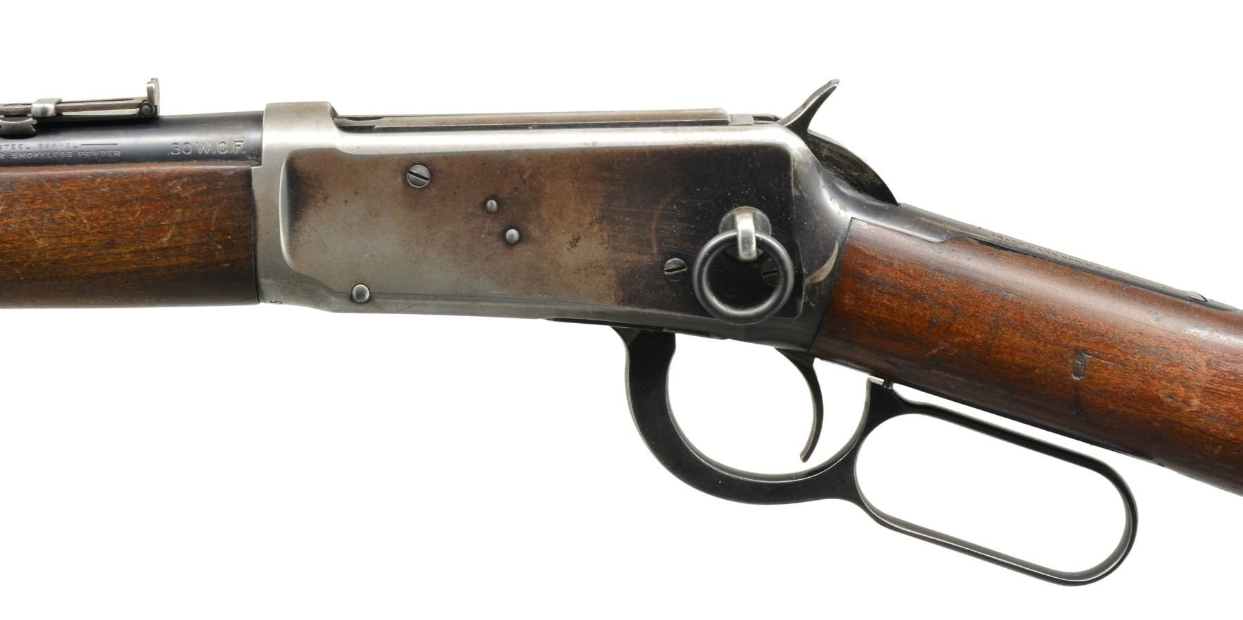 Cal. 30 WCF. S# 851245. Bbl. 20" carbine style w/ pinned blade front sight & graduated leaf carbine rear sight. Full length mag. Blued finished action has saddle ring on left side. Gumwood forearm & stock w/ steel carbine buttplate. Mfg. 1919. CONDITION: bbl. & mag. tube retain 75% dull lightly faded blue showing spots of wear & corrosion. Action retains 30% worn blue fading to gray. Stocks have worn original finish showing numerous dents & scratches. Bore retains strong rifling showing spots of darkening in grooves. (20-566/DS). CURIO. $1,000-1,500.
