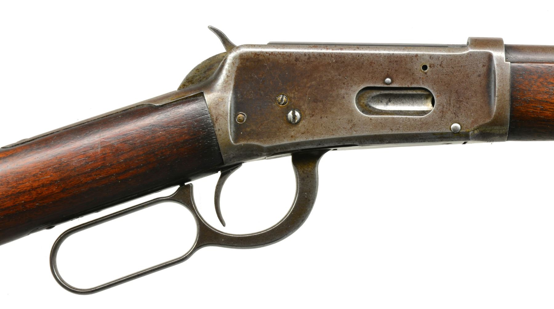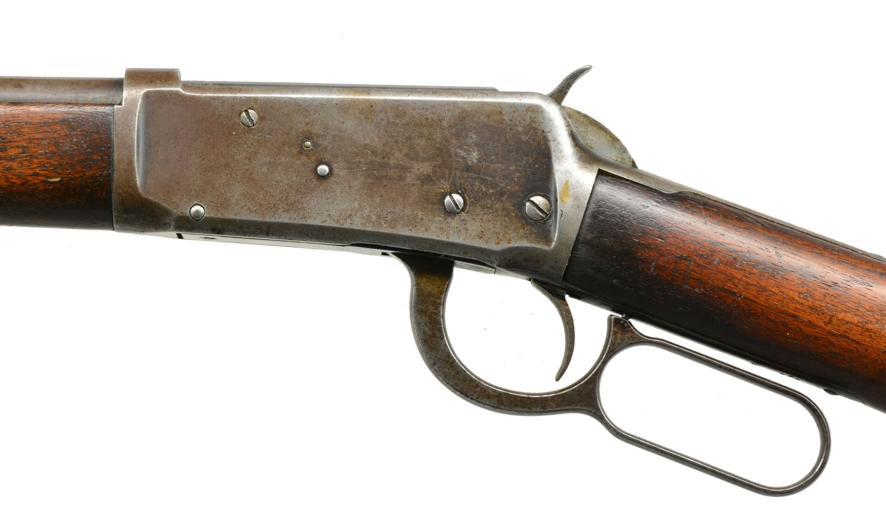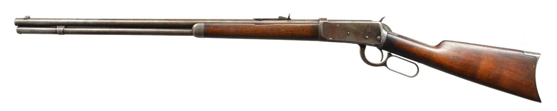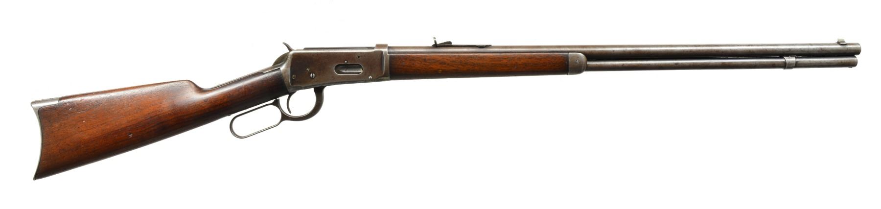 RIFLE. Cal. 32-40. S# 924. Bbl. 26" rnd. Original sporting front sight & elevator adj. semi buckhorn rear sight. Walnut forearm & straight grip stock w/ crescent steel buttplate. 1894 Mfg., first year of production. CONDITION: metal finish has faded to a mottled gray brown patina showing some surface corrosion & light scratches. Stock & forearm are heavily sanded w/ an old refinish showing age darkening w/ wear, scratches & handling marks. Dark bore w/ worn rifling having a sm. ring about 6" from the muzzle. (01-17432/DS). ANTIQUE. $1,000-1,500.