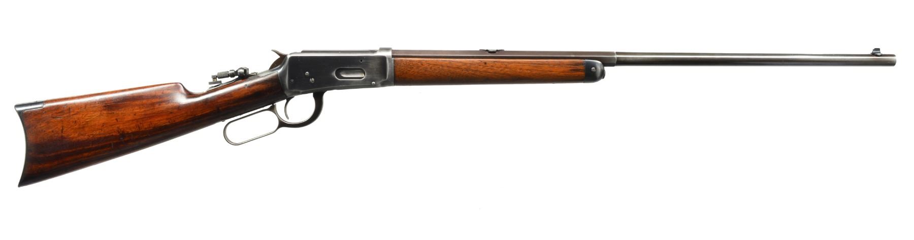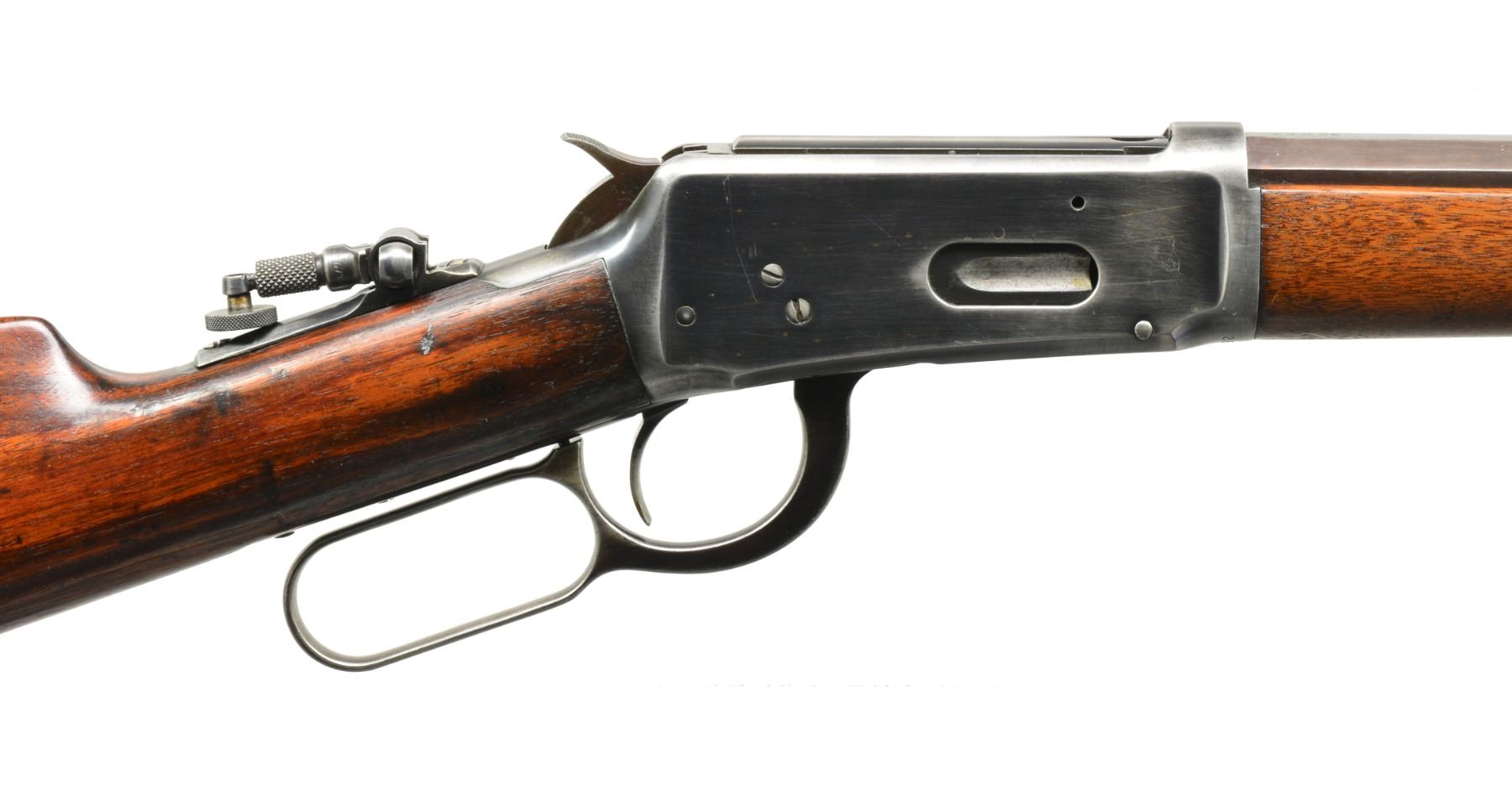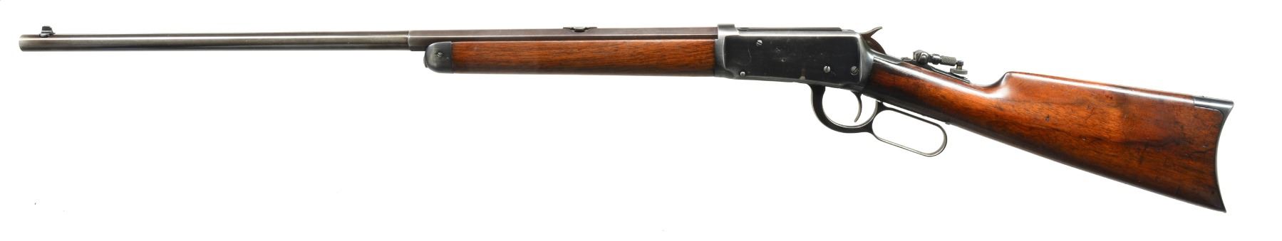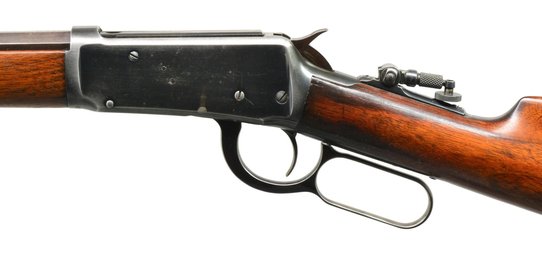 Cal. 30 WCF. S# 266885. Bbl. 26" 1/2 rnd. Dovetail bead front sight, blank in rear dovetail & combination tang sight. Button mag. Standard forend w/ nose piece. Straight grip stock w/ crescent steel buttplate. CONDITION: good. Bbl., action & buttplate retain 80% lightly faded reblued finish showing carry wear. Bbl. has slightly plum cast. Sanded & refinished wood shows scattered scratches, dents & handling marks. Stock has a hairline crack behind top tang. Bore is dark w/ worn rifling & light pitting. (19-5077/DS). CURIO. $800-1,200.