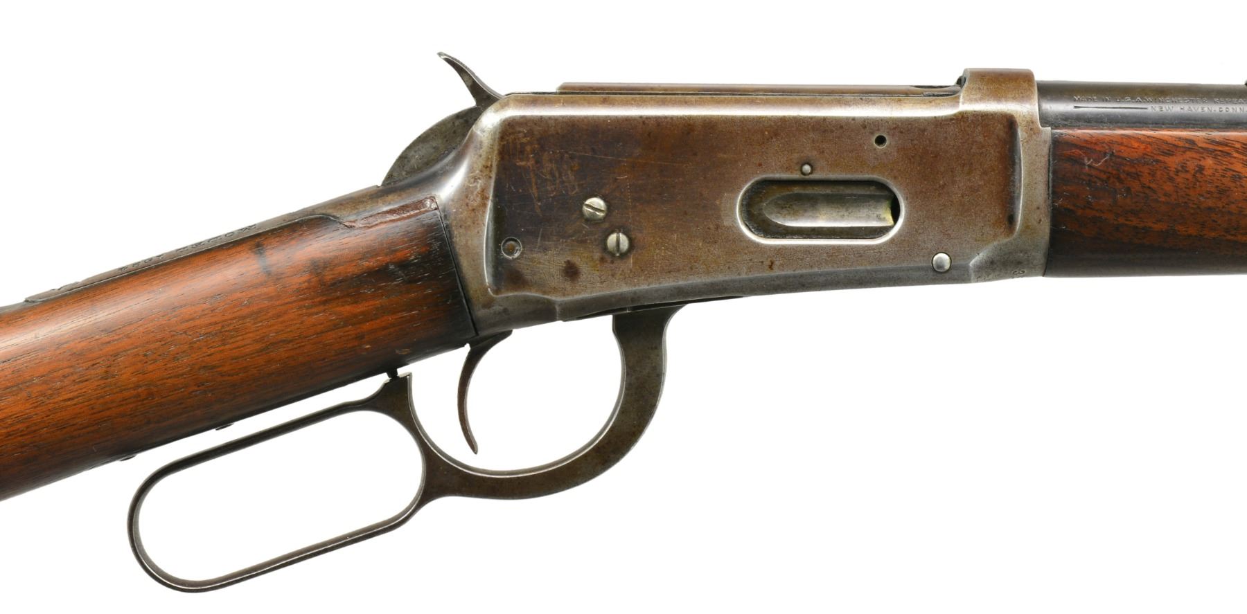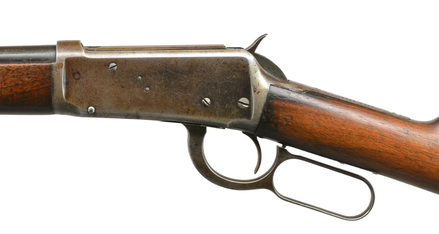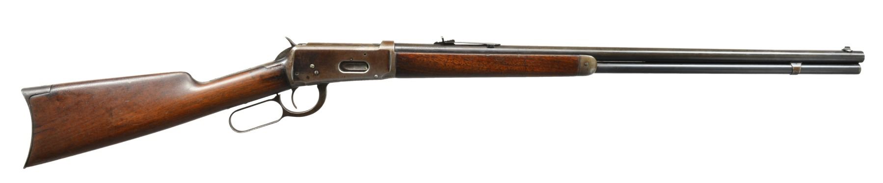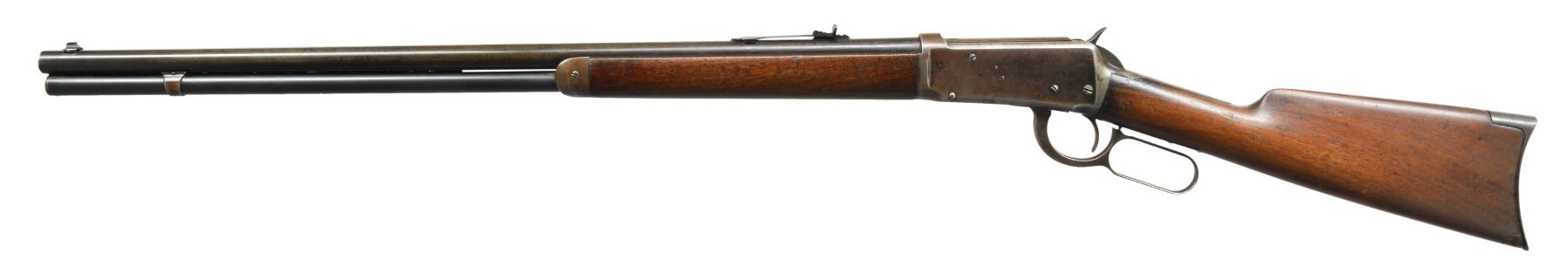Cal. 38-55. S# 358218. Bbl. 26" rnd. Bead front sight w/ flat top sporting rear sight. Full length mag. Walnut forearm & straight grip stock w/ crescent steel buttplate. CONDITION: bbl. blue is fading to brown showing spots of light pitting. Mag. retains 80% lightly faded blue. Action shows areas of dull blue fading to mottled patina. Sanded & refinished wood shows numerous scratches & handling marks. Buttstock has sm. crack extending from right side of buttplate w/ area of epoxy fill right of top tang. Tang plug screw is removed. Sight elevator is a replacement. Bore is bright w/ sound rifling. (20-722/DS). CURIO. $700-1,000.