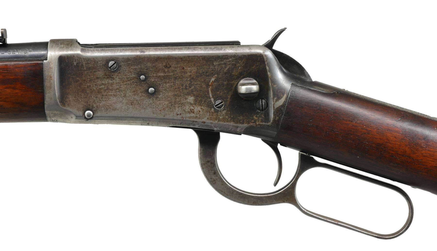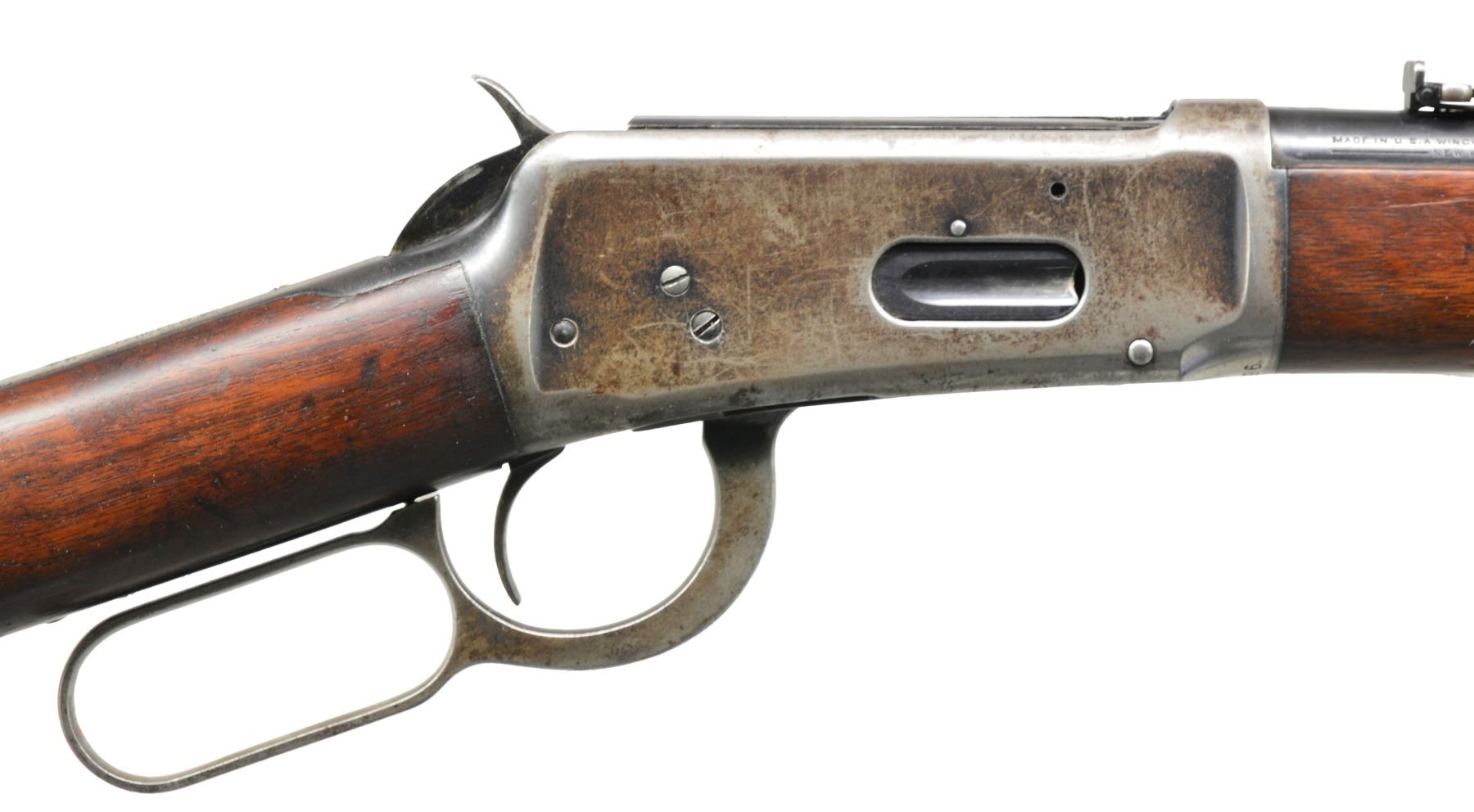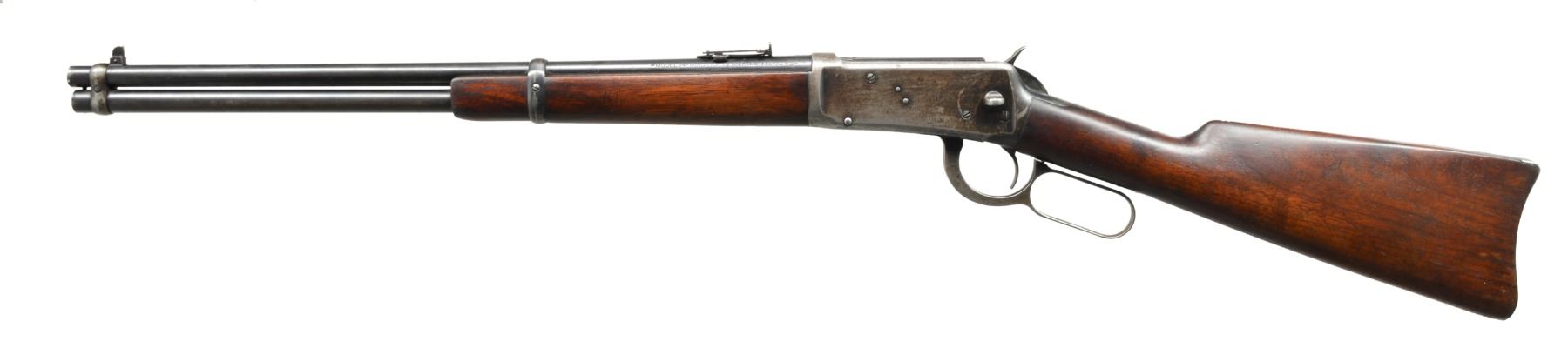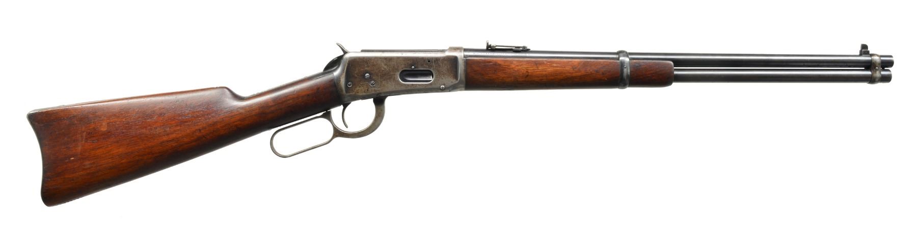 Cal. 32 W.S. (Spl.). S# 988365. Bbl. 20” w/ ladder carbine rear sight & pin retained front post blade. Mfg. 1926 w/ saddle ring stud on receiver & carbine buttstock; long wood forend. Top tang marked “MODEL 94” (not 1894). Bbl. marked “MODEL 94” plus “NICKEL STEEL”. Rectangular border checkered panel on hammer. CONDITION: good general overall appearance w/ patina in receiver area & on buttplate. Rub marks on high points of bbl. bands. Sm. areas of peppery oxidation on bbl. & mag. tube w/ beginning patina on bottom of mag. tube. Stock set w/ light handling marks plus hunting kill notches; 8 at toe near butt plus 2 at front of comb. Fair to good bore w/ slight wear & cleaned even light pitting. Missing saddle ring, base remains. (20-373/NW). CURIO. $600-900.