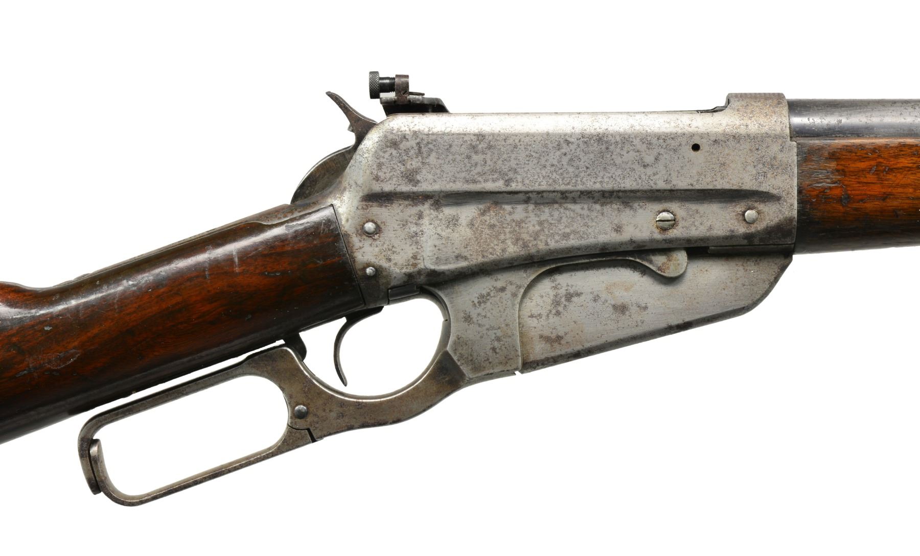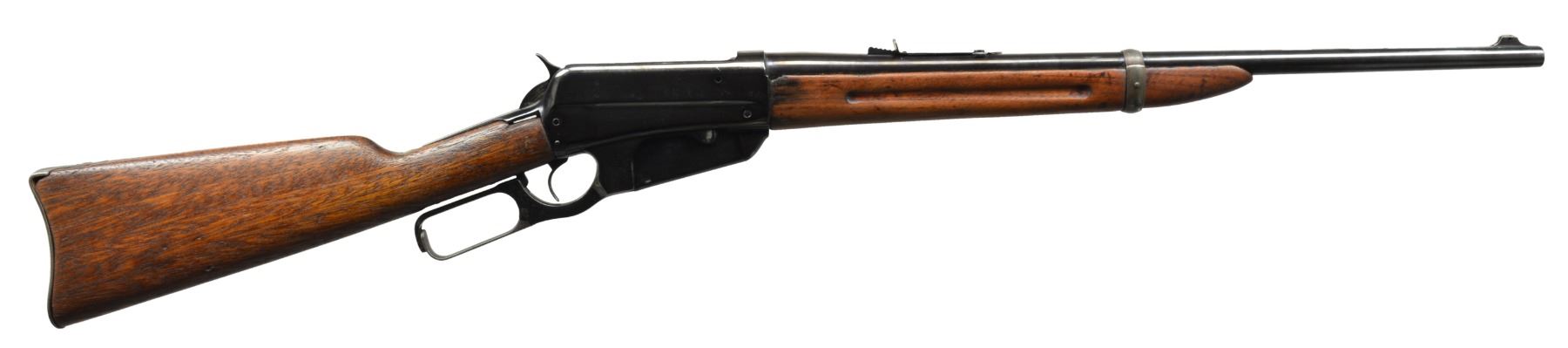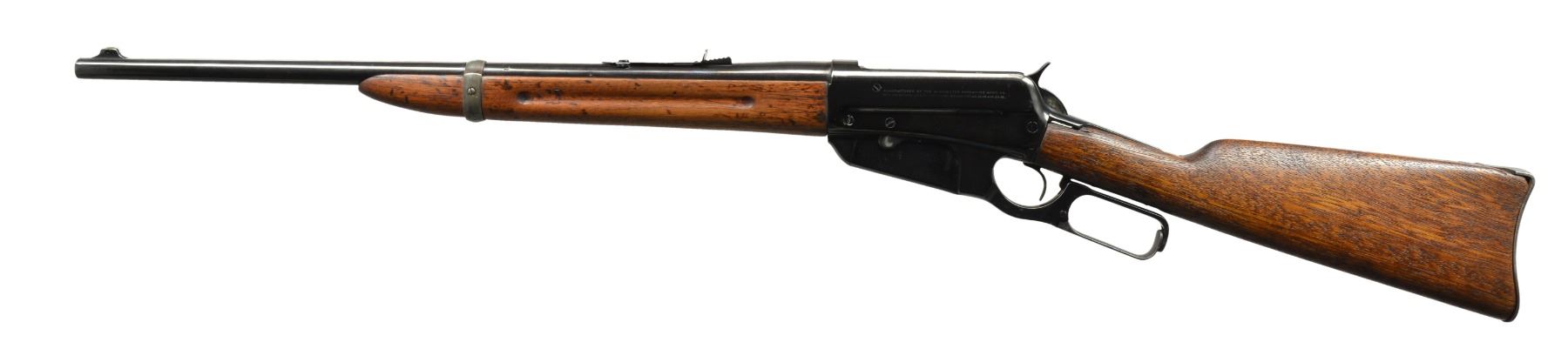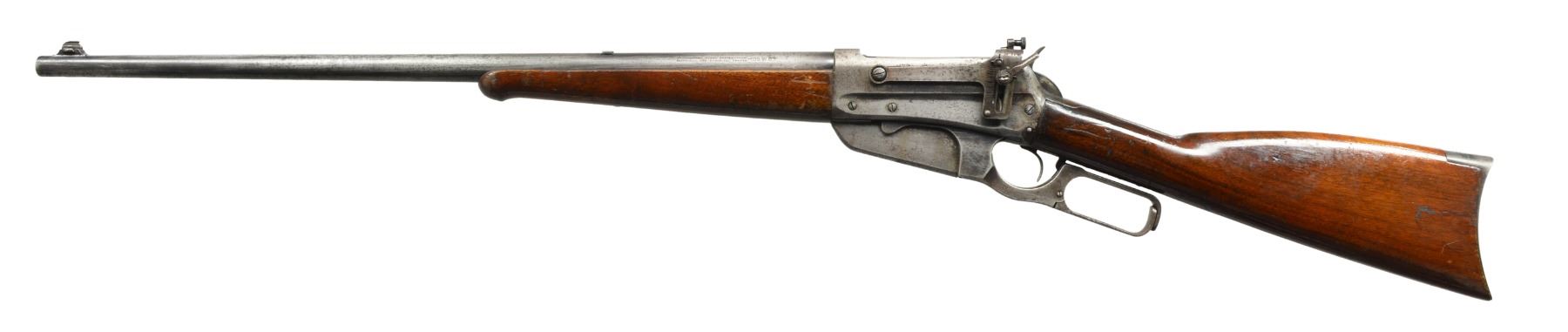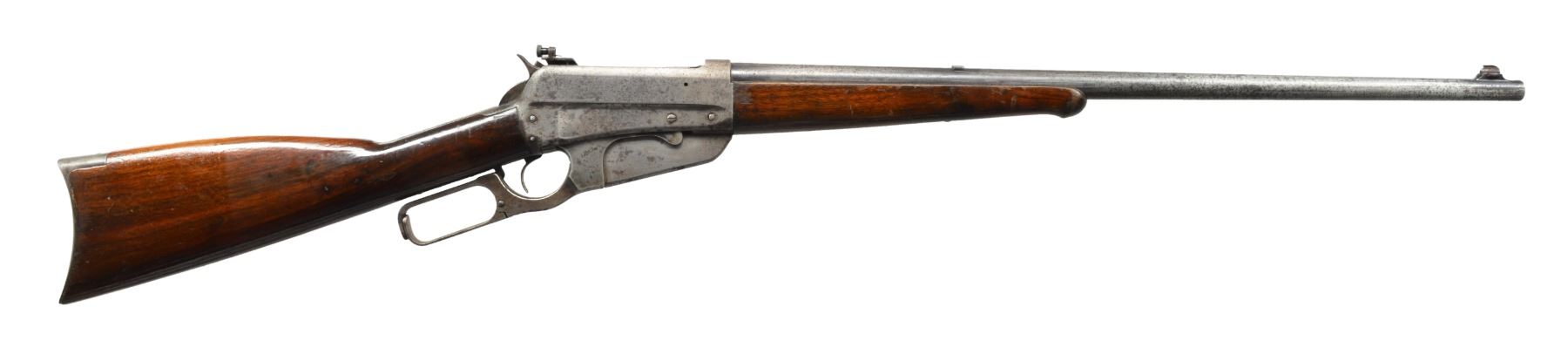 1) Cal. 35 WCF. S# 416472B. Bbl. 24" rnd. Ramp mounted Marbles Sheard front sight, King filler in rear dovetail w/ "Climbin Lyman" receiver sight. Schnabel tipped walnut forearm w/ black insert. Straight grip walnut stock w/ crescent steel buttplate. CONDITION: bbl. & action retain some blue in protected areas w/ balance showing areas of pitting & evidence of cleaning. Heavily sanded wood has heavy coat of gloss finish over scratches, dents & marks. Comb of stock is rounded. Bore has slightly darkened appearance w/ intact rifling. (20-1085/DS). 2) 1895 CARBINE. Cal. 30 US (30-40 Krag). S# 36801. Bbl. 22" w/ replacement pinned blade front sight & replacement elevator adj. rear sight. Band fastened grooved carbine forearm & straight grip stock w/ trapdoor carbine buttplate. Handguard is removed. CONDITION: over 90% brightly polished reblued finish showing remaining pitting. Heavily sanded & undersized wood has dull finish over handling marks w/ chips & cracks around action. Dark pitted bore. (20-1106/DS). ALL CURIO. $850-1,300.