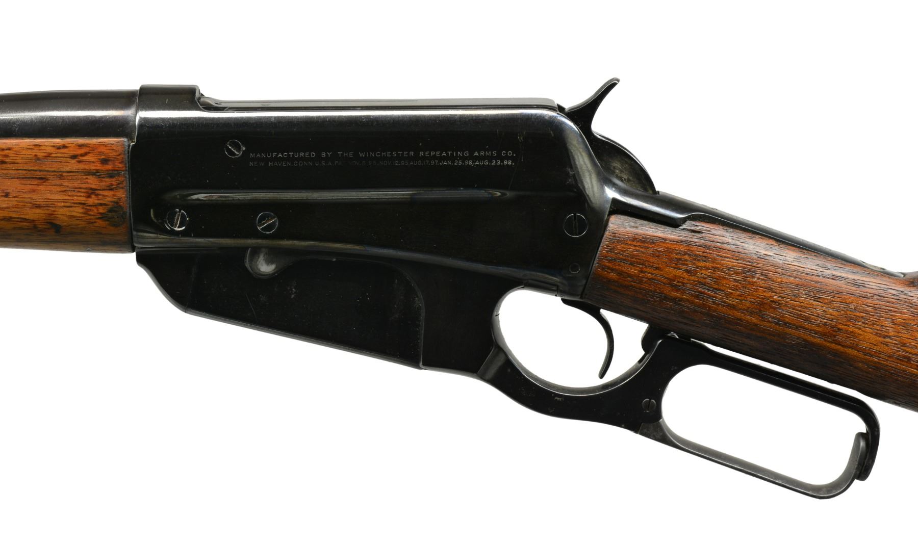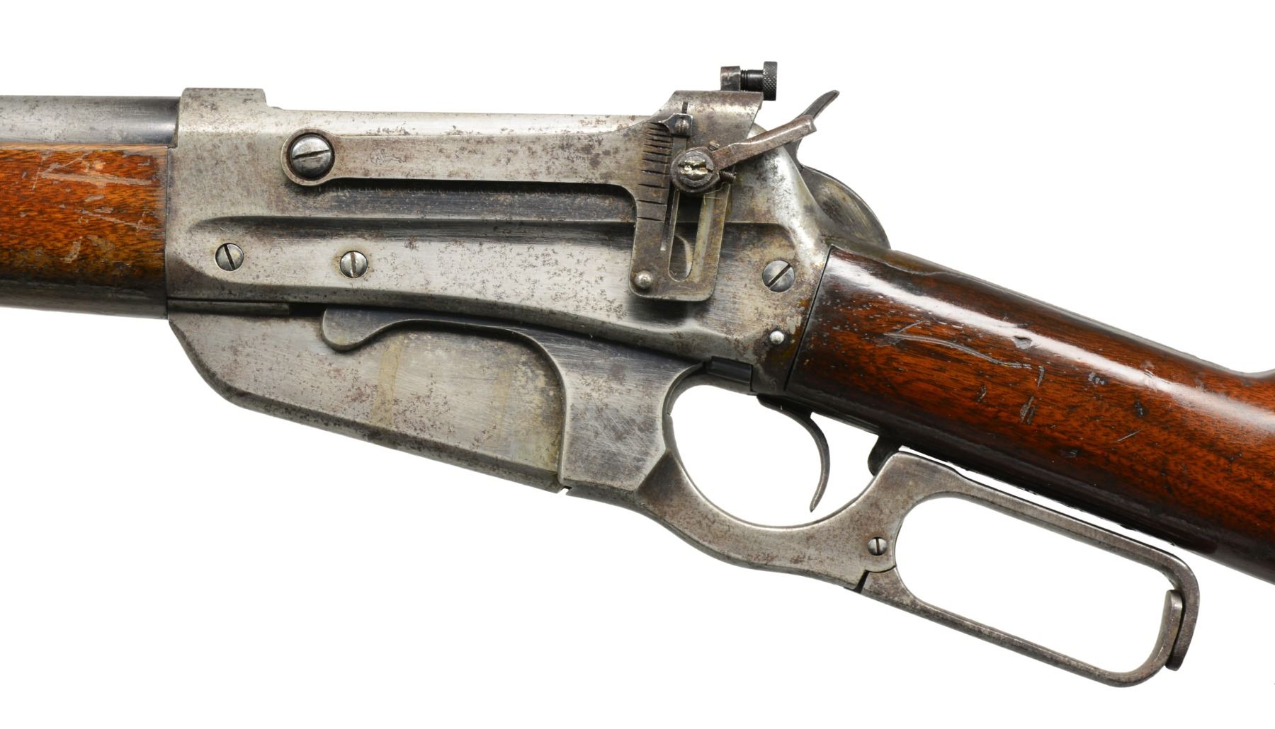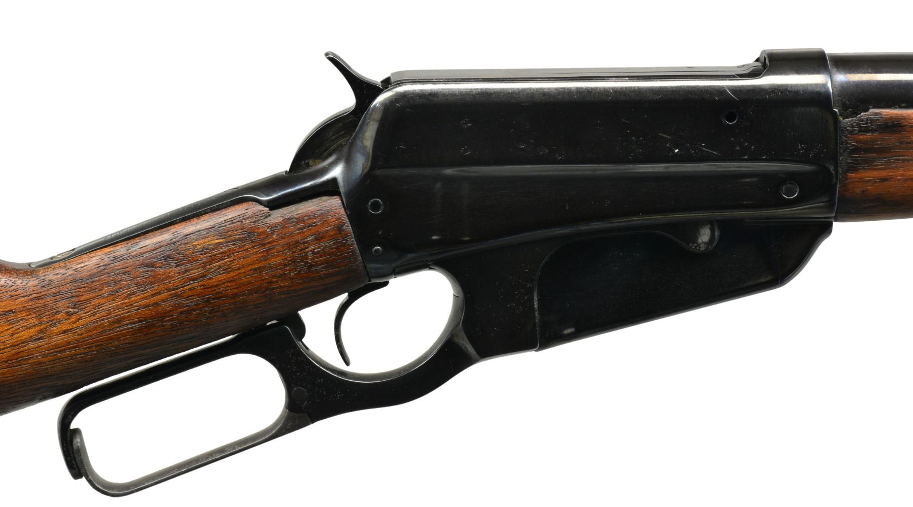 1) Cal. 35 WCF. S# 416472B. Bbl. 24" rnd. Ramp mounted Marbles Sheard front sight, King filler in rear dovetail w/ "Climbin Lyman" receiver sight. Schnabel tipped walnut forearm w/ black insert. Straight grip walnut stock w/ crescent steel buttplate. CONDITION: bbl. & action retain some blue in protected areas w/ balance showing areas of pitting & evidence of cleaning. Heavily sanded wood has heavy coat of gloss finish over scratches, dents & marks. Comb of stock is rounded. Bore has slightly darkened appearance w/ intact rifling. (20-1085/DS). 2) 1895 CARBINE. Cal. 30 US (30-40 Krag). S# 36801. Bbl. 22" w/ replacement pinned blade front sight & replacement elevator adj. rear sight. Band fastened grooved carbine forearm & straight grip stock w/ trapdoor carbine buttplate. Handguard is removed. CONDITION: over 90% brightly polished reblued finish showing remaining pitting. Heavily sanded & undersized wood has dull finish over handling marks w/ chips & cracks around action. Dark pitted bore. (20-1106/DS). ALL CURIO. $850-1,300.