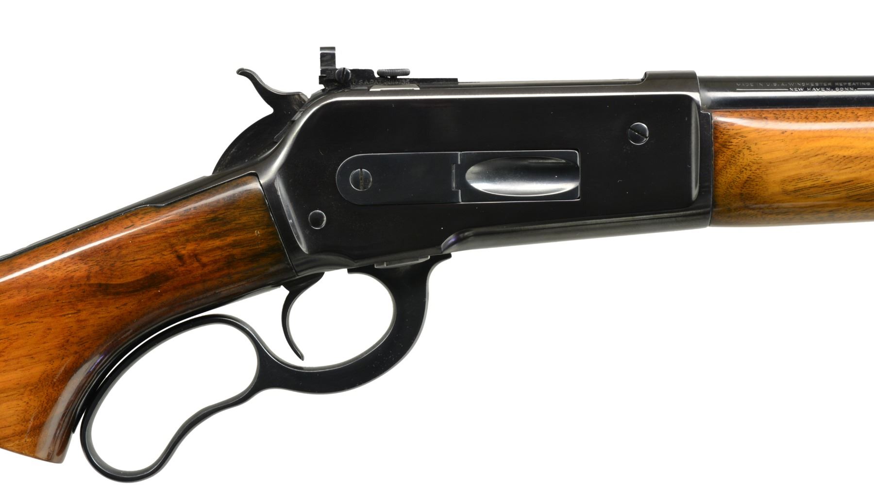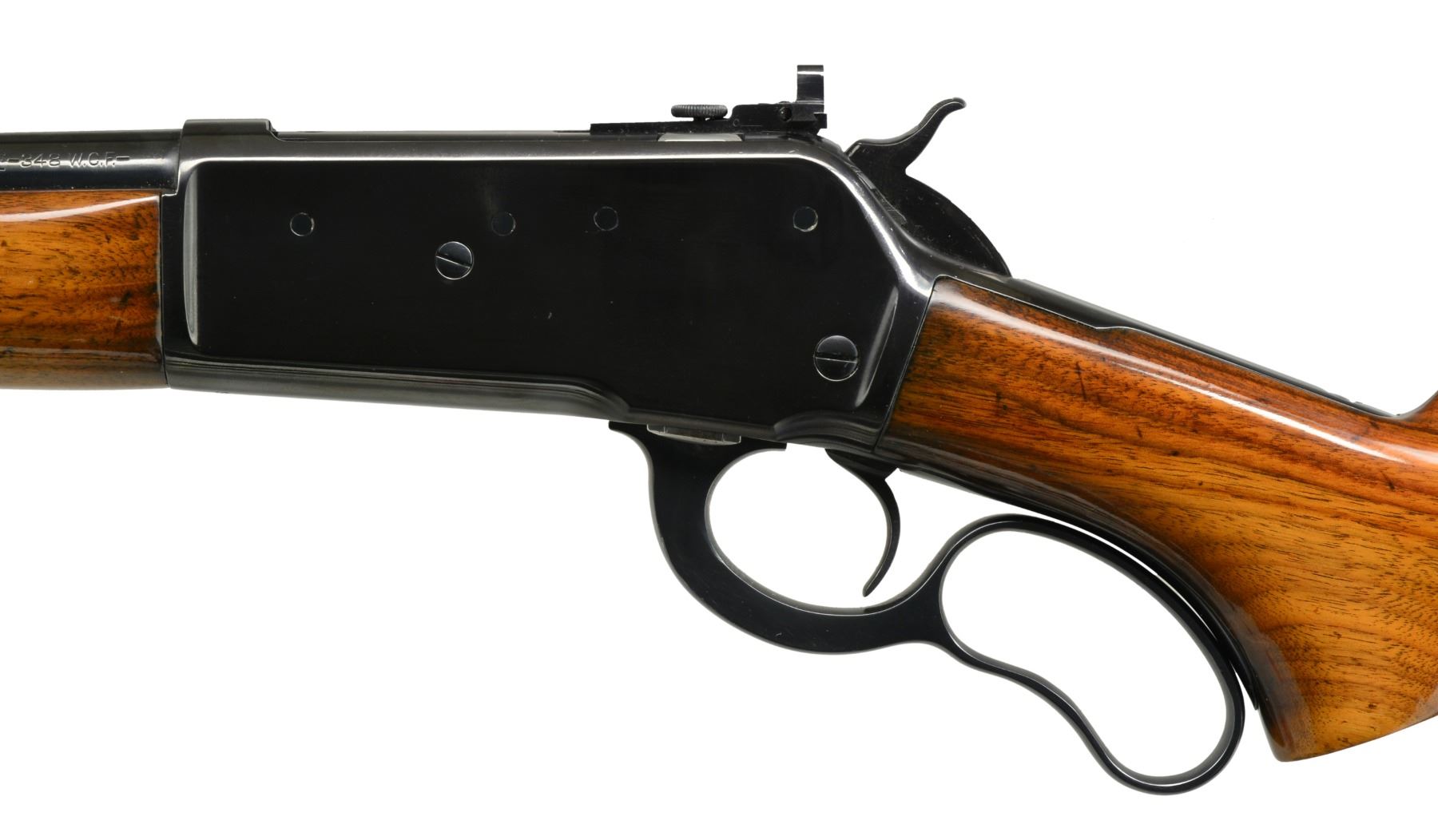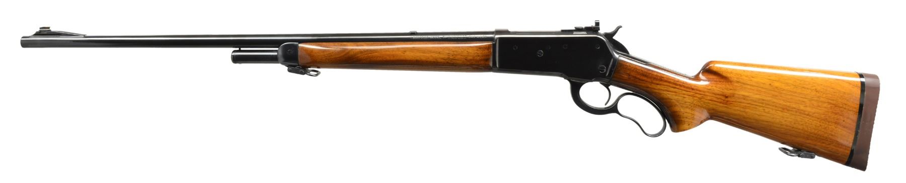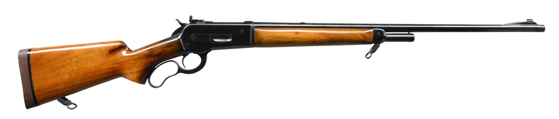 PEEP SIGHT. Cal. 348 Win. S# 546. Bbl. 24” rnd. w/ all Winchester markings, has rear dovetail plugged w/ blank, gold bead front is in standard ramp. Early action w/ long top tang has 4 holes on left side plugged. American walnut pistol grip buttstock measures 13” over Pachmayr pad. Stock & forend cap are fitted w/ Super grade sling swivels. CONDITION: good, as refinished. All metal parts have a glossy blue, polishing is not of the highest order w/ many visible marks & rounded edges. Stocks have some marks in renewed oil finish. Bore is fine, shiny w/ good rifling. Action is smooth. Bolt peep sight has aperture which will not hold position. Screw needs to be retapped to a larger size. (20-603/MGM143). CURIO. $800-1,200.
