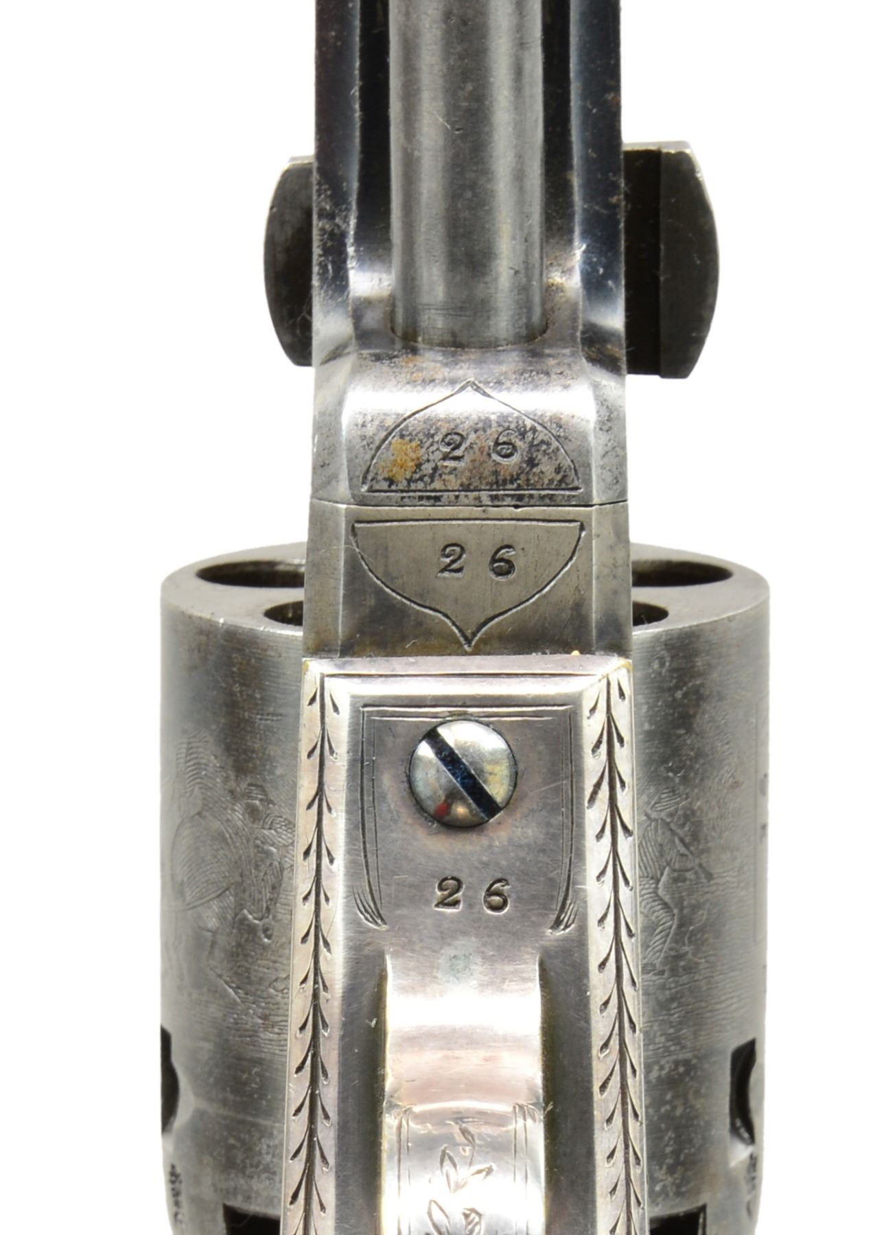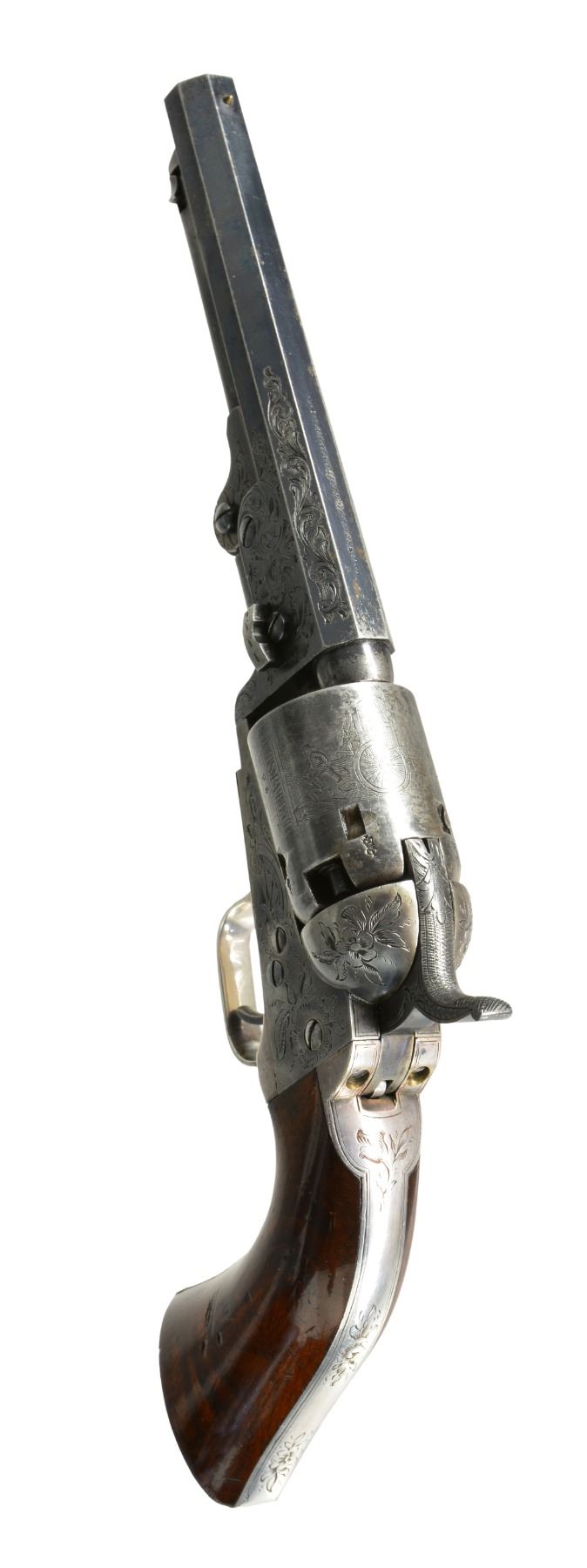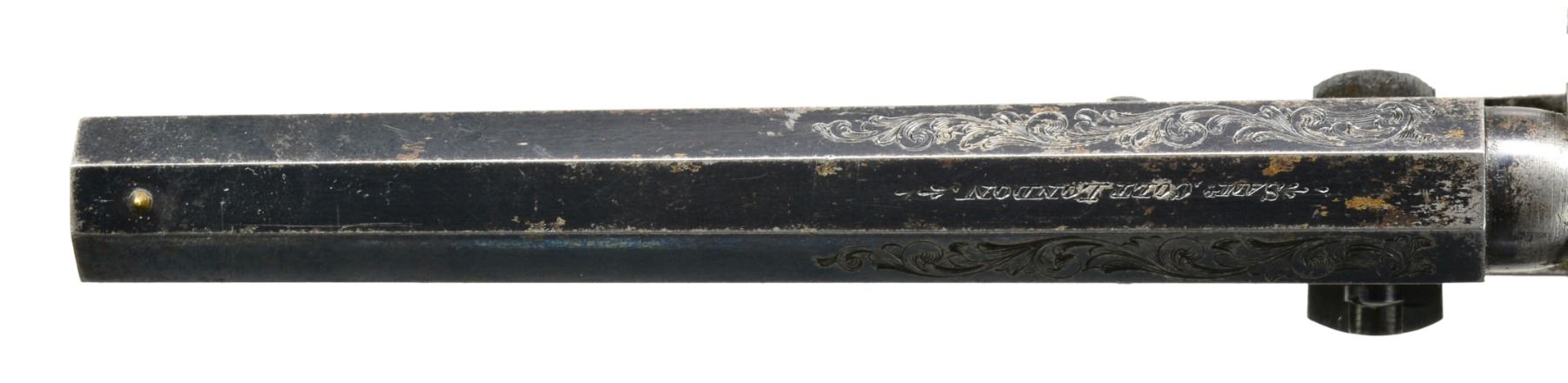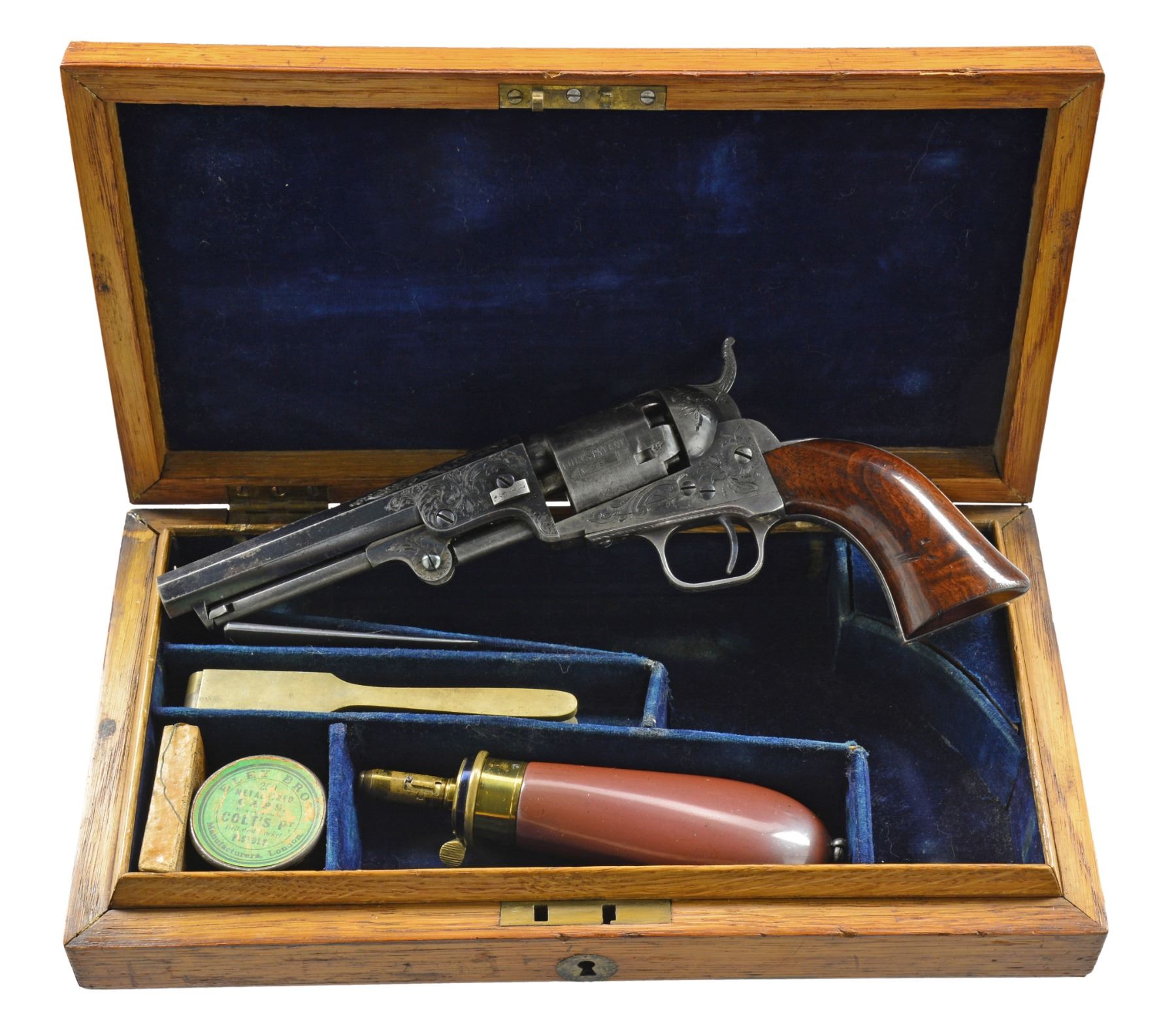EXPOSITION, COLT LONDON POCKET MODEL PERCUSSION REVOLVER. Cal. 31. S# 26. Bbl. 5". This is a very rare and beautifully engraved Colt Model 1849 most likely made for the Dublin Exposition of 1853. The engraving style is unique with floral and rococo designs. The barrel address is hand engraved in unique small lettering not seen on any other revolver. London proofs were added after engraving as the normal proof on right side of barrel housing is found in unengraved area below wedge slot which is not noted on any other specimens. Deluxe grips are nicely burled with fine color. The casing also has unique carved mother of pearl flower shaped compartment knob not seen on any other specimen. Larry Wilson in his Colt Engraving text shows this gun and states there are three types of London engraving and cites this example as being the rarest if not unique. Gun appears original, complete and authentic as manufactured though serial number on cylinder does not match balance of gun though still two digits “95”. There are other Colt exhibition guns known with unserialized cylinders, this gun possibly was rushed for the exposition and this was the cylinder available. Most likely this is the only Model 1849 with this style of engraving as made for the Dublin Exposition in 1853 and this 2 digit gun was first year produced in London. UNATTACHED ACCESSORIES: rare early London oak casing; has no provision for cleaning rod, and no mortise cut for bullet mold sprue cutter. Case contains near new Dixon bag flask with virtually all of its original varnish, a 2-cavity "COLTS PATENT" brass bullet mold, L-shaped combination gun tool, original pack of caps with Eley Brothers paper label and original 5-cartridge pack of Colt cartridges. Also included in this lot is a copy of “Fine Colts, The Dr. Joseph A. Murphy Collection”. CONDITION: extremely fine overall, all matching with exception of cylinder as noted. Barrel retains about 95% bright blue finish with crisp markings. Cylinder has traces of thin blue with crisp, complete rolled “Stagecoach Holdup” scene with balance silver/blue patina. Frame and hammer retain most of their original muted case color with balance silver/gray. Trigger guard and backstrap retain virtually all their silver plate. Grips retain virtually all their original factory varnish with light edge wear and a few sm. dents. Accompanying case is very good overall with vacant scalloped brass plaque, blue velvet interior is very good with light fading, there are several repairs to velvet lining wear worn through apparently in revolver compartment, sides to lidded compartment are bowed out slightly with old glued repair. Mold and gun tool are both very good and smooth overall, gun tool retains about half its finish. Cap tin is empty but discernable label, cartridge pack is very good and complete. The pre-Colt contract Dixon flask is excellent retaining virtually all varnish & bright fire blue to spring. PROVENANCE: Raymond Kendall Collection; pictured on pages 230, 239 & 240 of Wilson’s “Colt Engraving Book Volume I” (Though Wilson misidentifies serial number); Pictured on page 87 of the 1999 “Fine Colts, The Dr. Joseph A. Murphy Collection” as frontis showing this example as epitome of English engraving of London Colts. (01-17677/JS). ANTIQUE. $25,000-30,000.