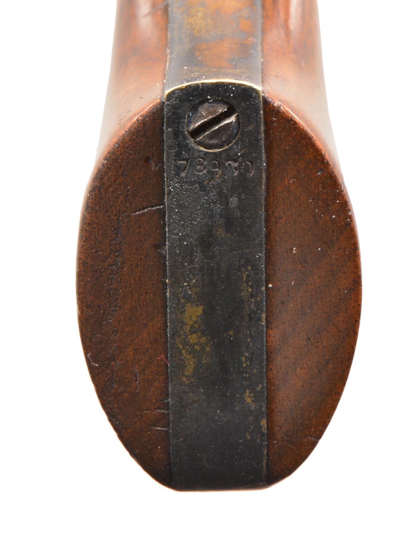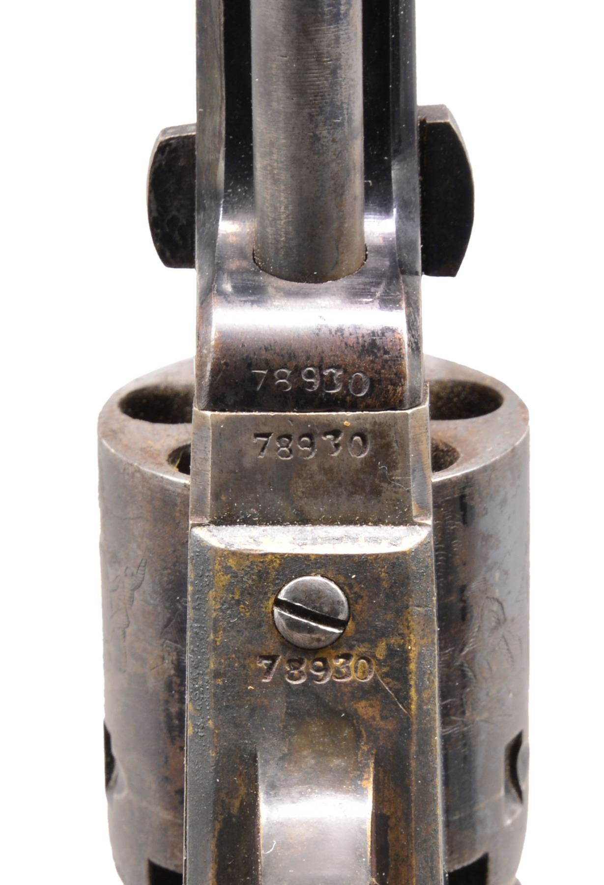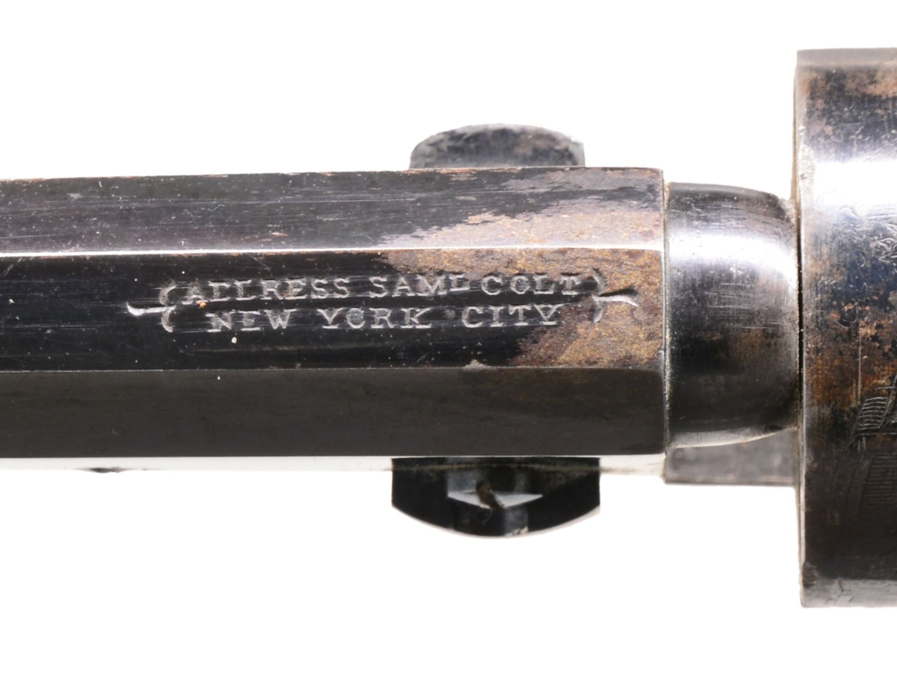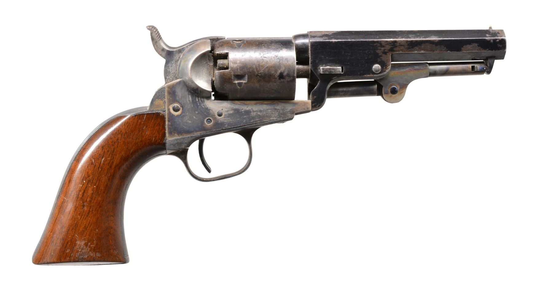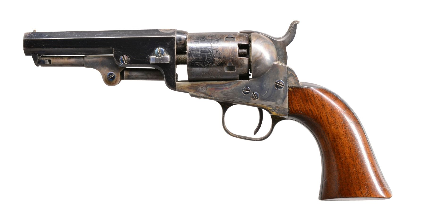 Cal. 31. S# 78930. This is a beautiful pocket w/ 4" bbl. in standard configuration of other 1853 mfg. examples. Oct. bbl. w/ 2 line New York address w/ brackets, 5 shot smooth cyl. w/ rolled stagecoach holdup scene, sm. "COLTS / PATENT" on left side of frame, silver plated backstrap & trigger guard, varnished 1 piece stocks. CONDITION: near excellent overall. All matching. Bbl. retains over 90% original blue. Cyl. retains approx. 40% bright blue w/ balance plum/blue w/ well defined cyl. scene & all 5 crisp safety pins. Frame & hammer retain virtually all their bright & muted case colors, though some muted. Backstrap & trigger guard retain approx. 80% silver plate, though mostly oxidized black. Grips are excellent retaining nearly all their original factory varnish w/ light edge wear & scattered minor cosmetic blemishes. Mechanically crisp w/ bright shiny bore. PROVENANCE: Estate Collection of Dan Poppen. (01-17332/JS). ANTIQUE. $2,000-3,000.