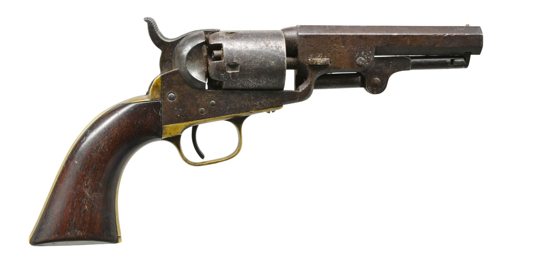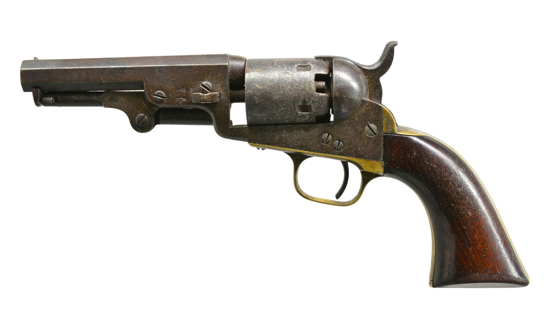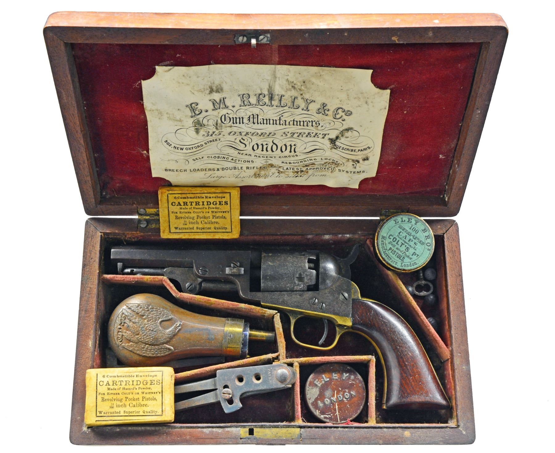 PERCUSSION REVOLVER WITH EXTRA ACCESSORIES. Cal. 31. S# 723X. Standard configuration. Bbl. 4". Made in 1854 w/ 2 line London address, sm. English proofs on bbl. lug & each chamber. UNATTACHED ACCESSORIES: English casing holds a fine dbl. eagle flask, 2 cavity "COLTS PATENT" bullet mold, L shaped gun tool, japanned tin of Eley caps, 2 original packs of cartridges, several loose balls, functioning key to broken lock & 2 tins of "COLT'S PT" green label percussion caps, both in fine condition. CONDITION: good, complete & matching, mechanically poor & sloppy. Crisp sharp dark bore. Casing sound, red baize interior heavily soiled. Flask, cap tins, cartridge packs are very good to fine overall. “Colts Patent” mold & tool both very good w/ about 50% thinning blue. PROVENANCE: Estate Collection of Dan Poppen. (01-17340/JS). ANTIQUE. $2,000-2,500.