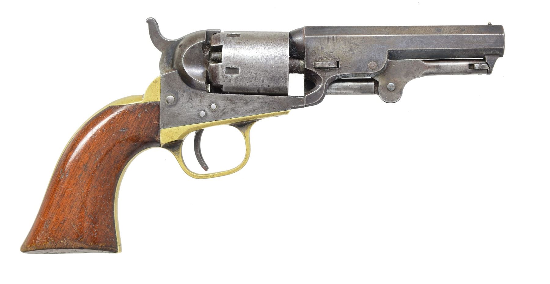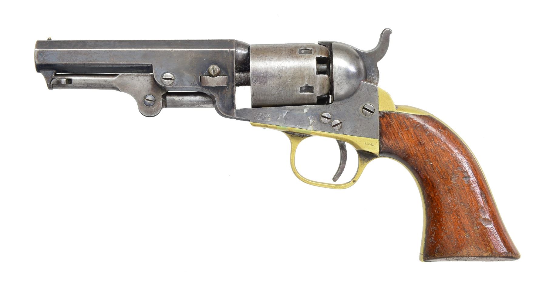 Cal. 31. S# 331801. Bbl. 4" oct. w/ brass bead front sight w/ standard New York address. 5 Shot rnd. cyl. w/ stagecoach scene roll engraving. Blue finish w/ case color frame. Lg. brass trigger guard & backstrap. 1 Piece walnut grip. Bbl., frame & grip straps have matching #"s. Cyl. has partially visible matching numbers, wedge is unmarked. CONDITION: bbl. retains 30% dull fading blue, showing sm. dents in wedge area. Cyl. has faded to gray showing spots of light pitting and retains sm. amounts of cyl. scene. Frame, loading lever & hammer retain traces of case colors in protected areas. Loading lever has series of sm. dents on bottom of rammer. Brass parts show evidence of old cleaning w/ numerous scratches & sm. dents. Grips show wear dents & handling marks. Bore retains sound rifling showing sm. spots of pitting. (01-17720/DS). ANTIQUE. $700-1,000.