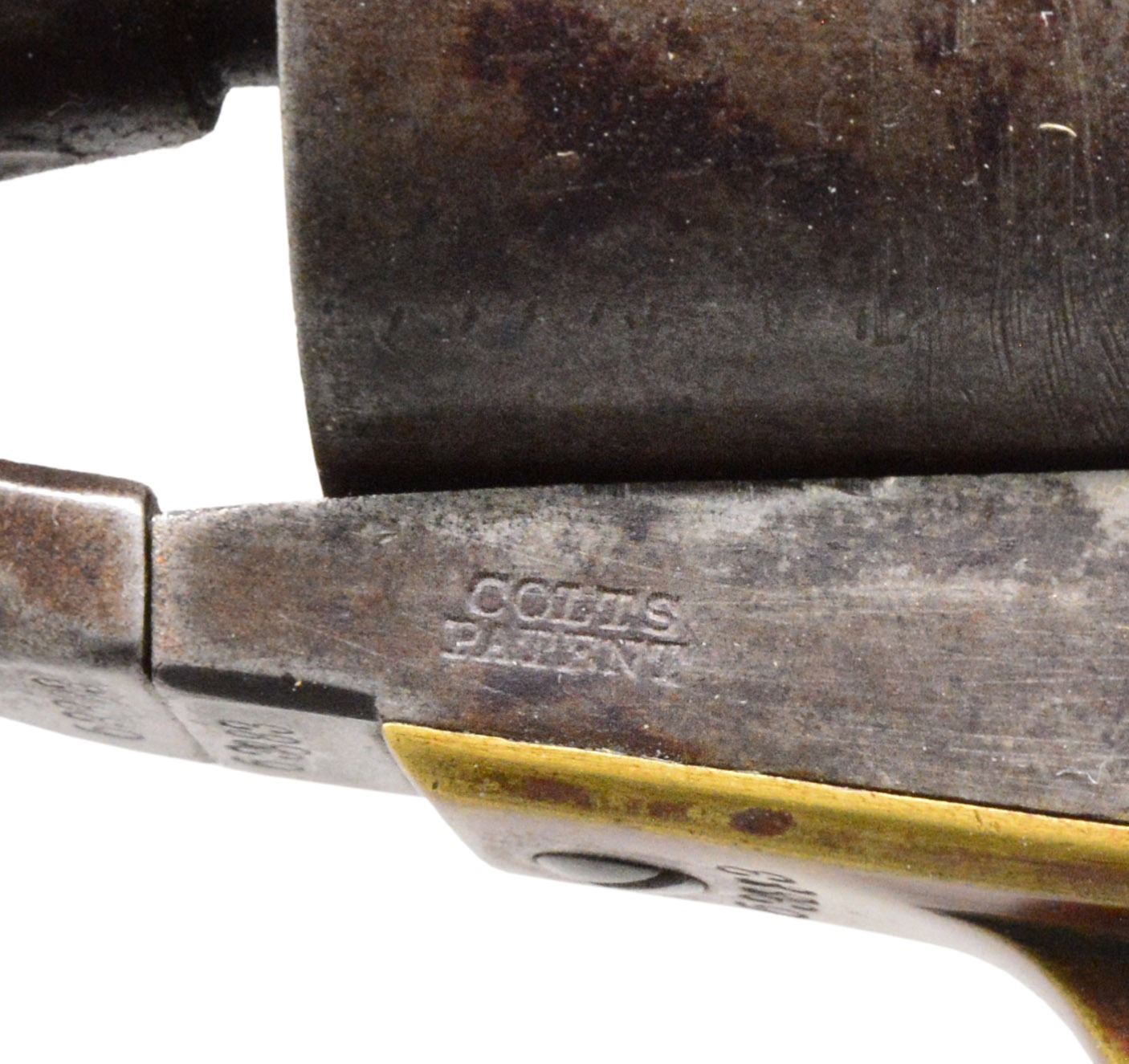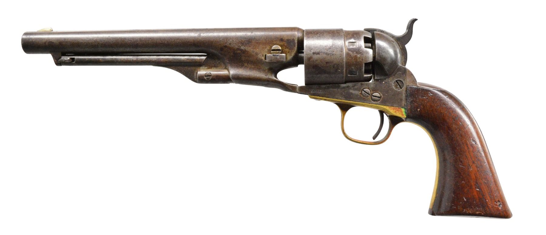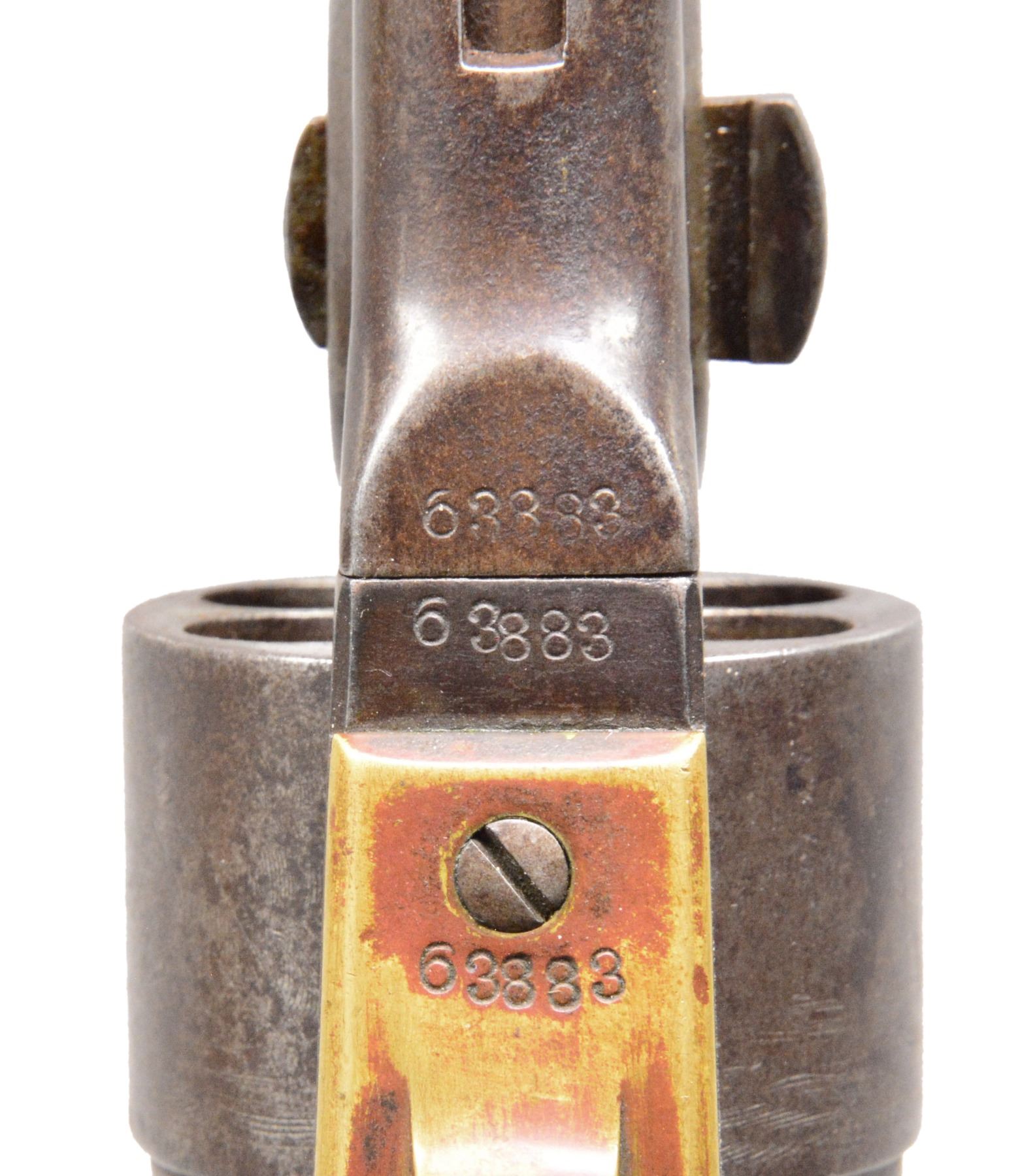 Cal. 44. S# 63883. Bbl. 8" rnd. w/ German silver blade front sight. 6 Shot roll engraved rebated cyl. Brass trigger guard. Front grip strap has "H" US inspection mark. Bbl., frame, trigger guard & cyl. have matching numbers. Wedge has mismatched number "9796". 1 Piece walnut grip w/ partially legible cartouche on right panel & remnants of cartouche on left panel. CONDITION: metal has faded to a mottled gray showing areas of pitting & corrosion. Grips show heavy wear & handling marks w/ chips at toe. Grips at butt have series of notches that appear to be intentionally hand cut. Dark lightly pitted bore retaining intact rifling. (01-17120/DS). ANTIQUE. $1,000-1,500.