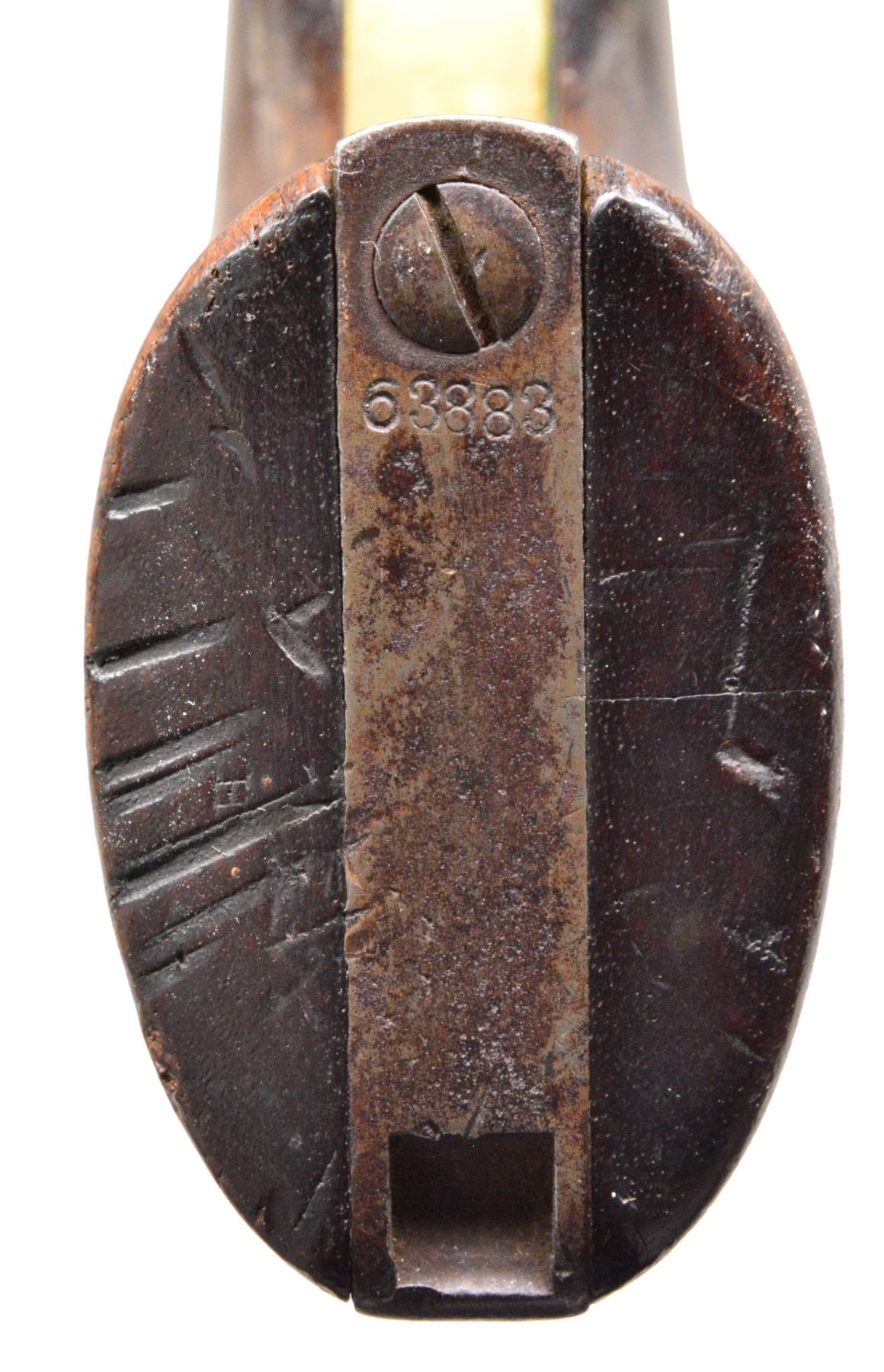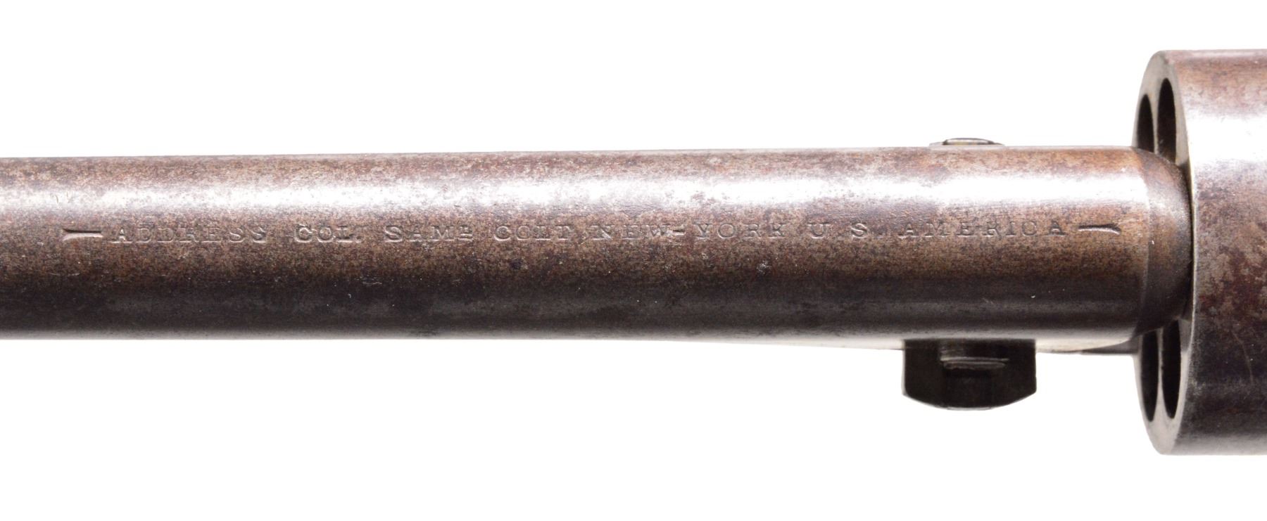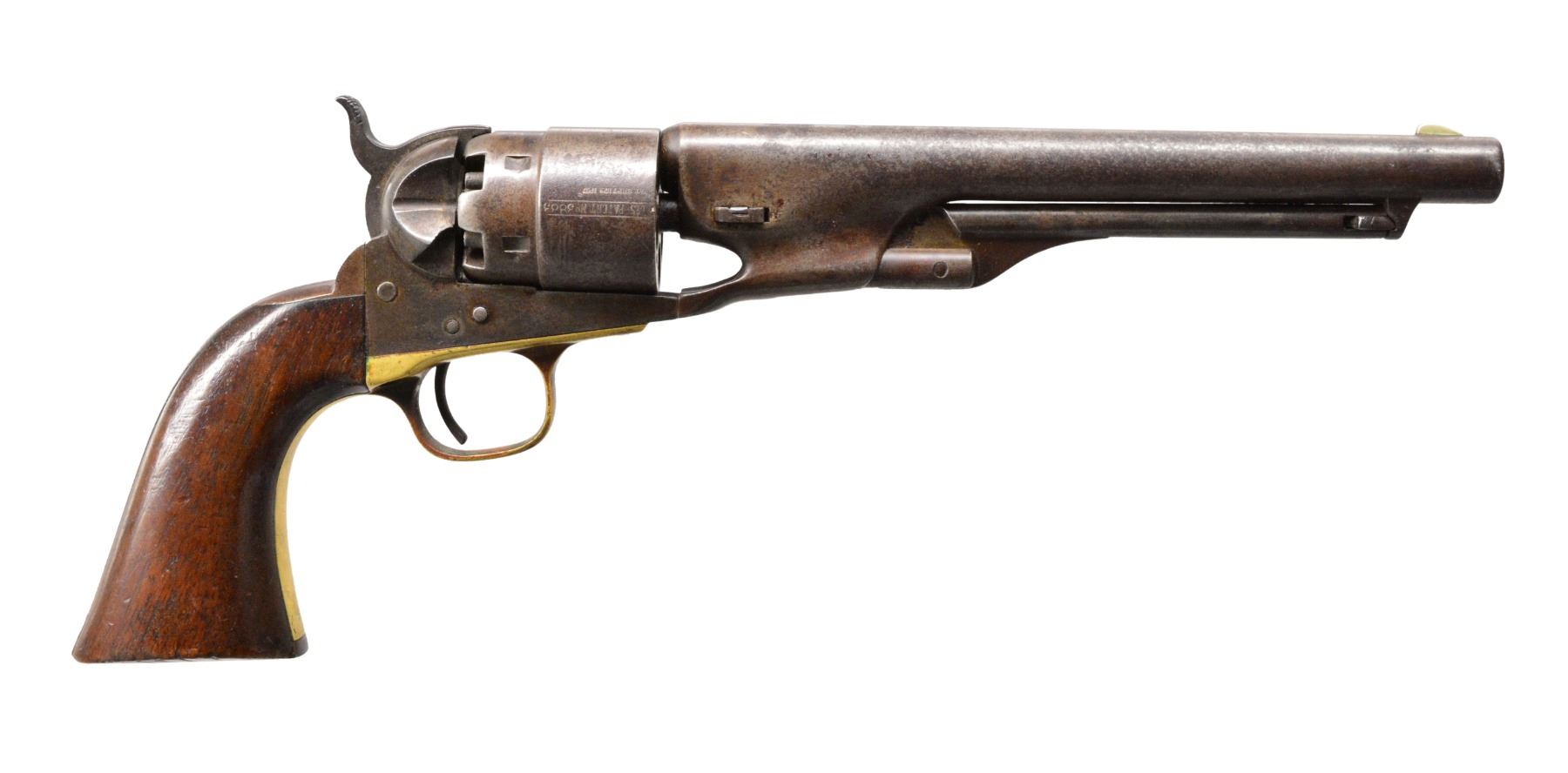 Cal. 44. S# 63883. Bbl. 8" rnd. w/ German silver blade front sight. 6 Shot roll engraved rebated cyl. Brass trigger guard. Front grip strap has "H" US inspection mark. Bbl., frame, trigger guard & cyl. have matching numbers. Wedge has mismatched number "9796". 1 Piece walnut grip w/ partially legible cartouche on right panel & remnants of cartouche on left panel. CONDITION: metal has faded to a mottled gray showing areas of pitting & corrosion. Grips show heavy wear & handling marks w/ chips at toe. Grips at butt have series of notches that appear to be intentionally hand cut. Dark lightly pitted bore retaining intact rifling. (01-17120/DS). ANTIQUE. $1,000-1,500.