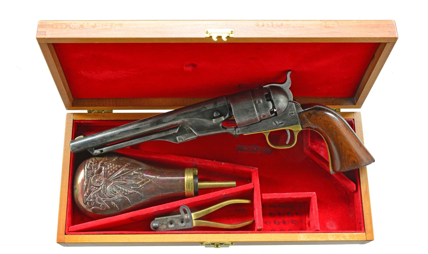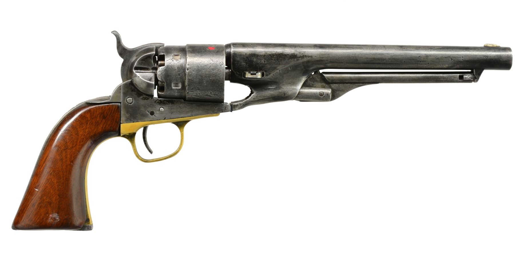 Cal. 44. S# 179821. Bbl. 8" in the standard configuration w/ one line address. Made in 1869 near the end of production of Colt Percussion firearms. UNATTACHED ACCESSORIES: modern wood case w/ a reproduction powder flask & two cavity mold, along w/ about 20 loose 44 cal. balls. CONDITION: fair overall. Bbl. frame & trigger guard have matching serial numbers, backstrap has re-engraved matching serial number, last three digits of serial number are seen on cyl., grips are heavily sanded & poorly fit, heavy muzzle wear, metal has been cleaned & recolored being an overall patchy gray/black w/ pitting, mechanics are sluggish w/ heavily pitted rifled bore. Case & accessories are good. (01-17405/JS). ANTIQUE. $800-1,200.