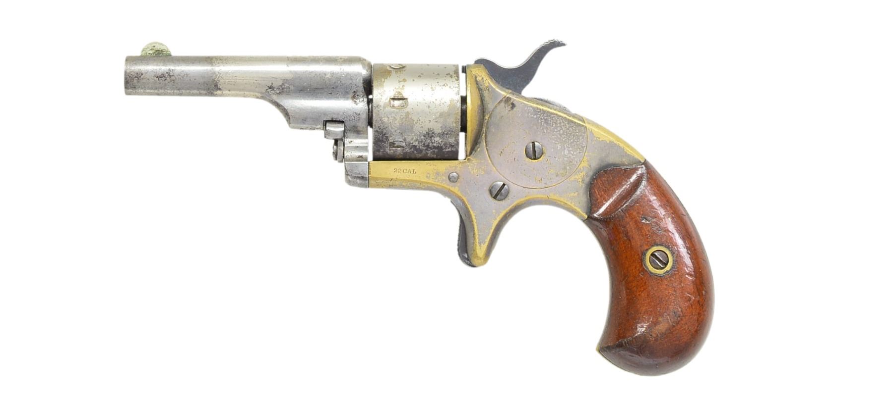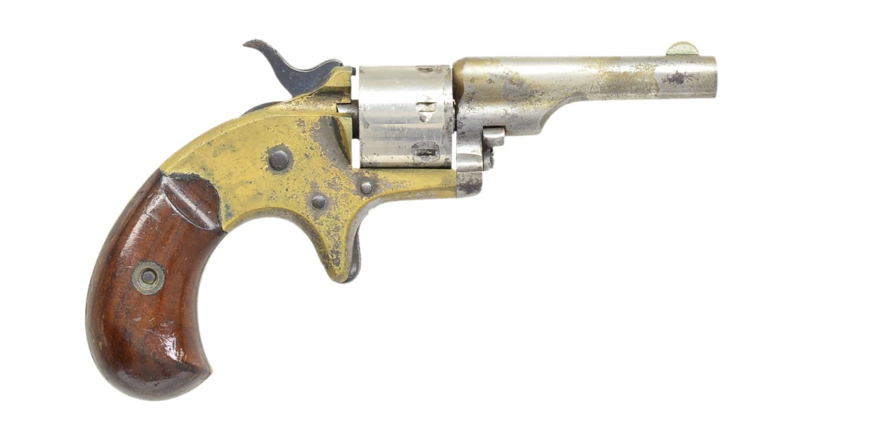 Cal. 22 S or L. S# 78069. Bbl. 2 3/8". 7 Shot rnd. cyl. Bbl. & cyl. have nickel finish. Silver finished brass spur trigger action w/ sloping hammer spur. 2 Piece walnut bird's head grips. CONDITION: bbl. & cyl. retain 40% nickel w/ spots of flaking, corrosion & light pitting. Action retains 25% silver finish on right side & bottom of frame w/ left side of brass frame showing dark patina. Grips show finish wear & handling marks. Bore retains worn rifling w/ some very light pitting. (01-17433/DS). ANTIQUE. $250-350.