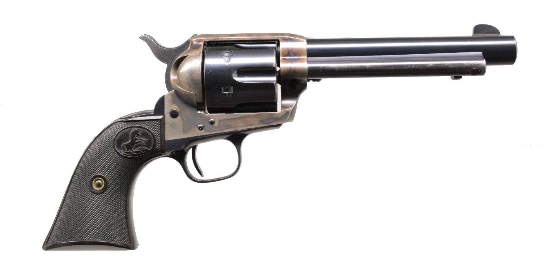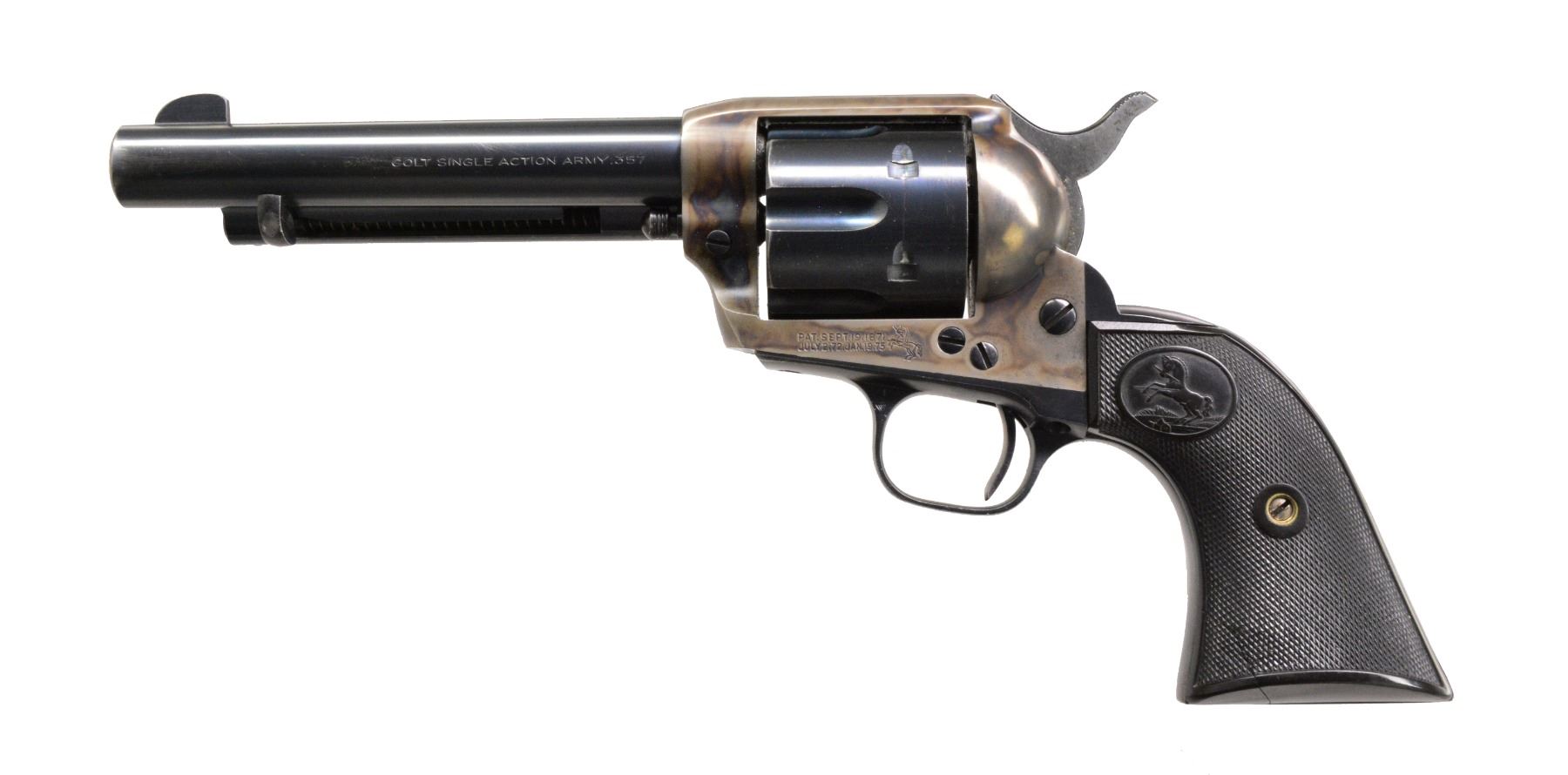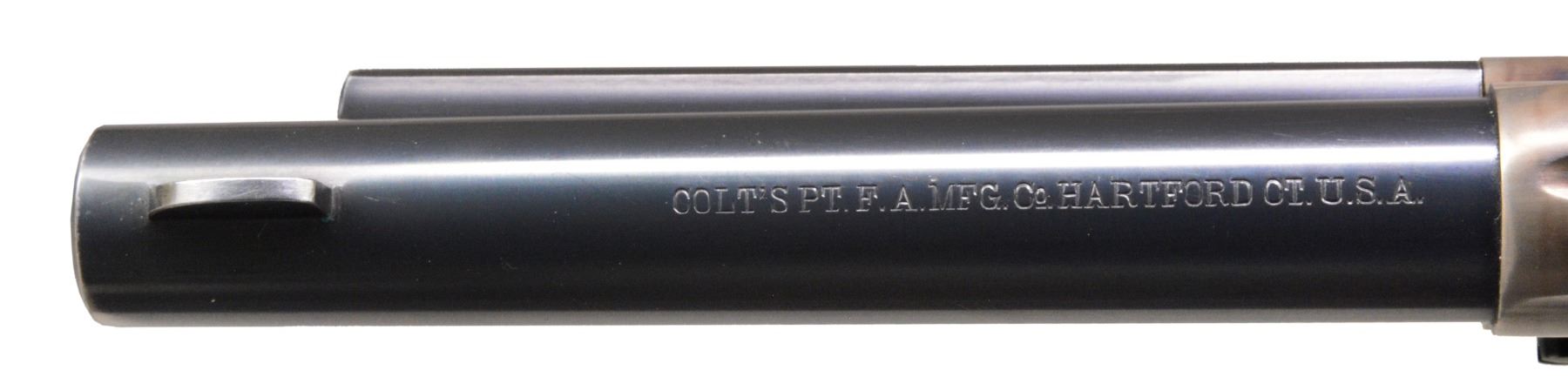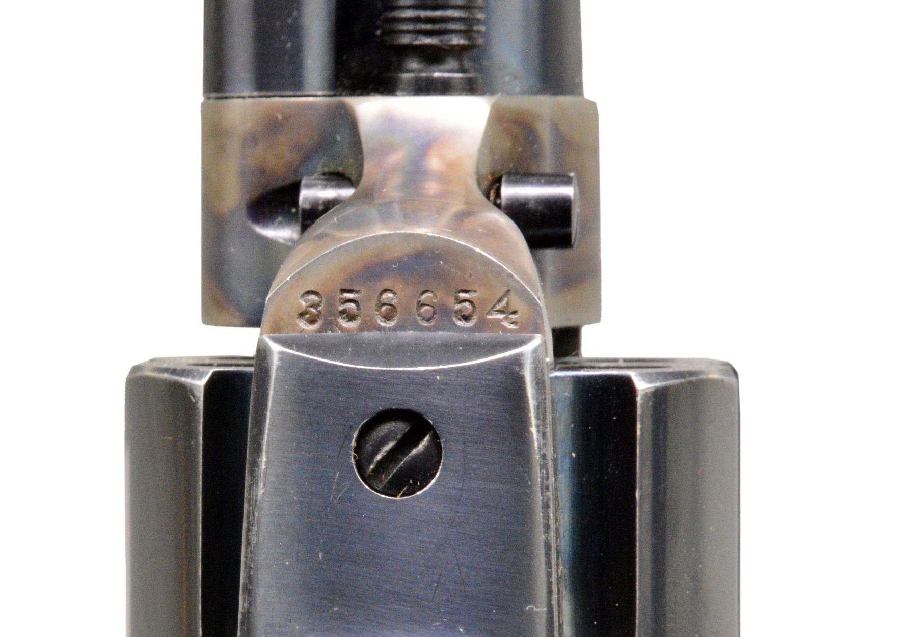 Cal. 357 Mag. S# 356654. Bbl. 5 1/2" w/ single line Hartford address. Blue & case colored finish. Left side of trigger guard & backstrap are numbered "356654" matching number on bottom of frame. Rear face of 6 shot fluted cyl. is marked w/ "54", last 2 digits of S#. Left side at front of trigger guard bow is marked "4" over "VP" triangle marking. Unmarked 2 piece checkered hard rubber Rampant Colt grips. Mfg. 1939. CONDITION: frame retains over 90% lightly faded case colors w/ wear & sm. spots of freckling on left bolster. Loading gate has fading case colors w/ sm. area of very light corrosion. Sides of hammer show spots of darkened appearance. Bbl. retains 90% blue showing light wear & silvering at muzzle. Cyl., grip straps & ejector housing retain over 70% blue showing spots of fading, edge wear & sm. handling marks. Front sight shows evidence of slight lowering. Grips show very light wear, right panel is chipped & glued at toe. Bore is bright w/ sound rifling. (20-24/DS). CURIO. $7,000-10,000.