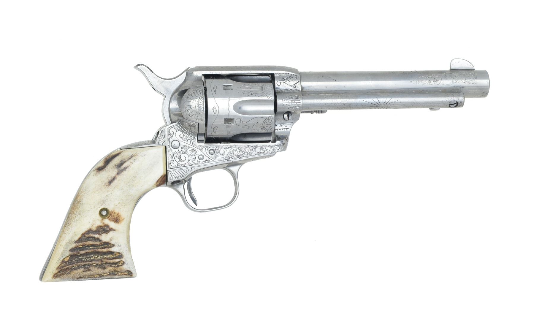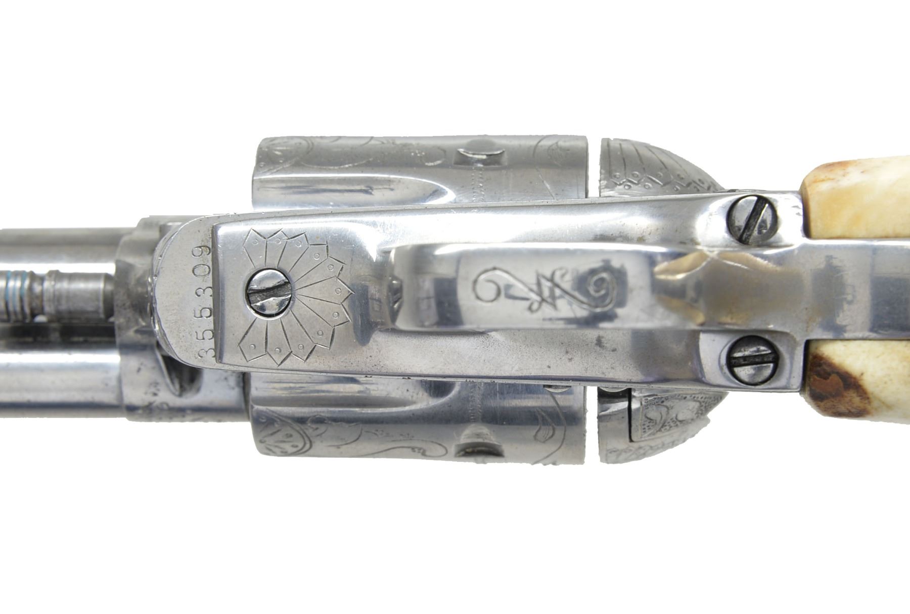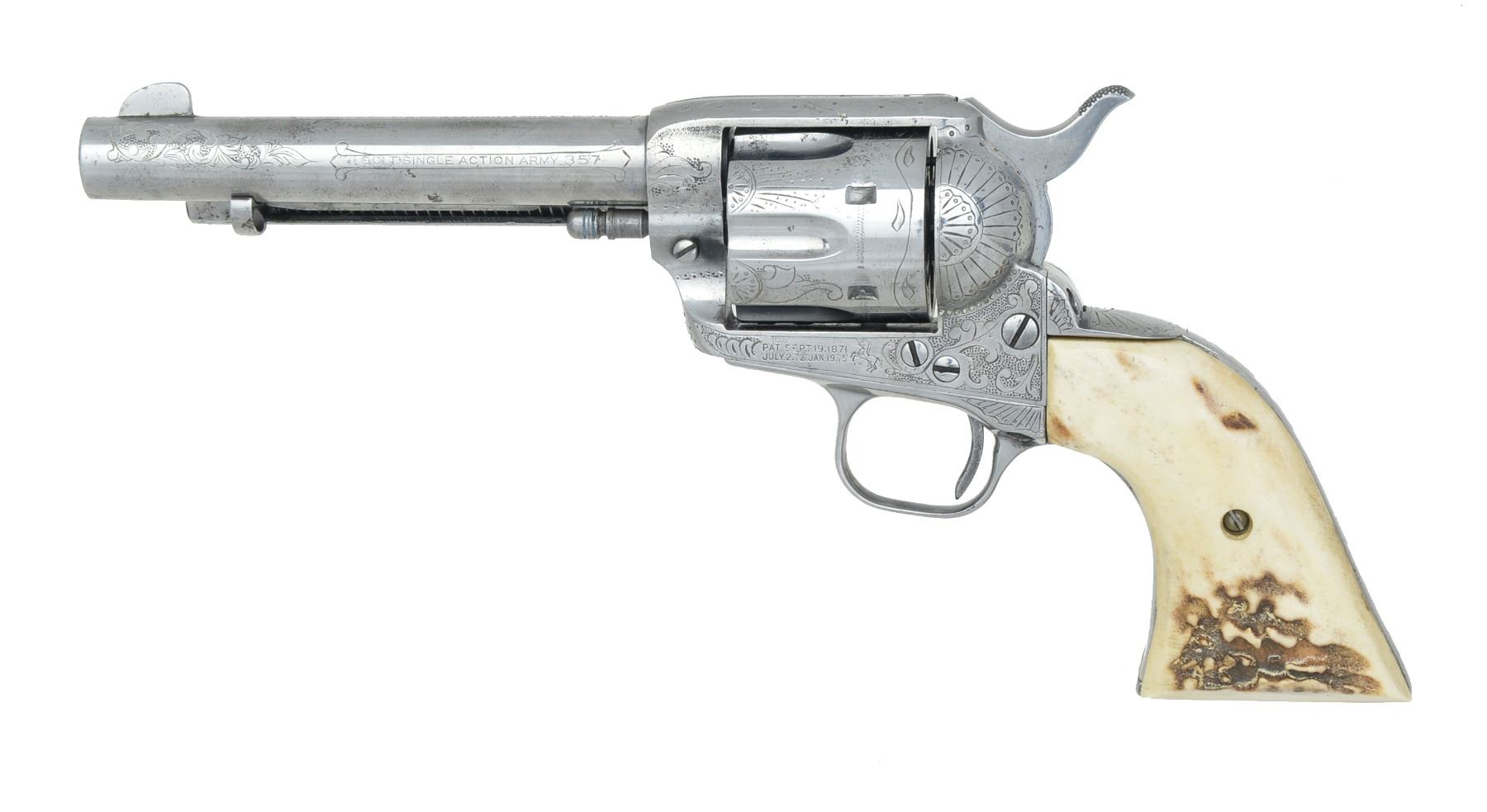 Cal. 357 Mag. S# 355309. Bbl. 5 1/2" w/ standard Hartford address. 6 Shot fluted cyl. w/out visible S# marking. Frame, bbl., grip straps & ejector housing have added custom aftermarket scroll engraving w/ punch dot backgrounds. Trigger guard has S# markings removed. Inside of backstrap is restamped to match gun. 2 Piece Ajax stag grips. Mfg. 1936. CONDITION: metal has bright finish showing sm. spots of light pitting. Very good grips. Bbl. is generally bright w/ intact rifling showing a shallow ring bulge approx. 1" from muzzle. (20-25/DS). CURIO. $4,000-6,000.