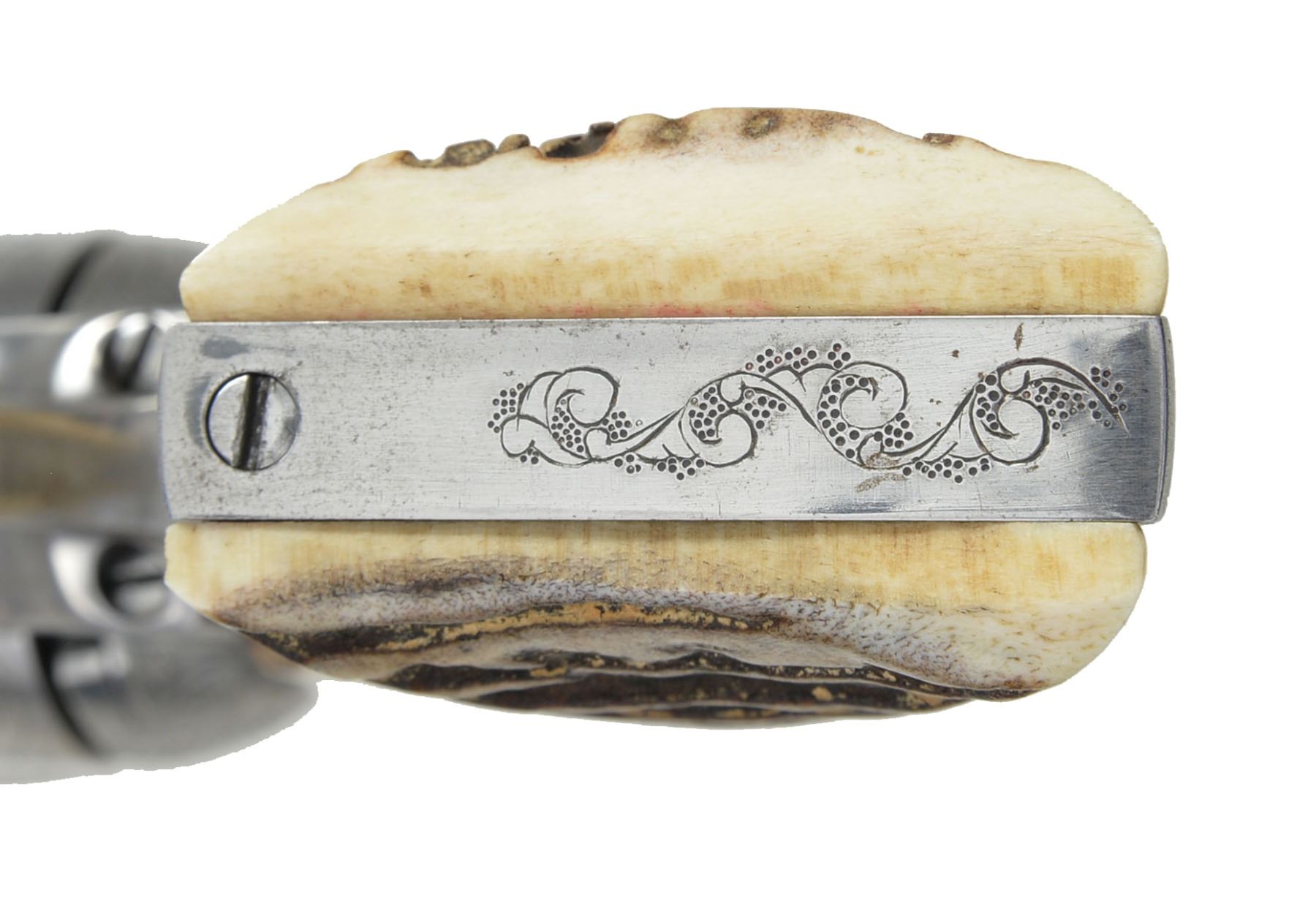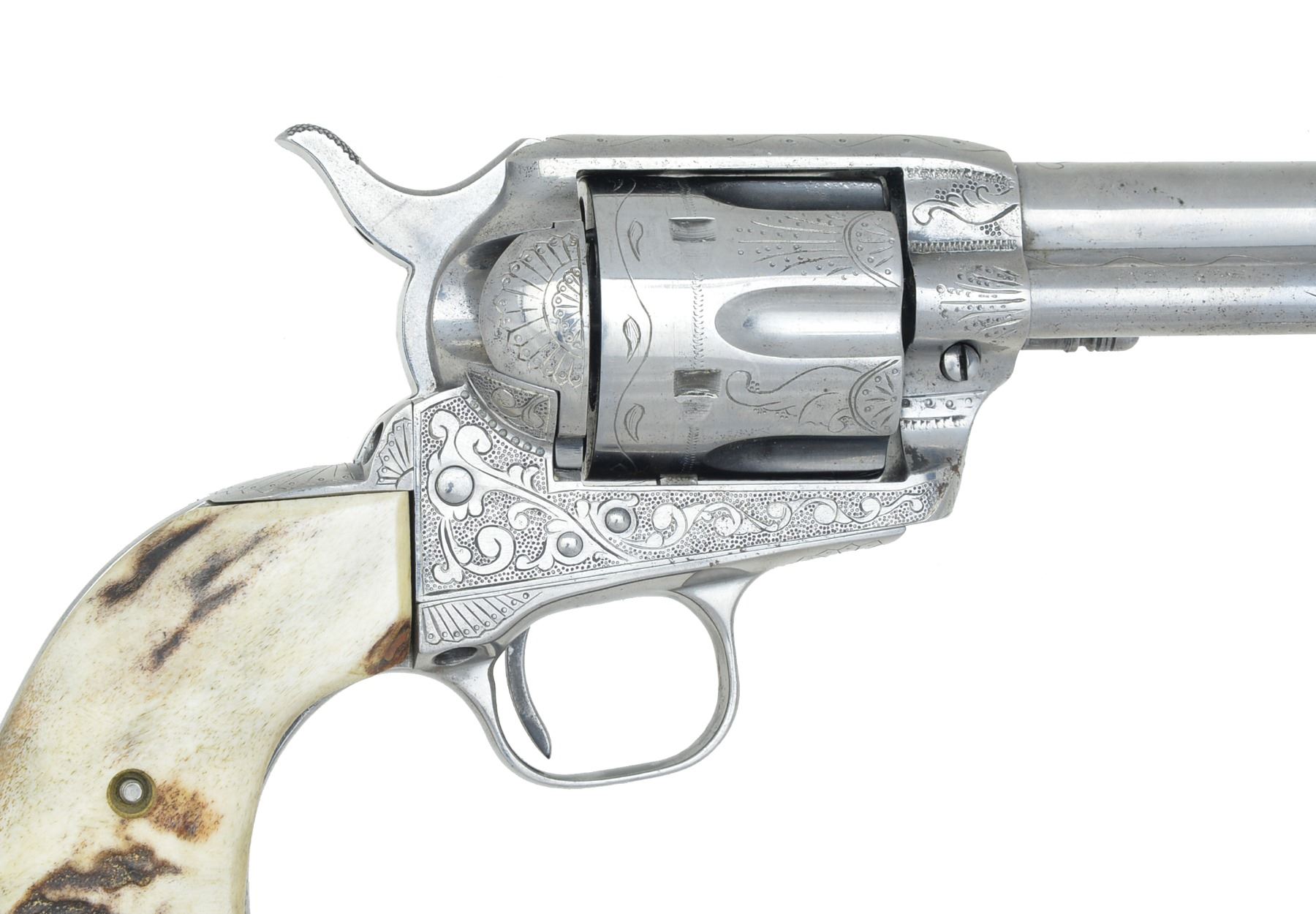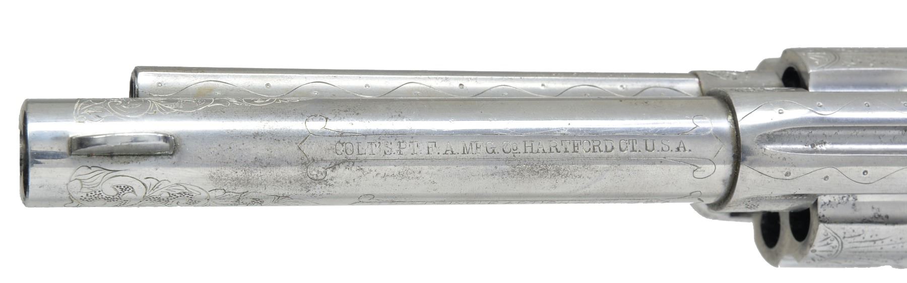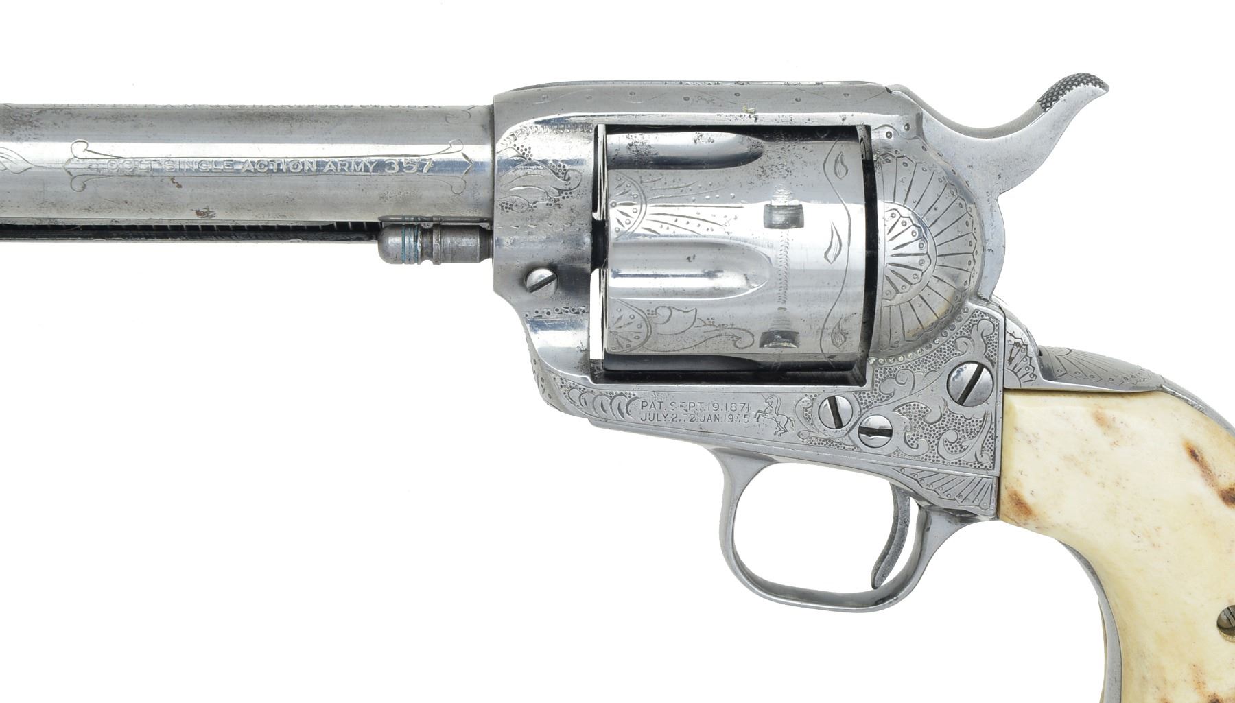 Cal. 357 Mag. S# 355309. Bbl. 5 1/2" w/ standard Hartford address. 6 Shot fluted cyl. w/out visible S# marking. Frame, bbl., grip straps & ejector housing have added custom aftermarket scroll engraving w/ punch dot backgrounds. Trigger guard has S# markings removed. Inside of backstrap is restamped to match gun. 2 Piece Ajax stag grips. Mfg. 1936. CONDITION: metal has bright finish showing sm. spots of light pitting. Very good grips. Bbl. is generally bright w/ intact rifling showing a shallow ring bulge approx. 1" from muzzle. (20-25/DS). CURIO. $4,000-6,000.