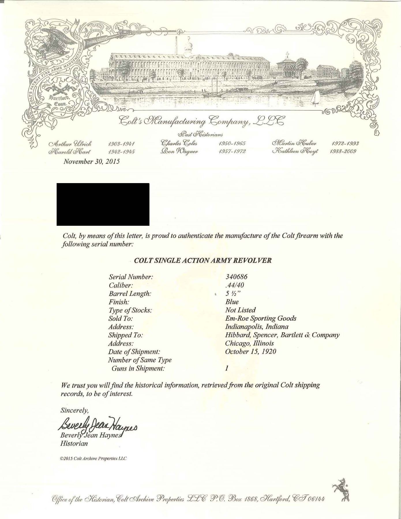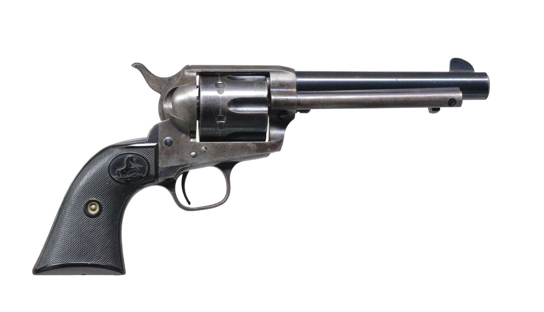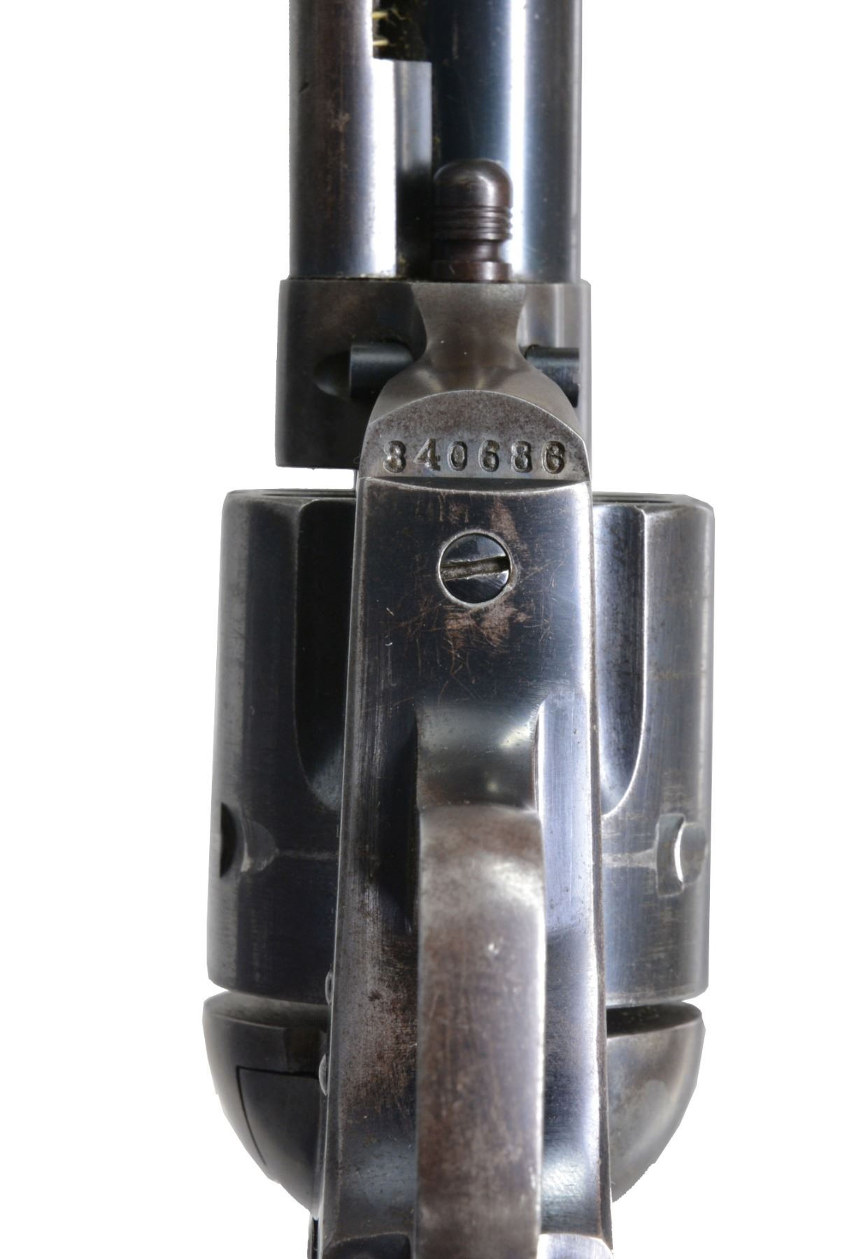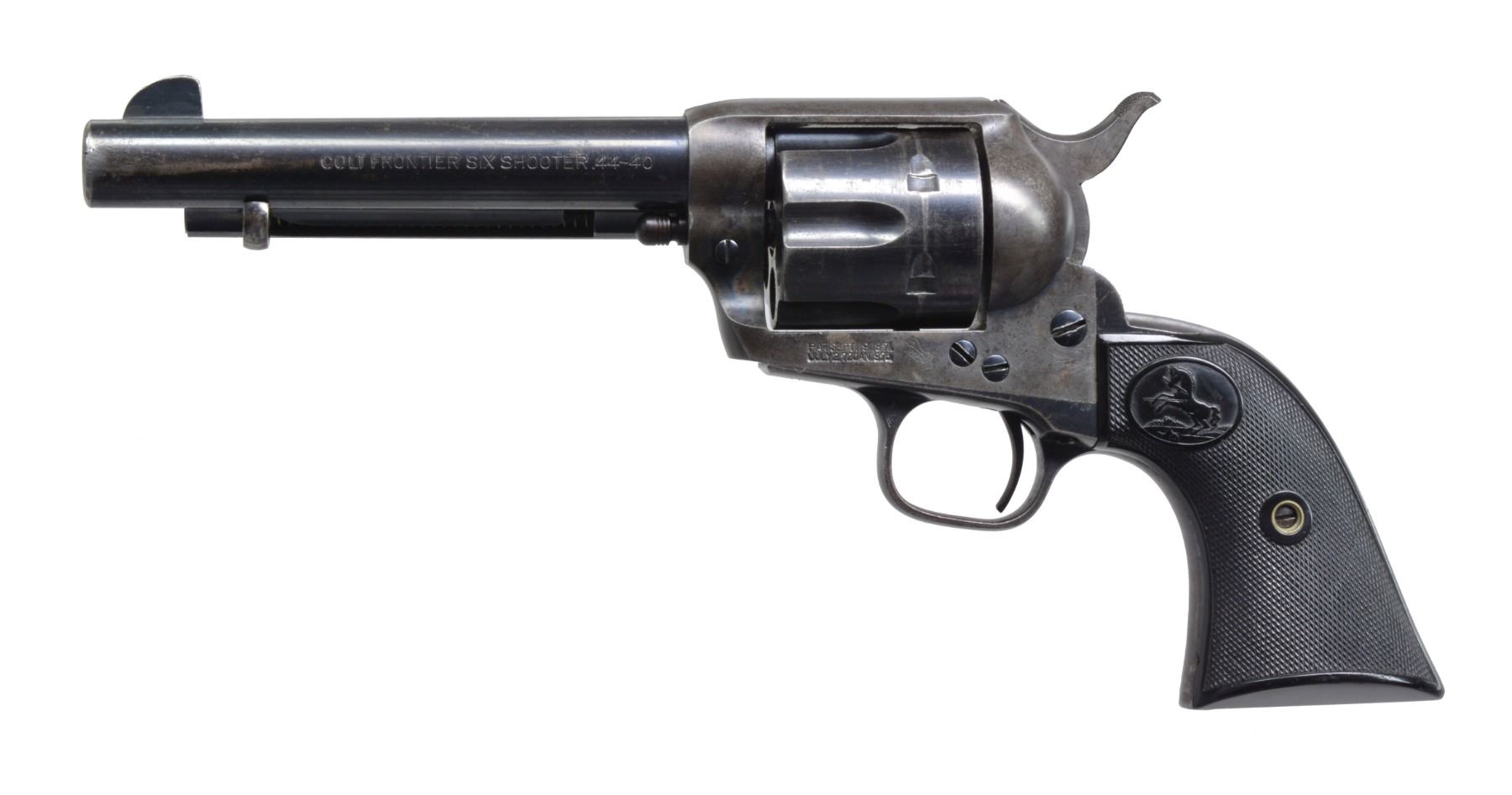 Cal. 44-40. S# 340686. Bbl. 5 1/2" bbl. Top of bbl. is marked w/ Colt Co. address. Left side of bbl. marked "COLT FRONTIER SIX SHOOTER 44-40". Black checkered hard rubber grips. Mfg. October 15, 1920. UNATTACHED ACCESSORIES: authenticity factory letter provided with gun from company. CONDITION: good; bbl. retains most of original blue w/ minor muzzle wear. Ejector housing is worn w/ blend of gray & brown patina. Frame has dark original case colors visible in protected areas. Cyl. has original blue w/ faint turn ring wear on front edge. Bore is good w/ minor scattered thinning. Colt grips are very good. (19-4339/BT). CURIO. $3,000-5,000.