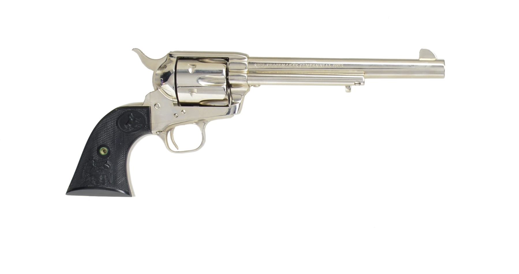 SHOOTER SAA REVOLVER. Cal. 44-40. S# 1023PC. Bbl. 7 1/2" w/ etched panel style "COLT FRONTIER SIX SHOOTER" caliber marking. Blade front sight. Six shot fluted cyl. Full nickel finish. 2 Piece checkered plastic Eagle grips. Limited Edition of 1,500 mfg. in 1975. UNATTACHED ACCESSORIES: leather covered Peacemaker Centennial case w/ brown velour fitted interior. Case lid features portrait of Sam Colt. Plague commemorates the 100th anniversary of the 44-40 "Frontier Six Shooter". Interior case lid shows sm. tears & wear spots. CONDITION: near new, retaining over 99% finish showing a faint cyl. drag line. Near excellent bore. (20-165/DS). CURIO. $2,000-3,000.