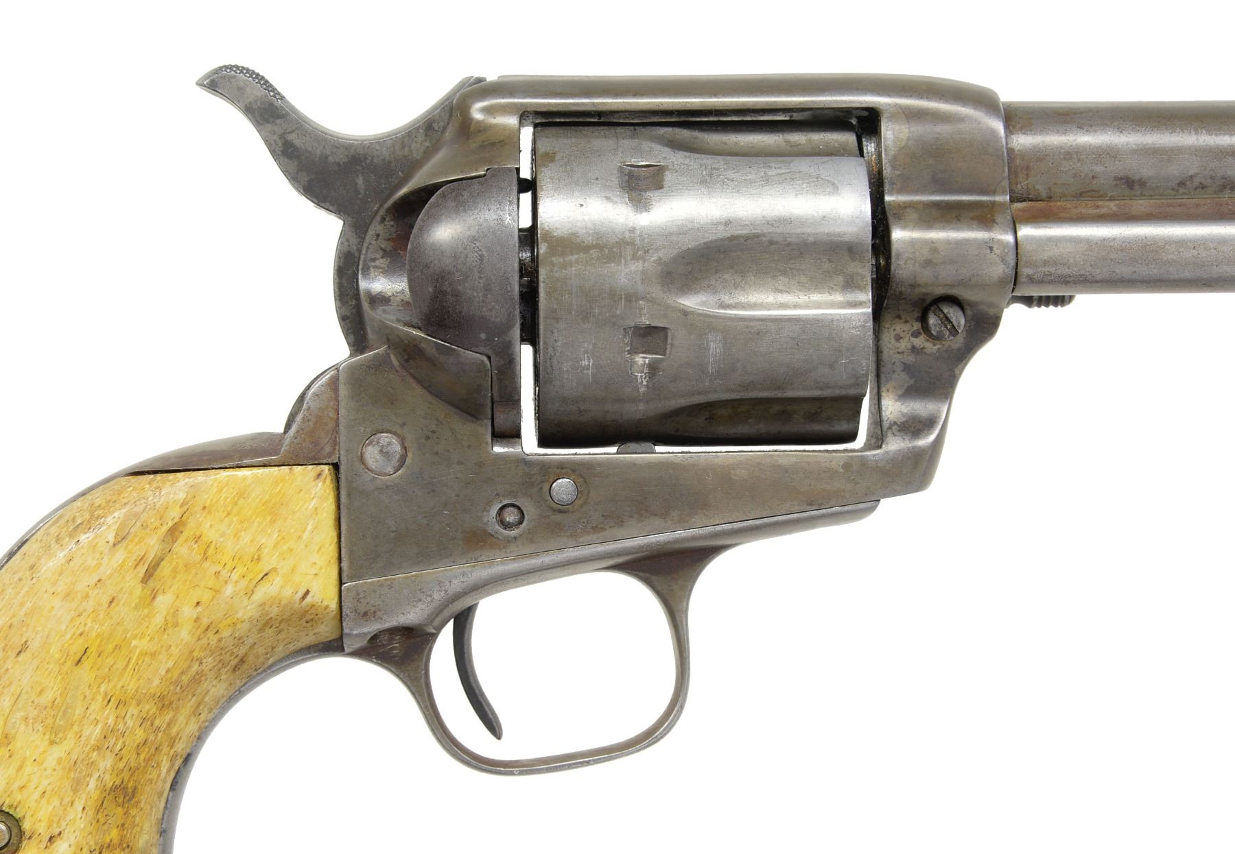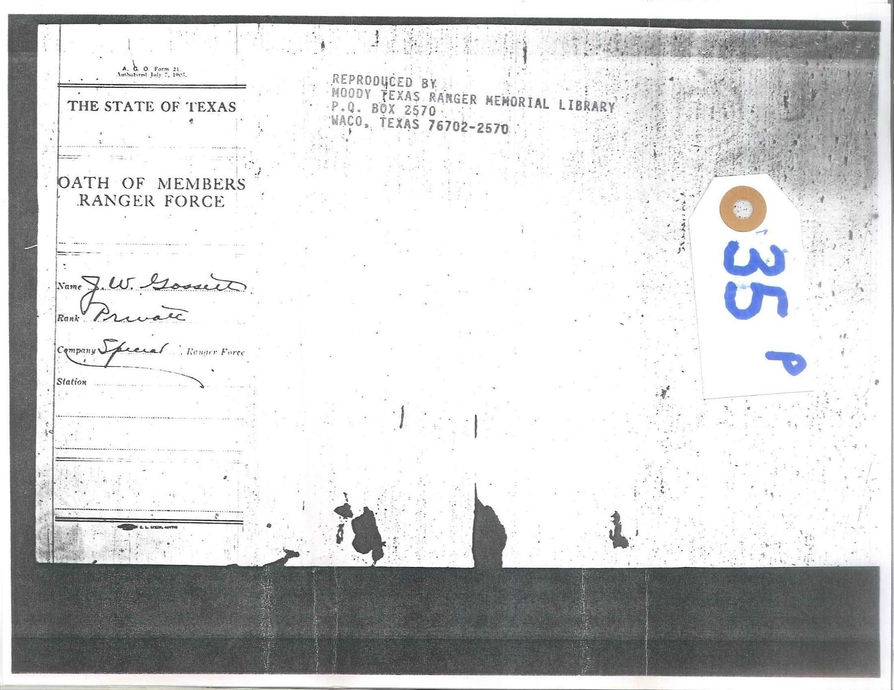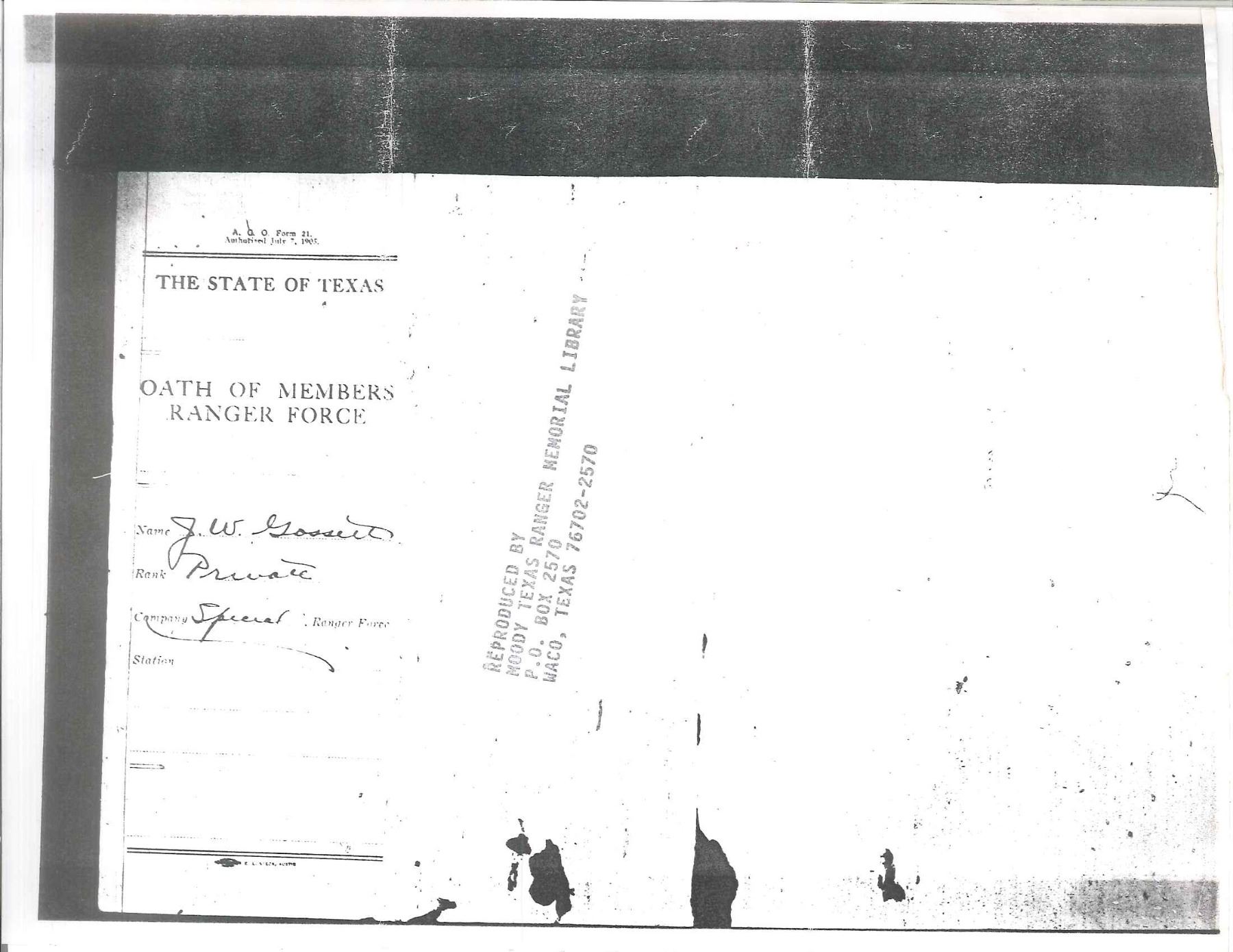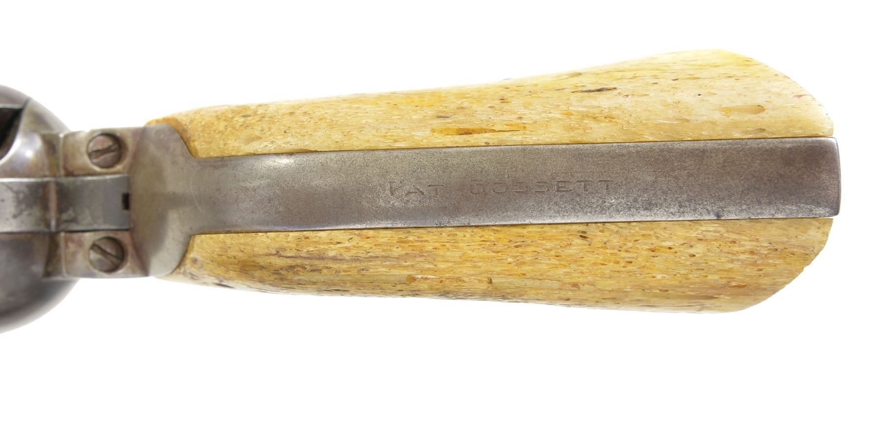 Cal. 45 Colt. S# 341735. Inscribed on backstrap “PAT GOSSETT” in block letters. UNATTACHED ACCESSORIES: factory letter confirms configuration as 45 cal and 5 1/2" bbl. originally shipped to Belknap Hardware, Louisville, 1921. Copies of Oath of Service & description in Ranger force from 1918 accompany for J. W. Gossett, Rockwall, TX. We can not find a TX Ranger with the name "Pat" Gossett on any relation to Ranger J.W. Gossett". CONDITION: good overall, gray patina w/ traces of nickel. Bbl. address is new marking. Mechanics are crisp, good rifled bore. (20-231/JS). CURIO. $2,000-3,000.