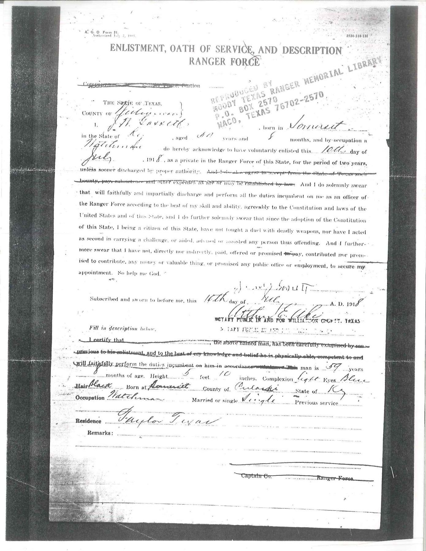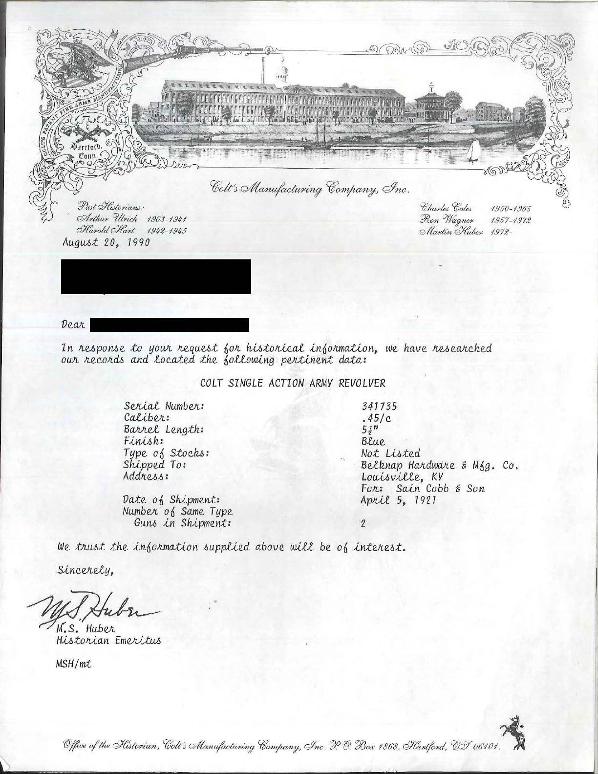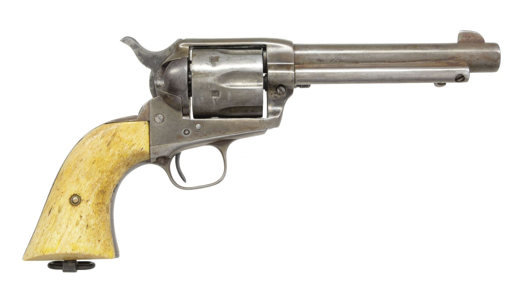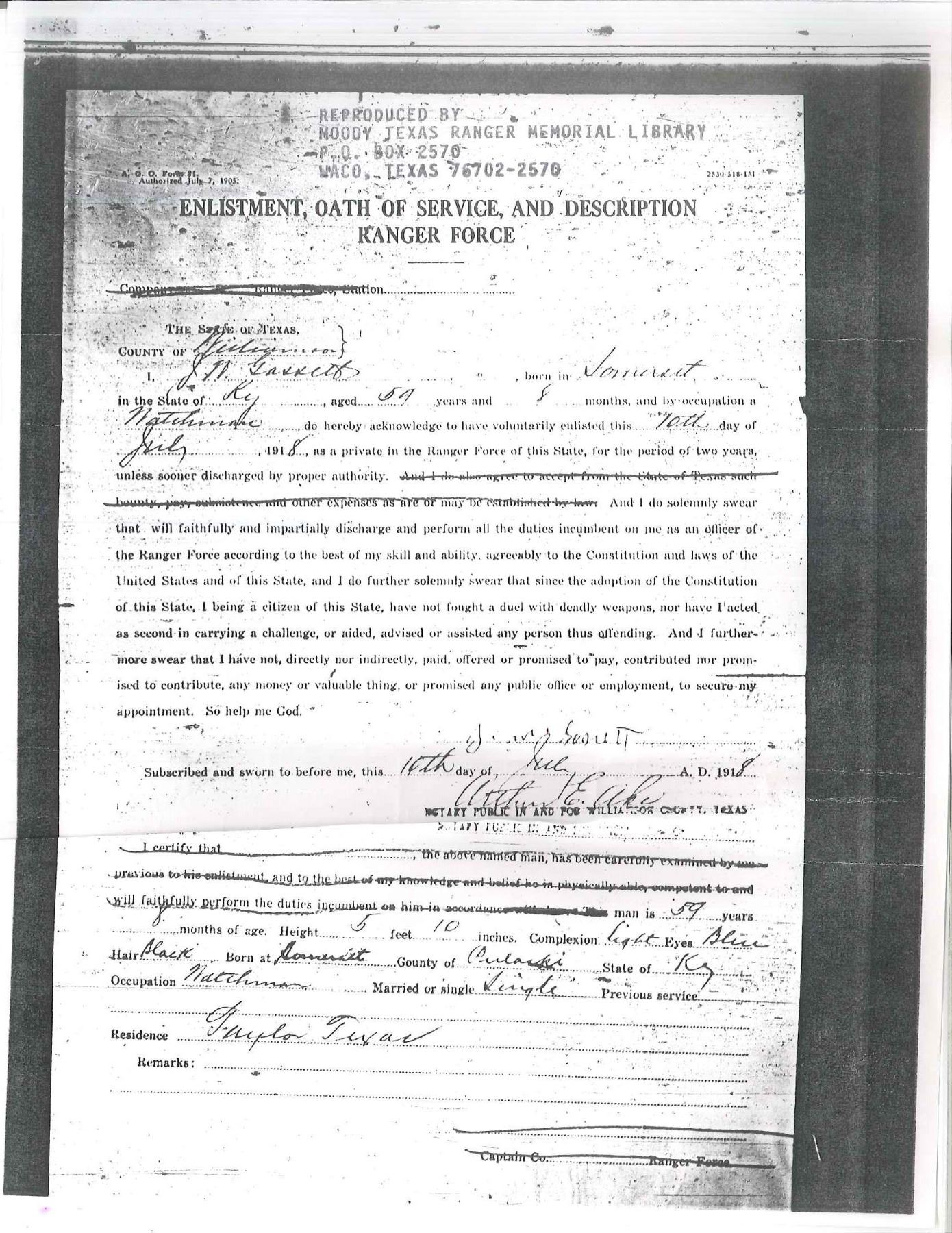 Cal. 45 Colt. S# 341735. Inscribed on backstrap “PAT GOSSETT” in block letters. UNATTACHED ACCESSORIES: factory letter confirms configuration as 45 cal and 5 1/2" bbl. originally shipped to Belknap Hardware, Louisville, 1921. Copies of Oath of Service & description in Ranger force from 1918 accompany for J. W. Gossett, Rockwall, TX. We can not find a TX Ranger with the name "Pat" Gossett on any relation to Ranger J.W. Gossett". CONDITION: good overall, gray patina w/ traces of nickel. Bbl. address is new marking. Mechanics are crisp, good rifled bore. (20-231/JS). CURIO. $2,000-3,000.