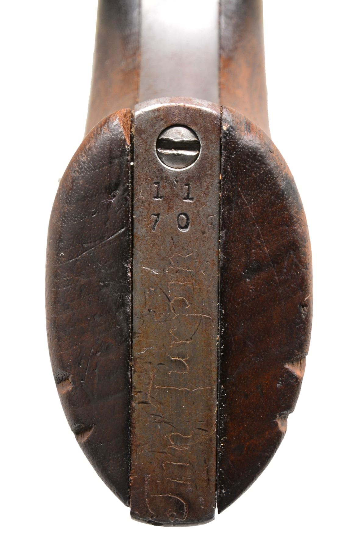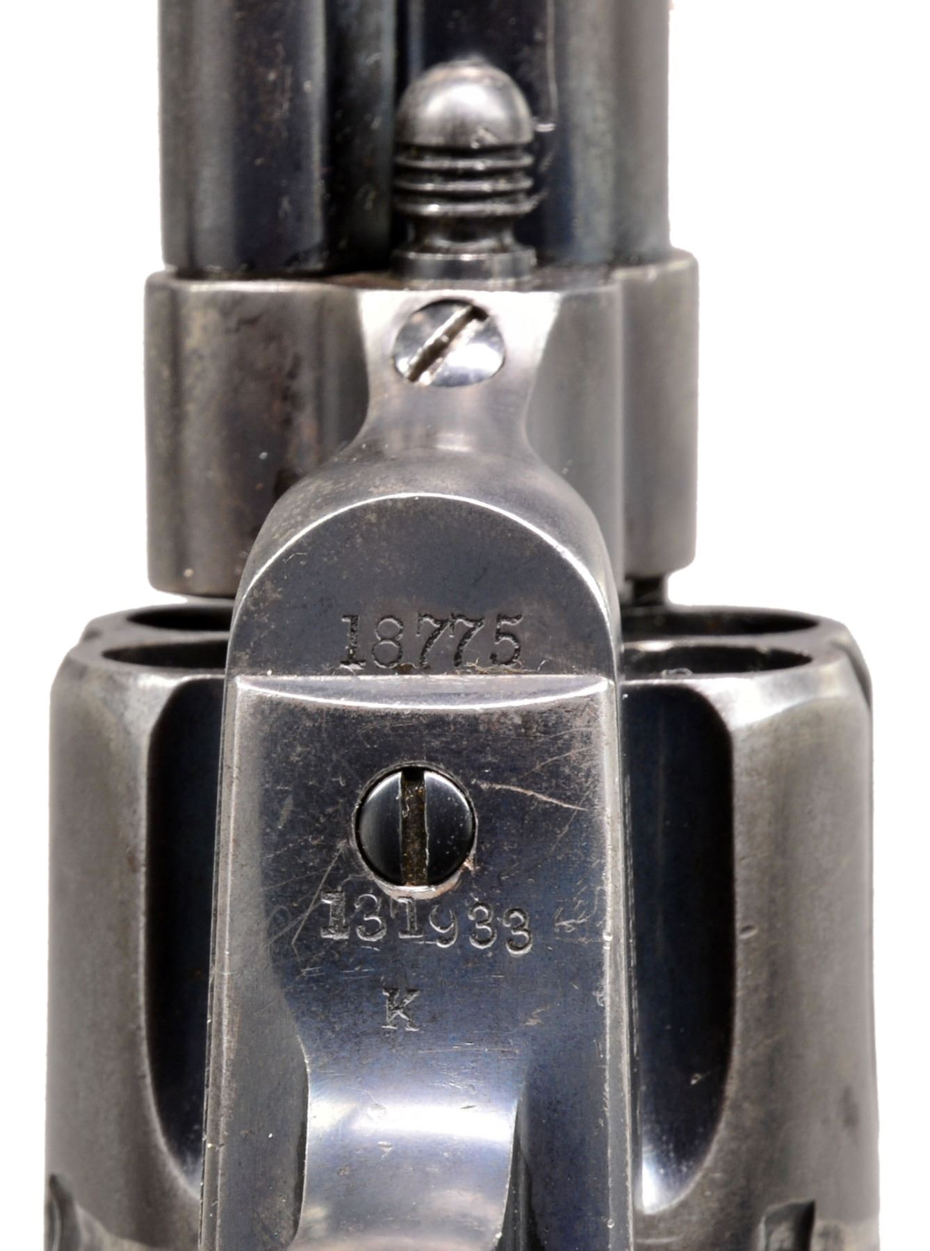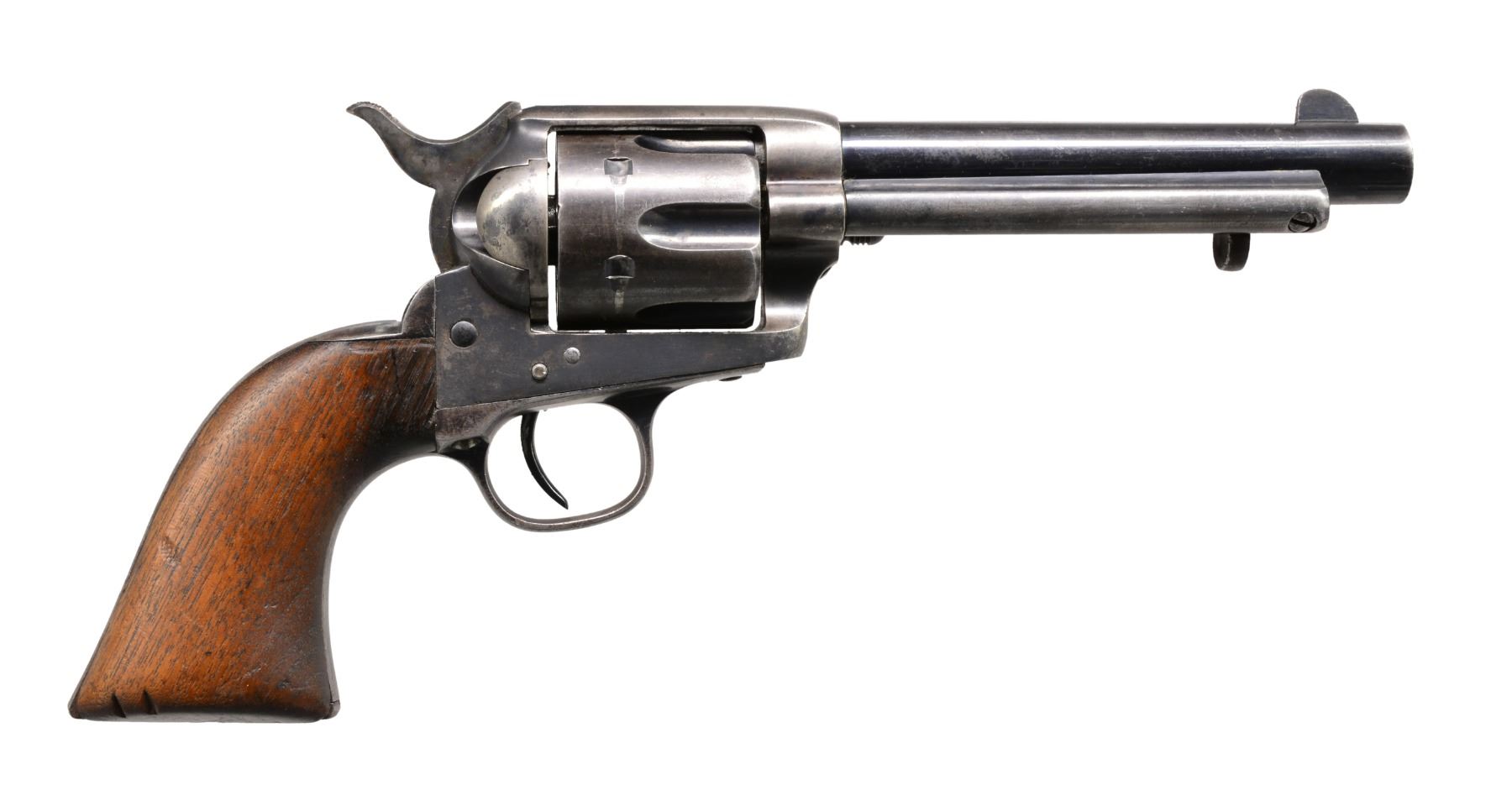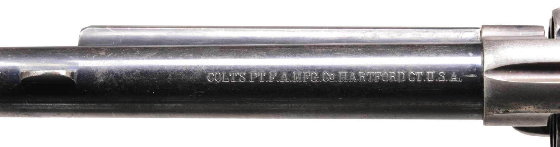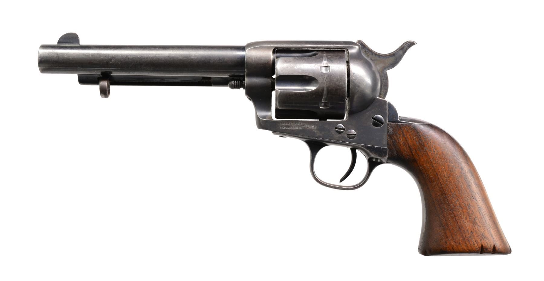 "JIM TURPIN" INSCRIBED. Cal. 45. S# 18775 (frame). Blue & color case hardened w/ 5 1/2" bbl., full front sight & 1 line block letter address. Left side of frame has 2 line, 3 patent dates & "U.S". Mounted w/ 1 piece walnut grip w/ no cartouche or inspection. Buttstrap is inscribed “JIM TURPIN” in period style. Frame is numbered "18775". Trigger guard is numbered "131933" & buttstrap "1170". Cyl. has partial indiscernible number w/ inspection “K” on rear face, & bbl. is 8300 w/ inspection “P”. Grip is not numbered & has “BILLY B” crudely carved in channel. Ejector housing has bulls eye ejector rod head & has dimpled ends to arbor. CONDITION: about fine, numbers as noted above. Bbl. retains about 50-60% glossy original blue w/ most of the losses on each side of the muzzle, thinning on the left side. Ejector housing retains bright blue in the gullets, worn to bare metal on the outer radius. Frame & hammer retain strong traces of bright & muted case colors, balance overall silver/blue patina. Trigger guard & backstrap retain traces of blue w/ the balance a grey/brown patina. Cyl. retains bright blue in the flutes w/ the outer diameter a thin blue/grey patina. Grip is sound showing moderate edge wear w/ 2 notches on right side. Mechanics are crisp, bright shiny bore. (01-17276/JS). ANTIQUE. $2,000-3,000.