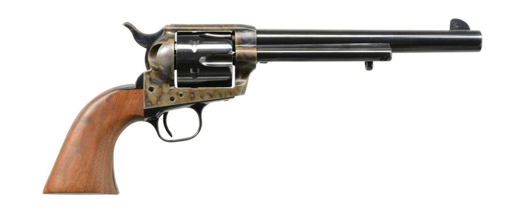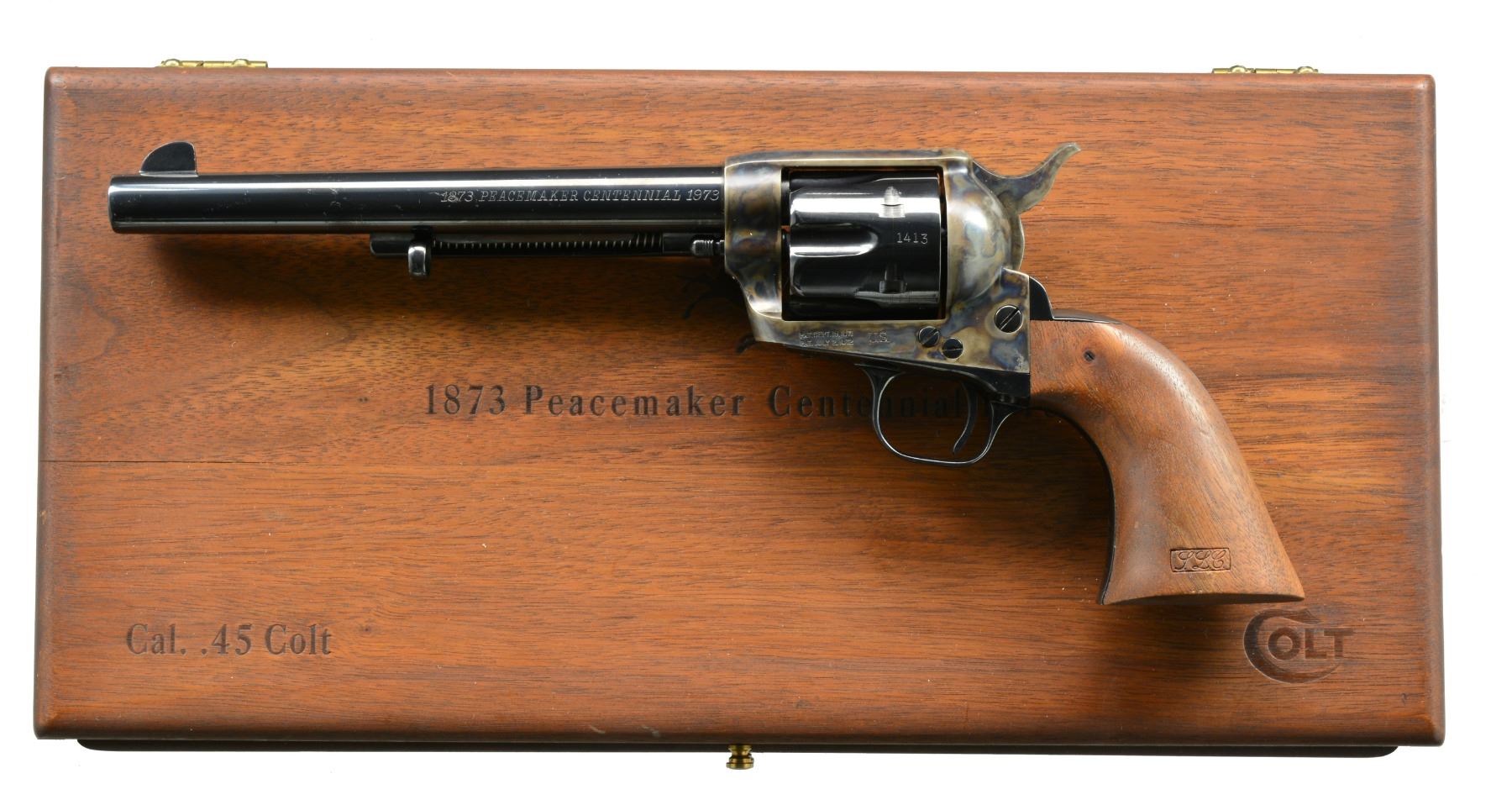 Cal. 45 Colt. S# PC1413. Bbl. 7 1/2" w/ "1873 PEACEMAKER CENTENNIAL 1973" on left side & standard Colt markings on top. 1,500 Mfg. in 45 Colt plus 1,500 in 44-40 each starting w/ number 501 at $300 each or $625 as a set numbered 1-500. Case colored black powder frame w/ balance Royal blue. Matching numbered cyl., loading gate, trigger guard & backstrap. Satin finished 1 piece walnut grip w/ cartouche at lower left. UNATTACHED ACCESSORIES: near excellent, attractive satin finished walnut presentation case w/ hinged lid exposing glass topped display of revolver encased in removable drawer; no key. Drawer section w/ dark maroon velvet shadow line insert plus informative plaque. Top of case w/ laser engraved Colt embellishments. CONDITION: generally very good to excellent original appearance. Grip mfg. w/ slight pin knot at top of left side. Very faint hint of turn line on cyl. Left side & bottom of bbl. forward of ejector housing w/ light scratches plus from "1873" forward; most visible scratch is through "1873". Appears unfired w/ balance solidly near excellent including bore. (20-699/NW). CURIO. $1,500-2,000.