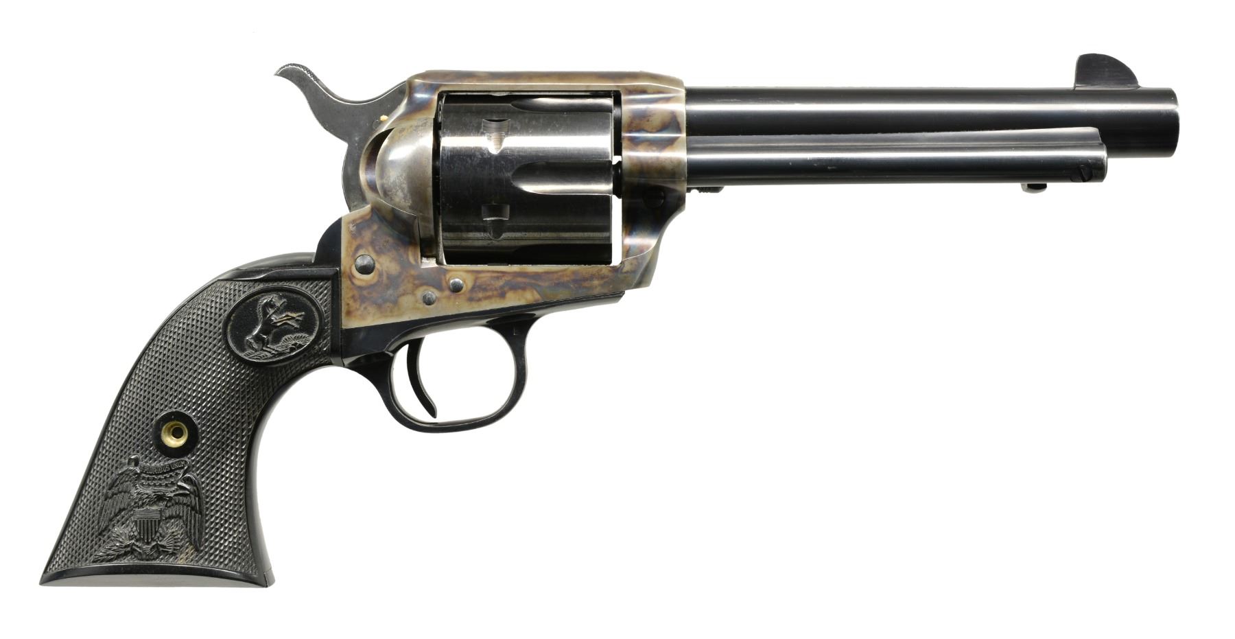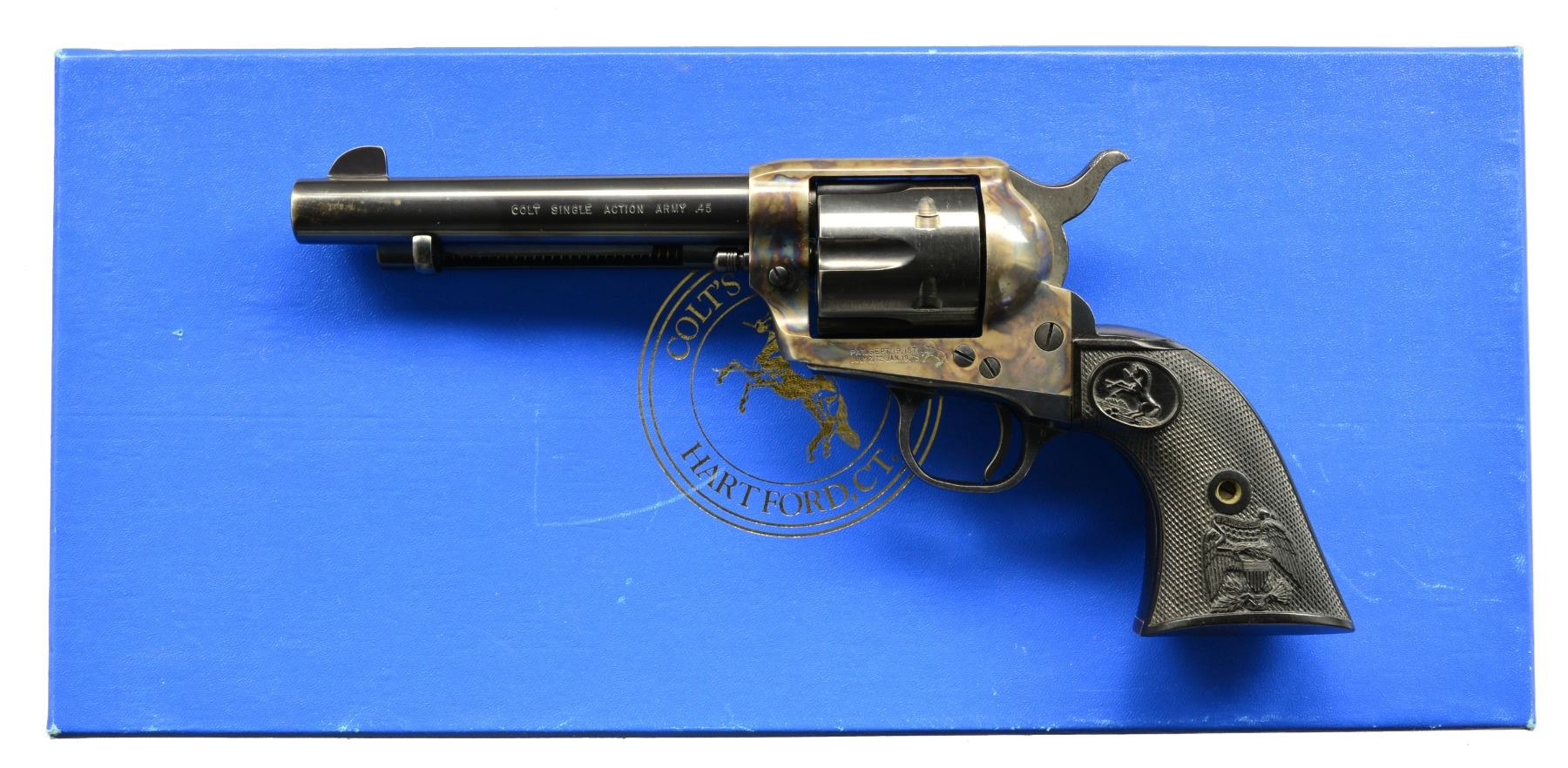 Cal. 45 LC. S# 57377SA. Bbl. 5 1/2”. Mfg. 1970 in most classic configuration of case colored frame w/ balance blued having black checkered grips w/ eagle & rampant Colt designs. Matching numbered cyl. & grips. UNATTACHED ACCESSORIES: blue Colt cardboard box w/ packaging; very slight scuffs on lid. CONDITION: overall very good appearance w/ faint muzzle wear, occasional sm. marks, faint staining on sides of hammer, pinprick oxidation on cyl. & minimal firing residue. Near excellent bore & grips. (20-322/NW). MODERN. $1,000-1,600.