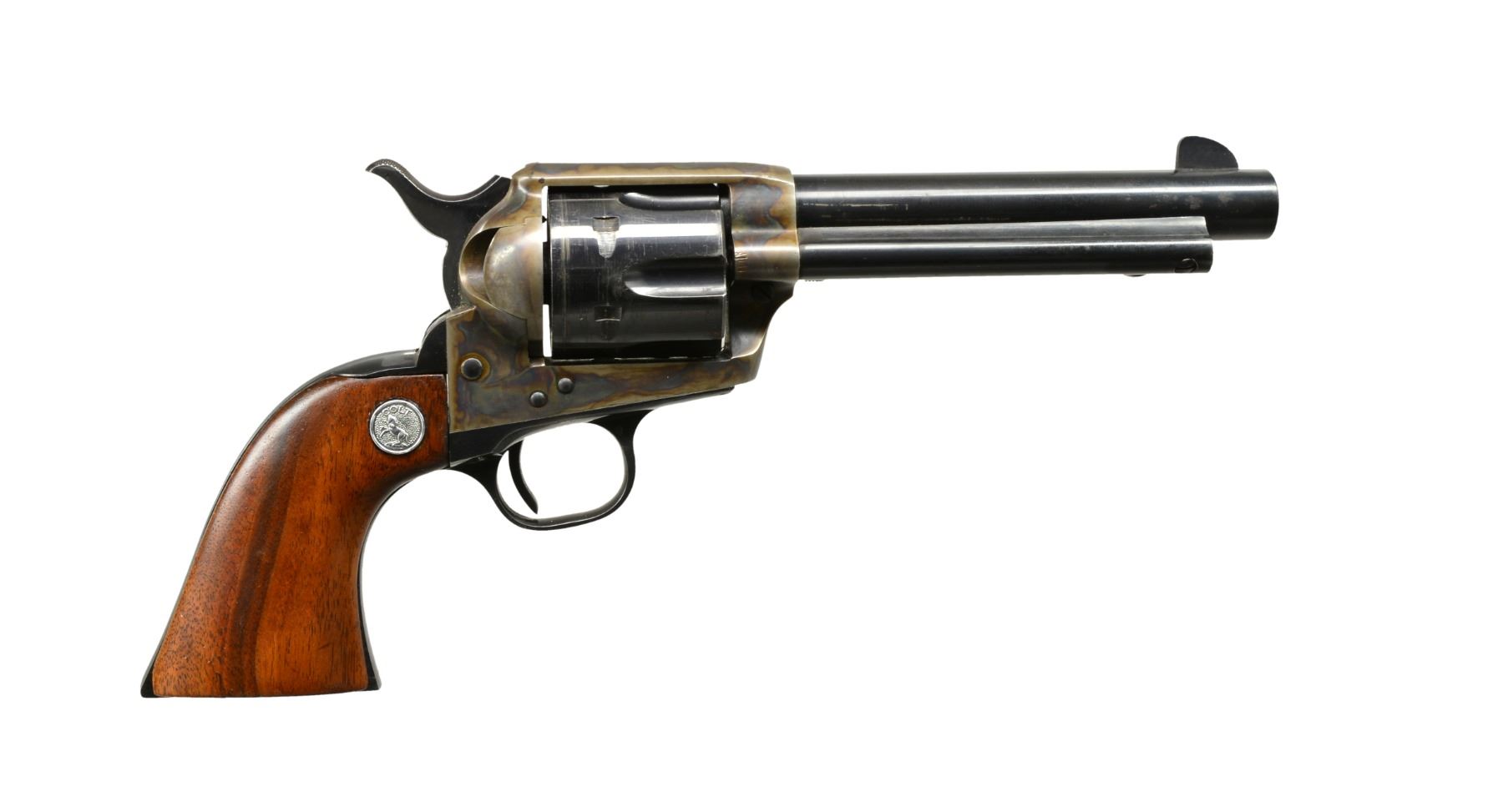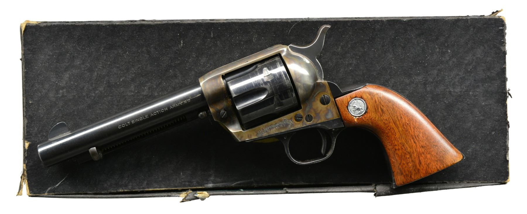 Cal. 45 Colt. S# 20834SA. Bbl. 5 1/2". Six shot fluted cyl. Blued & case colored finish. 1 Piece undersized aftermarket walnut grips w/ added rampant Colt medallions. Mfg. 1958. UNATTACHED ACCESSORIES: 4 additional Colt SA bbls.: 1 cal. 45 Colt 12" Buntline Special, 1 cal. 45 Colt 7 1/2", 1 cal. 45 Colt 5 1/2" & 1 cal. 44-40 "Frontier Six Shooter" marked 4 3/4". 1 Spare 45 Colt cyl. 1 Set of aftermarket wood grips. 1 Daisy Mfg. Co. Ojala holster. 1 Piece black box w/ torn side & end flaps. CONDITION: bbl. retains 85% blue showing spots of corrosion w/ drag lines around cyl. Frame retains 90% lightly faded case colors showing spots of corrosion. Breech end of bbl. in front of frame shows wrench marks. Heavily sanded undersized grips have sm. chips around Colt medallions. Buntline Special bbl. shows spots of surface corrosion & retains bright bore w/ sharp rifling. 7 1/2" Bbl. has 95% blue & bright bore showing wrench marks. 5 1/2" Bbl. shows wrench marks, 70% blue w/ spots of pitting & very good bore. Frontier Six Shooter bbl. is reblued, showing spots of surface corrosion & lightly pitted bore. Spare cyl. shows 95% blue. (19-5967/DS). CURIO. $900-1,200.