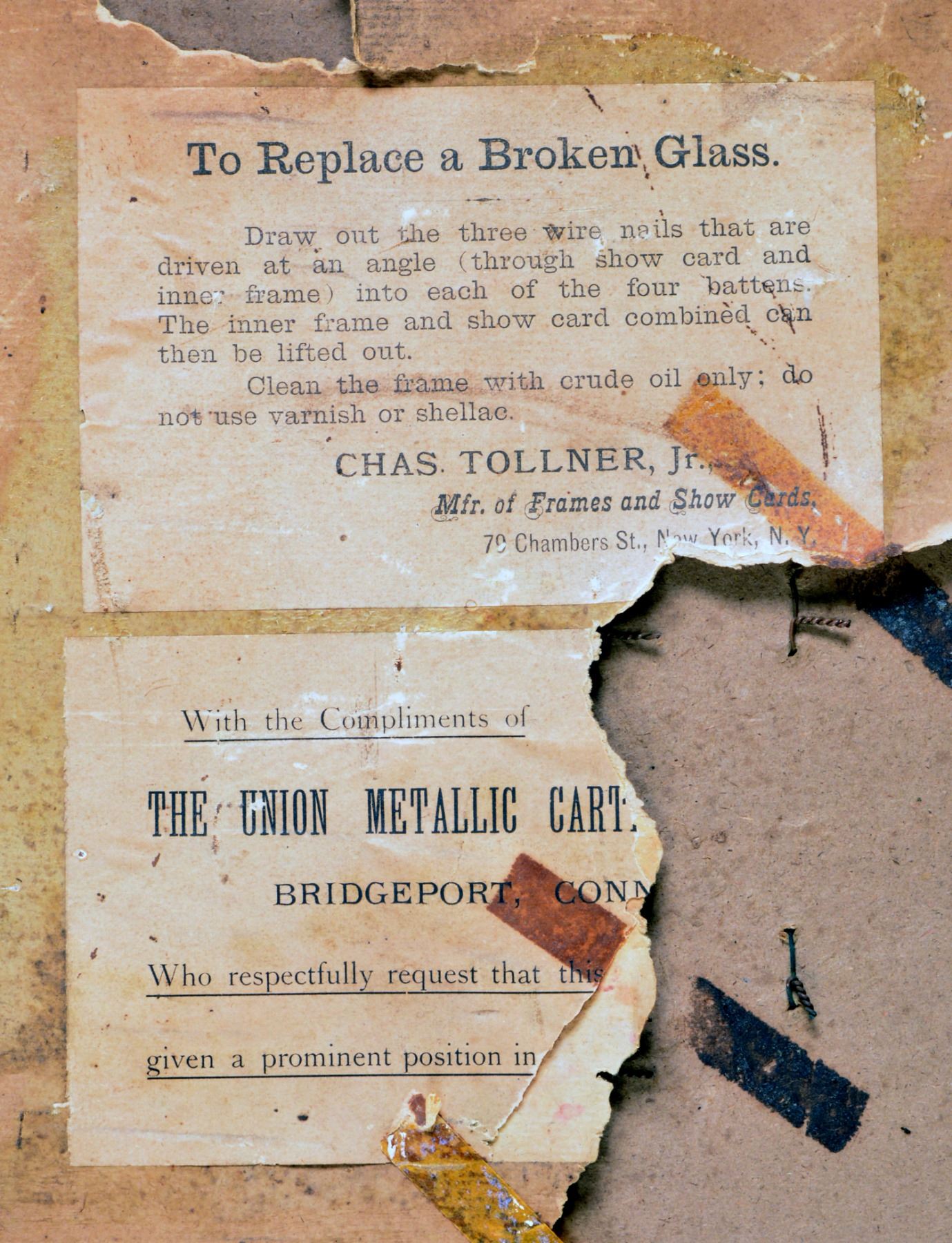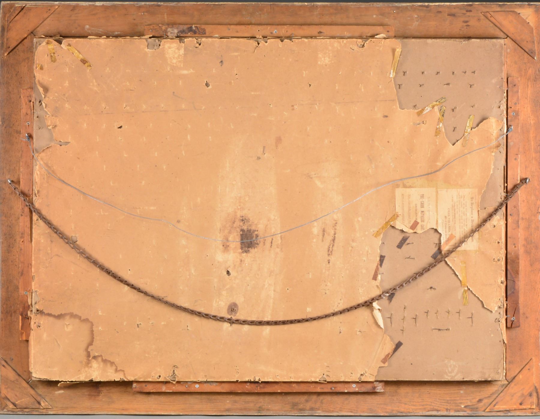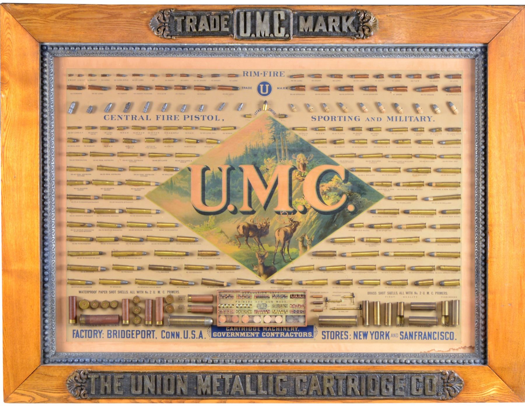 54 1/2" x 41 1/2" Overall. This is among the scarcest and most difficult to find of cowboy era, circa 1885, gun store cartridge board display. The massive oak frame has two large gesso panels with raised 2" relief lettering with “TRADEMARK” and “U.M.C.” on top banner and on bottom “The Union Metallic Cartridge Co.”. Over 100 examples of cartridges are labeled and arranged for the various Winchester, Sharps, Remington, Ballard, Colt, Merwin, Smith and Wesson rifles & handguns of the day. A central diamond color lithograph, 24" wide with UMC logo surrounded by western game scene. CONDITION: fine overall, no doubt among the very few surviving complete and original boards, background has some yellowing to thin varnish coating, about 4" x 1/2" water stain at bottom right corner, cartridges have smooth, light spotted mustard brass patina, lead is overall gray/black patina, oak frame is sound and solid with minor cosmetic blemishes at edges, gesso lettered panels are both fine and complete. PROVENANCE: Ex Ray Bentley Collection; Vicente Sepulveda Collection. (02-13624/JS). $30,000-40,000.