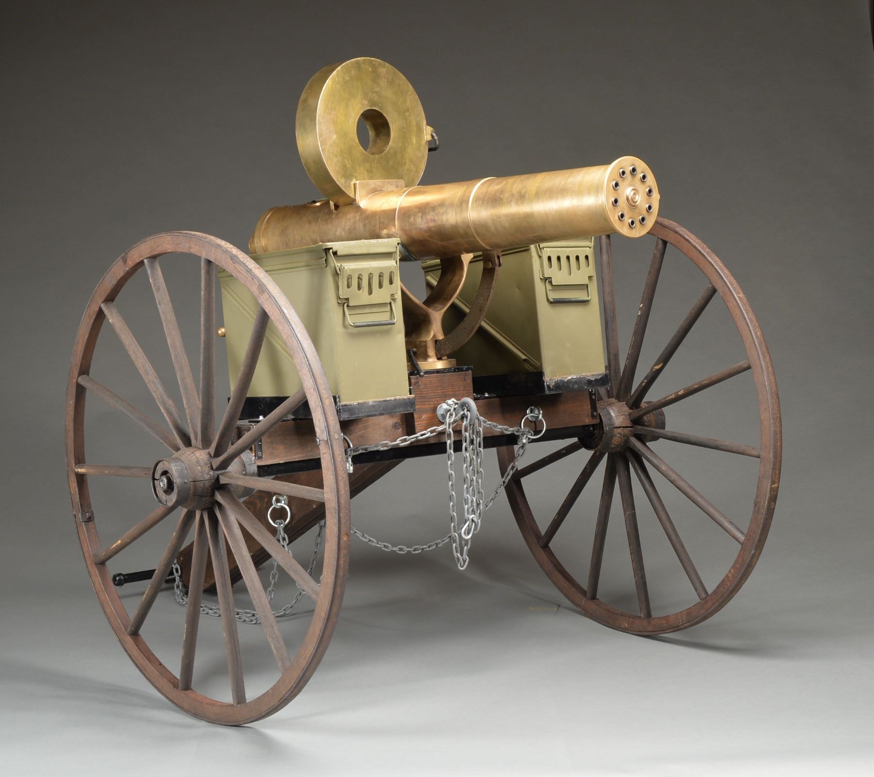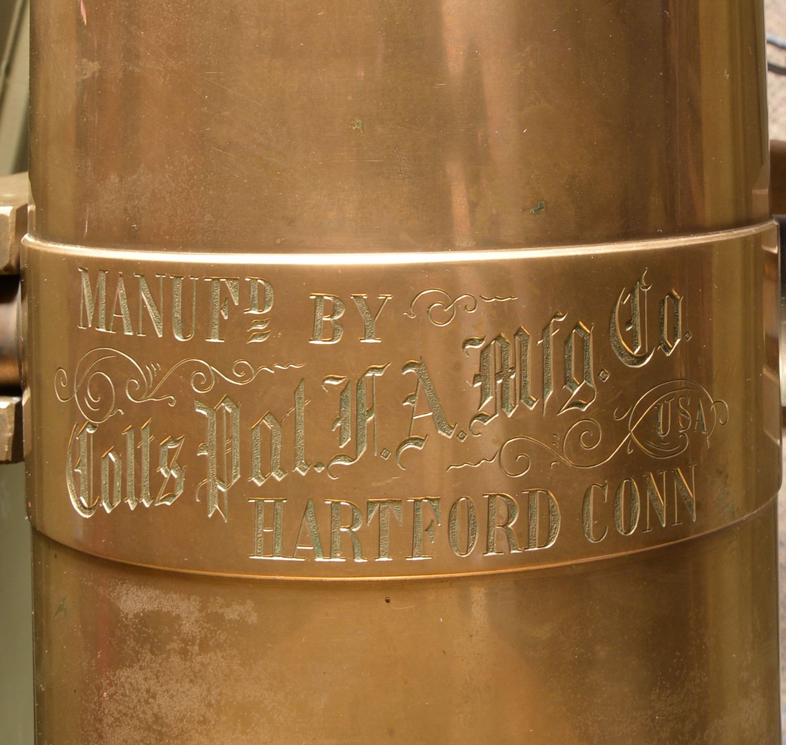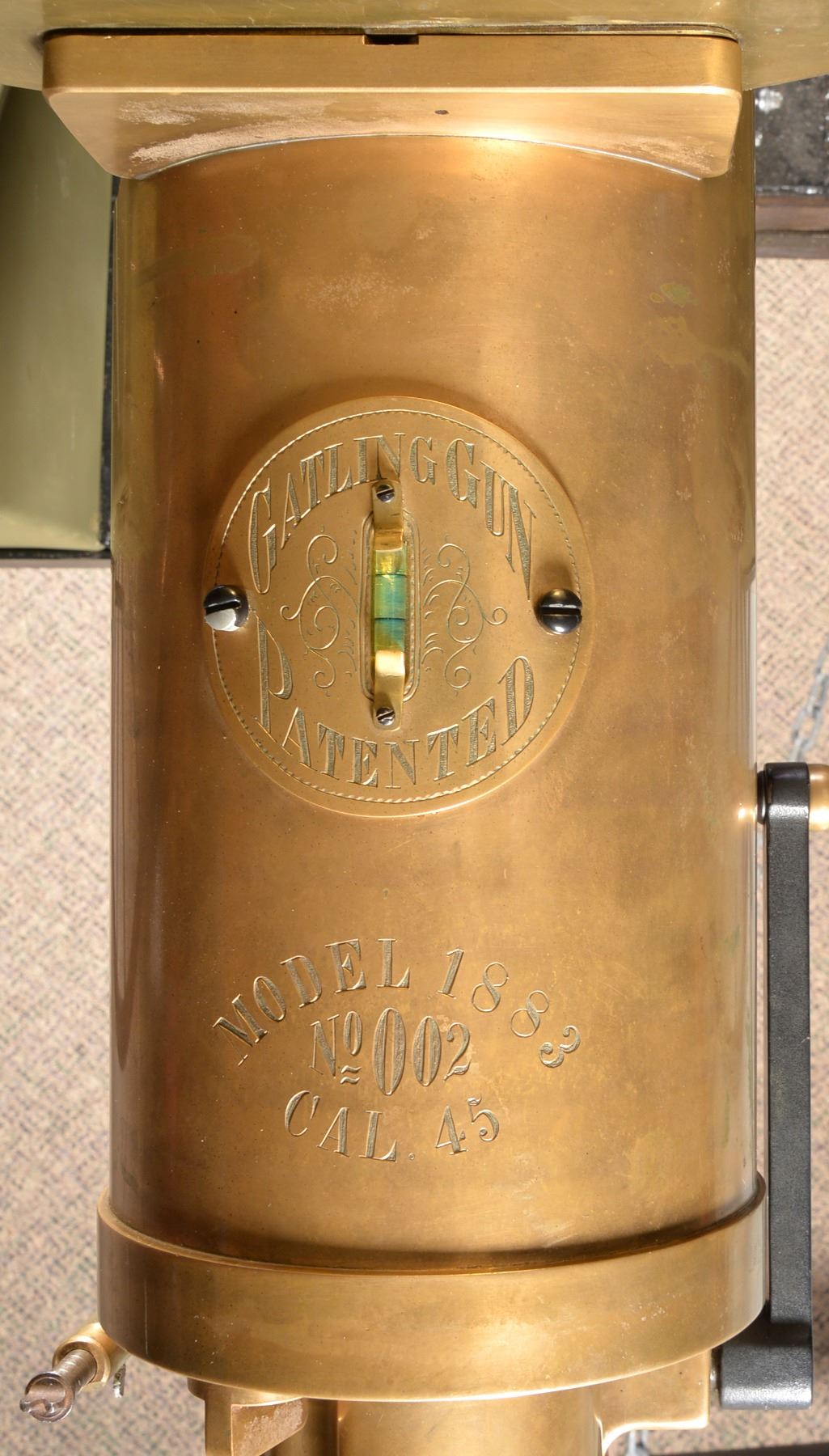 GUN. Cal. 45/70. S# 002. Bbl. 31”. A beautiful brass, full size, functional reproduction of the iconic Navy Gatling gun. The Navy versions were distinct in their bold, brass encasement of the rotating barrel assembly which continues from the standard round brass receiver. Receiver markings resemble early Colt markings on top of the receiver, both behind and in front of the feed mechanism, in this case the Accles power feed mechanism. Forward engravings read "Manufactured by Colt's Patented Firearms Manufacturing Co. Hartford, Connecticut" engraved in large script, to rear of the feed mechanism is a 3 5/8" diameter name plate with a modern level inset in center & marked "Gatling Gun Patented", directly behind name plate, on receiver is engraved "Model 1883 No. 002 Cal. 45". Overall length 52” w/ trunnions measuring 1.25” in diameter. It appears that an enormous amount of effort and detail was incorporated into this build to have not only the appearance seem original, but to provide an authentic experience both in displaying and utilizing this iconic symbol of history. The feed device included, the Accles power feed, is often referred to as a 100 round magazine, though it is not uncommon for them to hold any capacity between 99-104 rounds, (we are uncertain of the capacity on this gun). MAGS: 1 Accles Power Feed Drum. CONDITION: gun itself is very good overall with much tarnish on brass components from having been a centerpiece of a display for many years. Action and mechanics appear to function properly under manual inspection and operation. The carriage itself while aesthetically pleasing would be rated at fair condition as it appears rather frail. The large 19th century antique wheels are very weathered and are believed to be too weak for much actual use. This gun has a wonderful age patina to the point of looking very authentic and original; it doesn’t appear as though its had excessive use and while the bores still retain a significant amount of rifling, a light patina is visible that may be rectified as simple as a light oiling & regular maintenance. (20-463/JZ). MODERN. $20,000-30,000.
