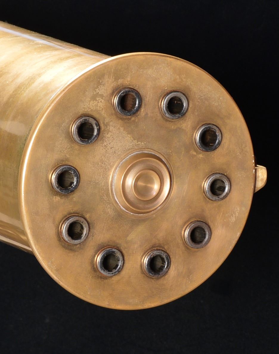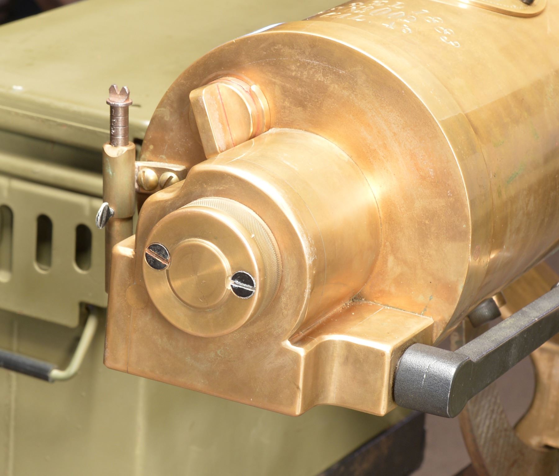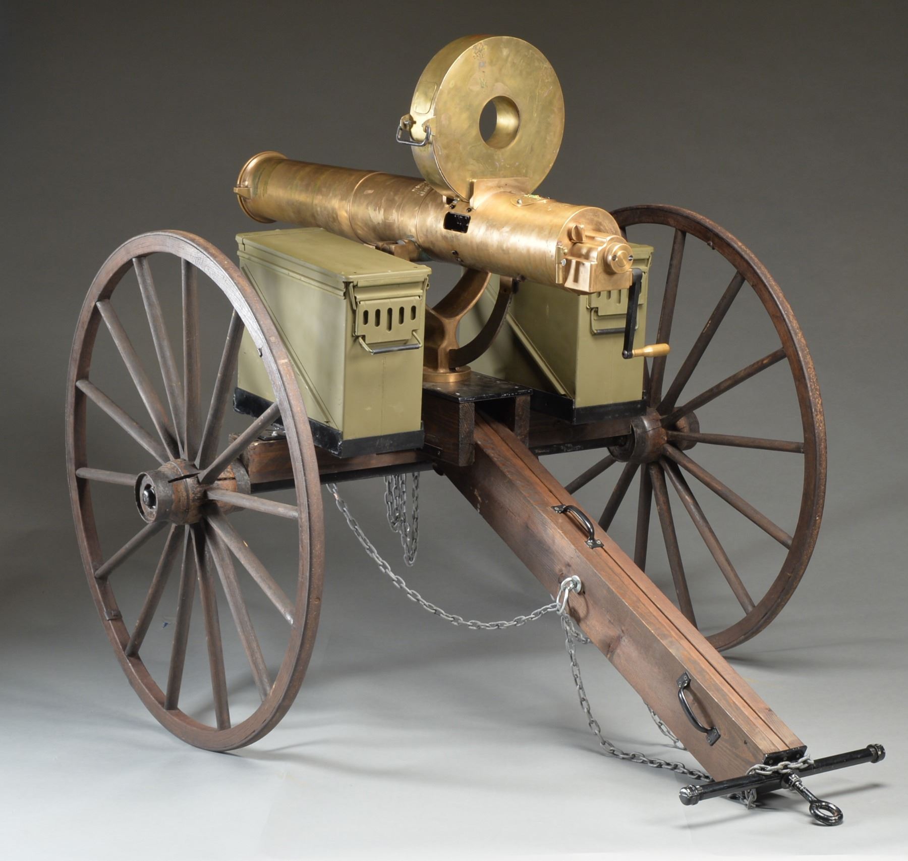 GUN. Cal. 45/70. S# 002. Bbl. 31”. A beautiful brass, full size, functional reproduction of the iconic Navy Gatling gun. The Navy versions were distinct in their bold, brass encasement of the rotating barrel assembly which continues from the standard round brass receiver. Receiver markings resemble early Colt markings on top of the receiver, both behind and in front of the feed mechanism, in this case the Accles power feed mechanism. Forward engravings read "Manufactured by Colt's Patented Firearms Manufacturing Co. Hartford, Connecticut" engraved in large script, to rear of the feed mechanism is a 3 5/8" diameter name plate with a modern level inset in center & marked "Gatling Gun Patented", directly behind name plate, on receiver is engraved "Model 1883 No. 002 Cal. 45". Overall length 52” w/ trunnions measuring 1.25” in diameter. It appears that an enormous amount of effort and detail was incorporated into this build to have not only the appearance seem original, but to provide an authentic experience both in displaying and utilizing this iconic symbol of history. The feed device included, the Accles power feed, is often referred to as a 100 round magazine, though it is not uncommon for them to hold any capacity between 99-104 rounds, (we are uncertain of the capacity on this gun). MAGS: 1 Accles Power Feed Drum. CONDITION: gun itself is very good overall with much tarnish on brass components from having been a centerpiece of a display for many years. Action and mechanics appear to function properly under manual inspection and operation. The carriage itself while aesthetically pleasing would be rated at fair condition as it appears rather frail. The large 19th century antique wheels are very weathered and are believed to be too weak for much actual use. This gun has a wonderful age patina to the point of looking very authentic and original; it doesn’t appear as though its had excessive use and while the bores still retain a significant amount of rifling, a light patina is visible that may be rectified as simple as a light oiling & regular maintenance. (20-463/JZ). MODERN. $20,000-30,000.