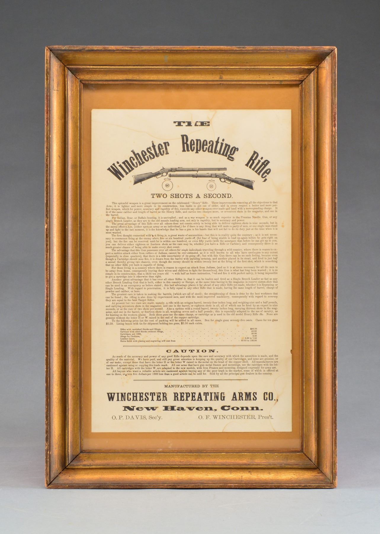 18 1/2" x 11 1/2” Mounted in 25" x 16 1/2" frame, this rare advertising broadside is nicely illustrated w/ a model 1866 rifle & carbine, text begins “This Splendid Weapon is a Great Improvement on the Celebrated “Henry Rifle”… for Indian, Bear or Buffalo Hunting, it is Unrivaled… The advantage that this gun possess over all others for single individuals travelling through a wild country, where there is reason to expect a sudden attack either from robbers or Indians, and not be overestimated… and fired in just half a second… which is something that no other rifle yet built is capable of doing.” CONDITION: not unframed but paper appears good to very good overall w/ light staining & foxing, there is about a 5" crack repair to paper through text but w/ loss of only 3 letters in first line of third paragraph, as can be seen in photos, this is a rare illustrated broadside that presents beautifully. PROVENANCE: Ex Ray Bentley Collection; Vicente Sepulveda Collection. (02-13627/JS). $1,000-1,500.