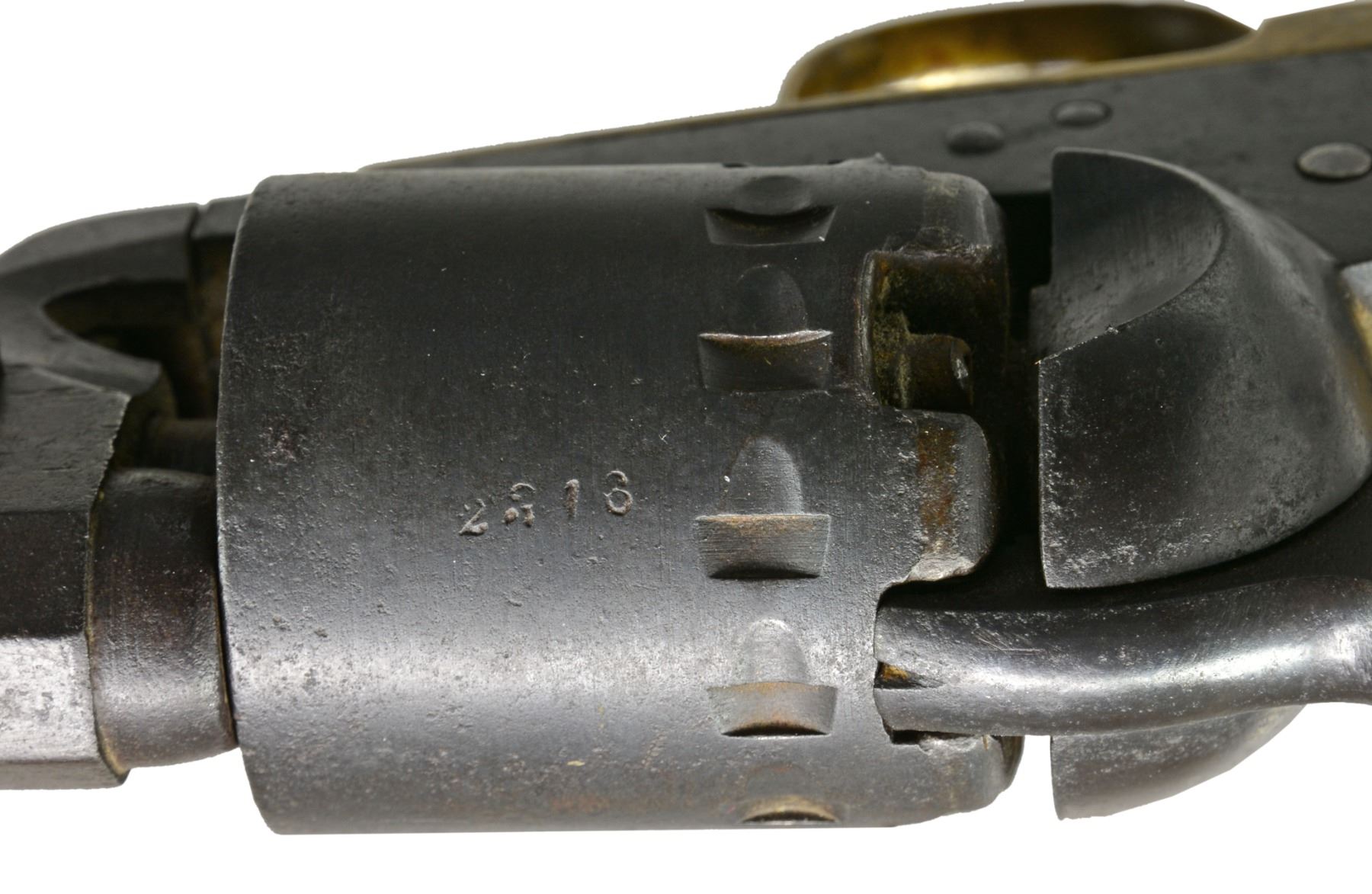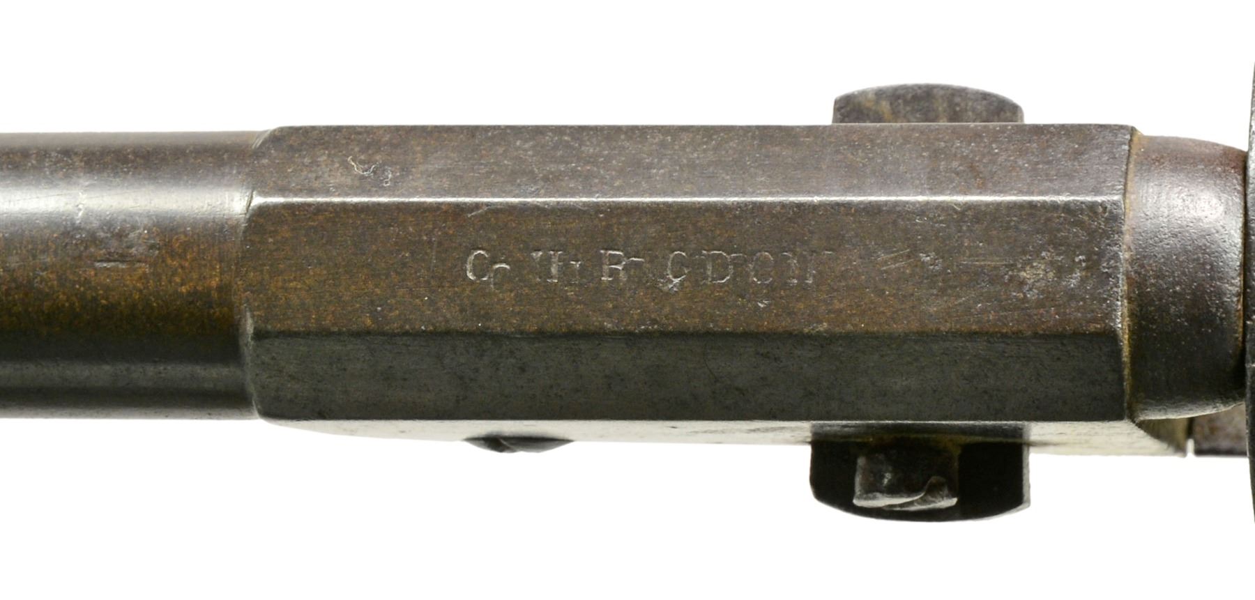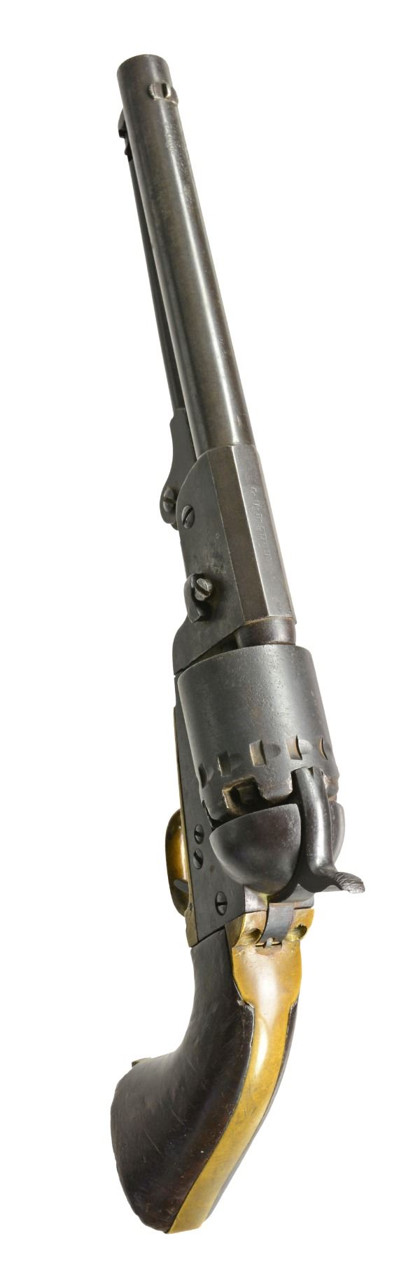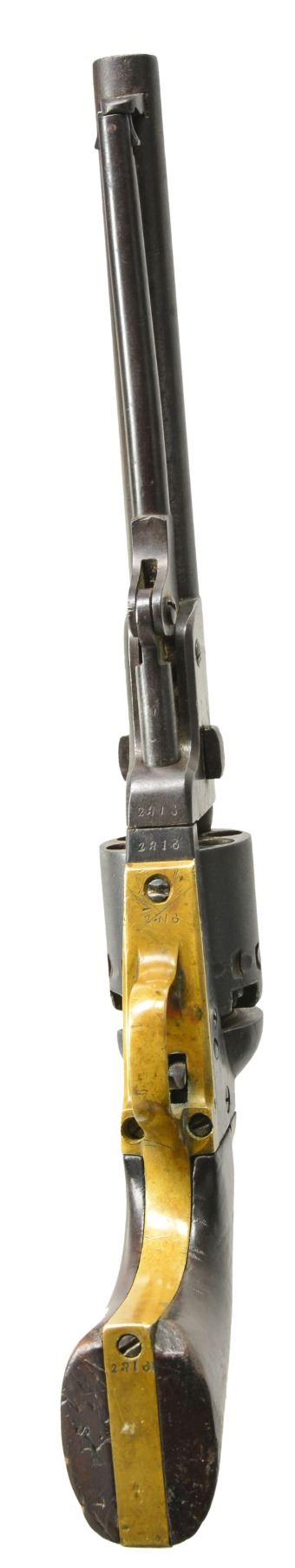 REVOLVER. Cal 36. 2316. For the Confederate handgun collector who wants every model, this is the only Rigdon & Ansley 12 stop revolver with only "CH RIGDON” marking in standard configuration and 100% original, complete and superior condition for a Confederate revolver. It is also the only Rigdon & Ansley with “S.C” surcharge like seen on Leech & Rigdon revolvers in mid production S# range. This revolver also has a dovetailed blade front sight unlike the pin sights seen on all other examples. There are only 4 other guns known marked “C H RIGDON” and it is secondary marked on side flat with “CSA” on top. (1490, 2154, 2180, 2182). This gun has been known since 1979 when it surfaced in Elizabethtown, Tennessee with history that a Confederate carried it. This gun has remained in the same collection since it surfaced in the consignor's world. There is only one other identically marked "CH RIGDON" revolver and it is a unique 5" unserialized “pocket revolver” which also has long history and thought to be Charles Rigdon’s personal revolver and late production. CONDITION: very good overall and excellent for a Confederate revolver. 100% original and authentic including screws. Matching serial numbers are found on every part. Rigdon revolvers are numbered; barrel latch, LL, wedge, frame, cylinder, tang, backstrap, and arbor. A partial penciled number in grip channel “316”. Iron overall has smooth plum patina with minor pitting, brass has mustard colored patina. Grips have hand worn patina with chipped toes. Mechanics are fine, crisp rifled bore. “C H RIGDON” is well defined with a “rebound” of die with ghost first letters, this is seen in the 5” unique example also and often seen in mid-range serial of Leech & Rigdon revolvers. SNs all discerned with scratching over and around number on triggerguard. “C H RIGDON” is easily discerned, as can be seen in photos. Cryptic “W” is found on left side of trigger guard. PROVENANCE: David Crockett, Elizabethtown, TN 1979. (01-17370/JS). ANTIQUE. $25,000-35,000.