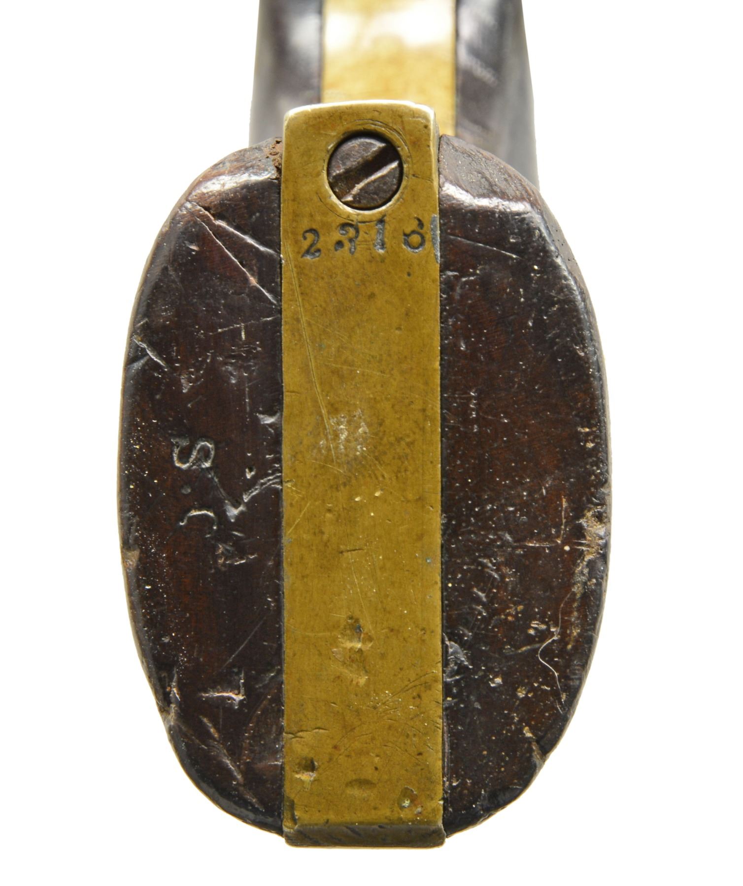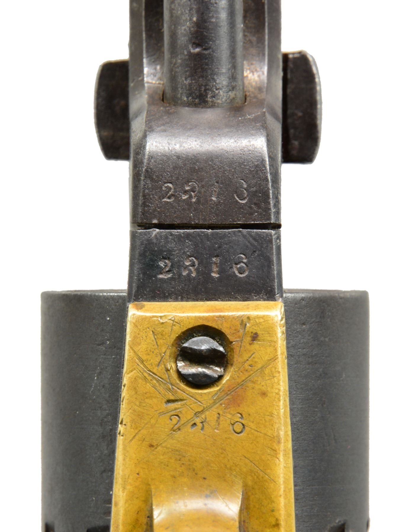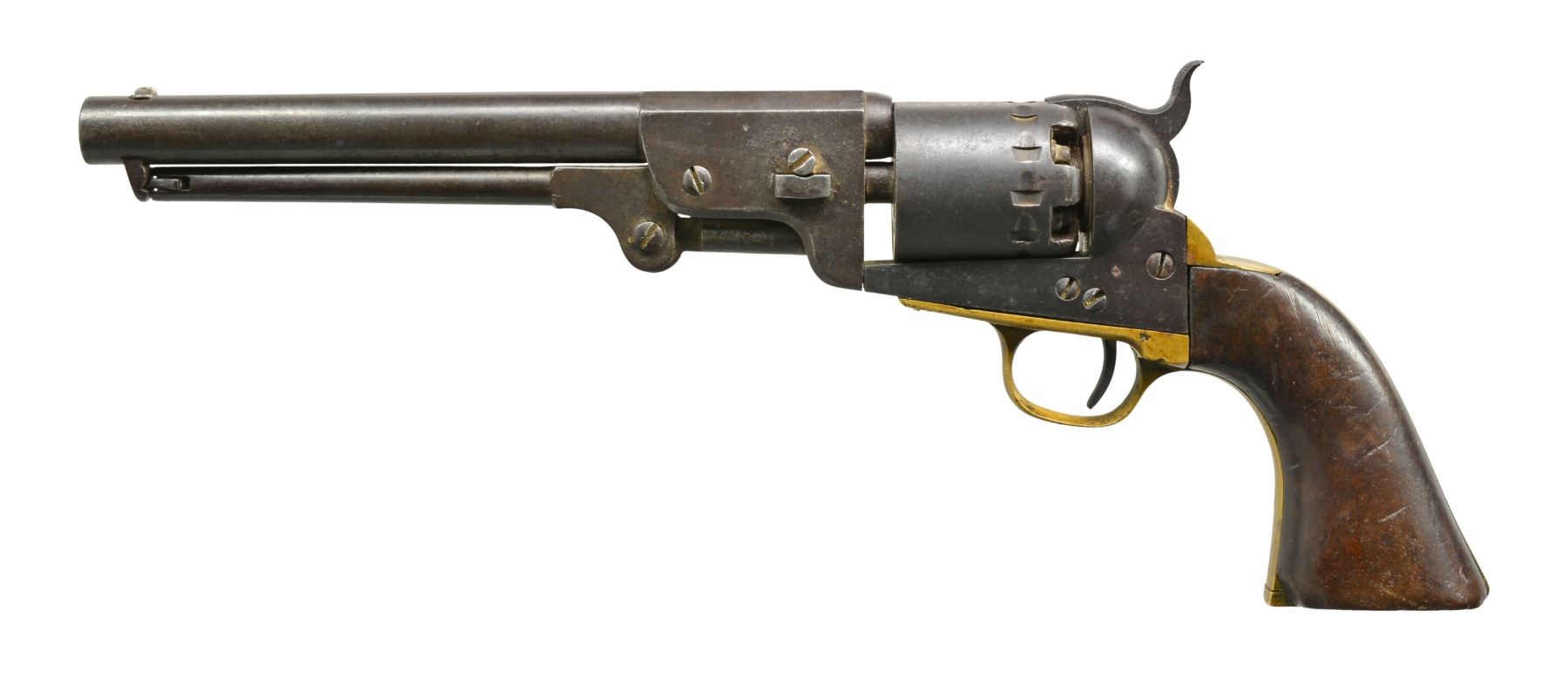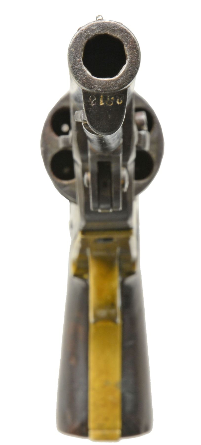 REVOLVER. Cal 36. 2316. For the Confederate handgun collector who wants every model, this is the only Rigdon & Ansley 12 stop revolver with only "CH RIGDON” marking in standard configuration and 100% original, complete and superior condition for a Confederate revolver. It is also the only Rigdon & Ansley with “S.C” surcharge like seen on Leech & Rigdon revolvers in mid production S# range. This revolver also has a dovetailed blade front sight unlike the pin sights seen on all other examples. There are only 4 other guns known marked “C H RIGDON” and it is secondary marked on side flat with “CSA” on top. (1490, 2154, 2180, 2182). This gun has been known since 1979 when it surfaced in Elizabethtown, Tennessee with history that a Confederate carried it. This gun has remained in the same collection since it surfaced in the consignor's world. There is only one other identically marked "CH RIGDON" revolver and it is a unique 5" unserialized “pocket revolver” which also has long history and thought to be Charles Rigdon’s personal revolver and late production. CONDITION: very good overall and excellent for a Confederate revolver. 100% original and authentic including screws. Matching serial numbers are found on every part. Rigdon revolvers are numbered; barrel latch, LL, wedge, frame, cylinder, tang, backstrap, and arbor. A partial penciled number in grip channel “316”. Iron overall has smooth plum patina with minor pitting, brass has mustard colored patina. Grips have hand worn patina with chipped toes. Mechanics are fine, crisp rifled bore. “C H RIGDON” is well defined with a “rebound” of die with ghost first letters, this is seen in the 5” unique example also and often seen in mid-range serial of Leech & Rigdon revolvers. SNs all discerned with scratching over and around number on triggerguard. “C H RIGDON” is easily discerned, as can be seen in photos. Cryptic “W” is found on left side of trigger guard. PROVENANCE: David Crockett, Elizabethtown, TN 1979. (01-17370/JS). ANTIQUE. $25,000-35,000.