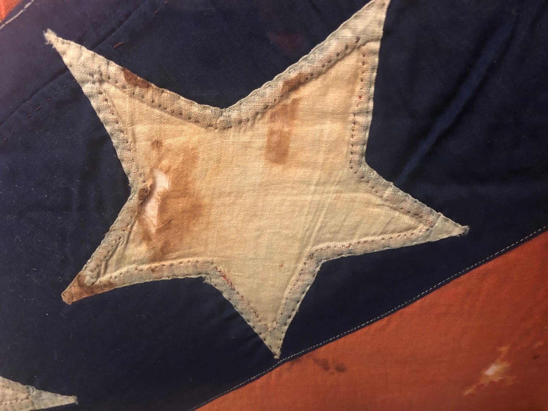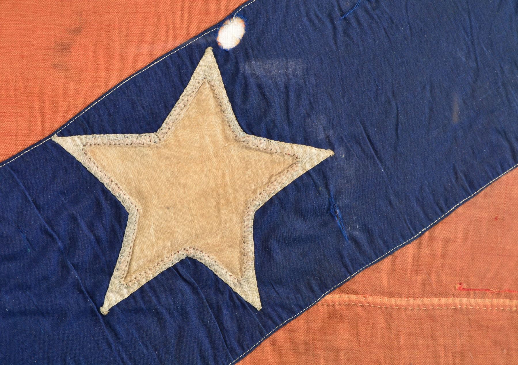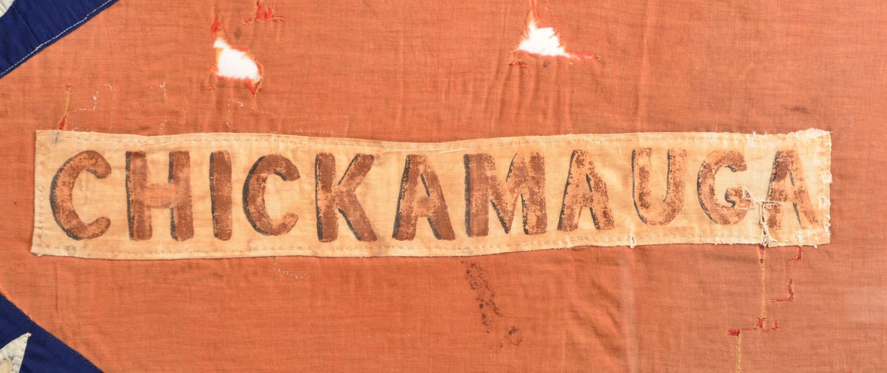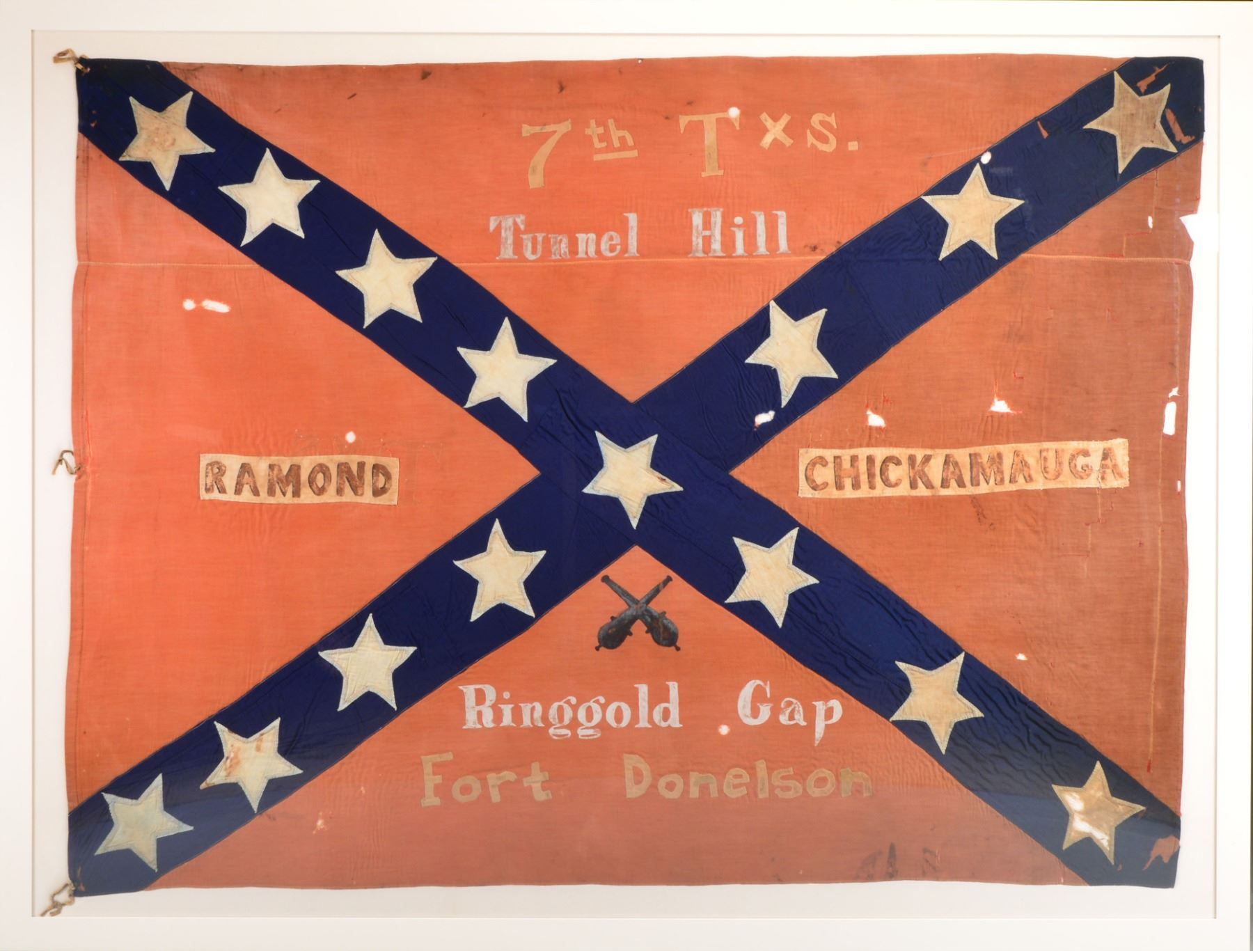 THE CONFEDERATE FLAG ONCE CARRIED BY THE 7TH TEXAS INFANTRY BEING THE FINEST & PERHAPS MOST HISTORIC CONFEDERATE BATTLE FLAG & UNQUESTIONABLY THE MOST IMPORTANT CONFEDERATE TEXAS BATTLE FLAG KNOWN TO EXIST. This extremely rare flag, rectangular in shape, is referred to as a “Southern Cross Confederate Battle Flag”. It is in the patent of the Army of Tennessee, measuring 49” on the hoist by 66” on the fly. It is double-sided, single piece flag sporting 15 single-applique cut-out stars on each side. The unit designation “7th XS” is sewn polished cotton on both sides. The battle honors are applied on the other side only including Fort Donelson, Raymond Chickamauga, Tunnel Hill, Ringgold Gap and crossed cannons earned during Battle of Chickamauga when Greggs Brigade helped capture a battery of Union cannons. The 7th Texas Regiment was a renowned unit which fought for the Confederacy during the war. On October 2nd, 1861 at Marshall, Texas, nine infantry companies were organized into a regiment. The force behind this organization was John Gregg, District Judge from Fairfield, Texas. Gregg received a Colonel’s commission and the authority to raise an infantry regiment. The regiment was sent by train to Shreveport & marched to Memphis, Tennessee and in November of 1861 was in Hopkinsville, Kentucky. The Lieutenant Colonel of the regiment was Jeremiah M. Clough, who was previously a District Attorney w/ Harrison County. The Major of the unit was Hiram Bronson Granbury, formerly a member of the renowned Texas Rangers and he also served as Chief Justice of McLennan County. In February of 1862, the unit arrived at Fort Donelson on the Cumberland River. After two days of vicious fighting, Fort Donelson was surrendered to Ulysses S. Grant and the surviving members of the 7th Texas Unit (with the exception of those men who were able to escape & some of whom later served in Terry’s Texas Rangers in the 9th Texas Infantry). All of the 7th Texas Unit that was captured went to a Northern Prison until September of 1862 when they were exchanged at Vicksburg, Mississippi. Col. Gregg was promoted to Brigadier General in August of 1862 & Major Granbury was promoted to Colonel. By February of 1863, it had acquired enough troops to regain its regimental status & was placed in Brigadier General Gregg’s aid. In May 1863, they were sent to Raymond, Mississippi where the 7th Texas were engaged in a horrendous battle which resulted in a loss over 50% of men. The 7th, together with the other unites of Gregg’s Brigade, fought valiantly & conspicuously and after the battle a Federal Commander stated he was convinced that he had been attacked by an entire division rather than a brigade. In 1863, the brigade was sent to Jackson, Mississippi, once again seeing much fighting & action. In mid-September of 1863, they were involved in the great Battle of Chickamauga where they once again lost a number of their men. The 7th Texas conspicuously participated in the final charge which drove the Union army from the field & into siege at Chattanooga. After Chickamauga, the 7th Texas was placed in the brigade of James A. Smith of Major General Patrick R. Cleburne’s division. Here the 7th Texas would remain until the end of the war. On November 25th & 26th 1863, they participated in the Battle of Missionary Ridge & the 7th Texas helped to defend the Confederate right. General Smith & his second in command were both wounded which thus elevated Col. Granbury to Brigade Commander. General Braxton Bragg’s center & left collapsed and his army retreated. Cleburne’s men, including the 7th Texas, occupied the post of honor that being the rear guard. On November 27th, 1863, Cleburne & his unit received additional glory at the Battle of Ringgold Gap for their incredible action in the campaign. Cleburne’s division won the thanks of the Confederate Congress and on February of 1864, Colonel Granbury was promoted to Brigadier General and command of the brigade. By May of 1864, the Army of Tennessee opposed Sherman’s advance on Atlanta & fought for over 100 days. Once again, the 7th Texas gained new glory at places like Pickett’s Mill, Kennesaw Mountain, Atlanta, Jonesboro, & LoveJoys Station. During this campaign, the 7th Texas once again lost a number of men. On November 30th, 1864 (the date the flag was captured by Union forces), the 7th Texas fought heroically in Franklin, Tennessee. In one instance, charging without the benefit of artillery against entrenched Federal positions. During this desperate battle, a great number of 7th Texas were killed, wounded or captured and Brigadier General Granbury & Major Cleburne were among the killed. The Commander of the 7th Texas, John William Brown, was also captured and at the end of the day, Captain Edward Thomas Broughton of the 7th Texas commanded the brigade. The Confederates pursued the Federal Army to the environs of Nashville & on December 15th & 16th, 1864, two days of battle ensued. The 7th Texas and the rest of the brigade fought well but were eventually driven back from the field. On April 26th, 1865, the regiment accompanied the Army of Tennessee into the Carolina’s where they surrendered to Major William Tecumseh Sherman. After the war, numerous men for the 7th Texas distinguished themselves as business & civic leaders, particularly William L. Moody and K.M. Van Zandt. The people of Texas memorialized John Gregg as Gregg County in East Texas named in his honor. Granbury in Hood County is named in honor of General Hiram B. Granbury. The 7th Texas was truly a historic & distinguished regiment in the Texas Confederate Army. The flag of the 7th Texas is one of the finest Confederate flags currently in private hands & possibly the finest ever offered at public auction. One of the most desirable attributes of a historic flag is its graphic design & condition and here the 7th Texas flag is exemplary. Its’ brilliant red background with huge blue cross interposed wit