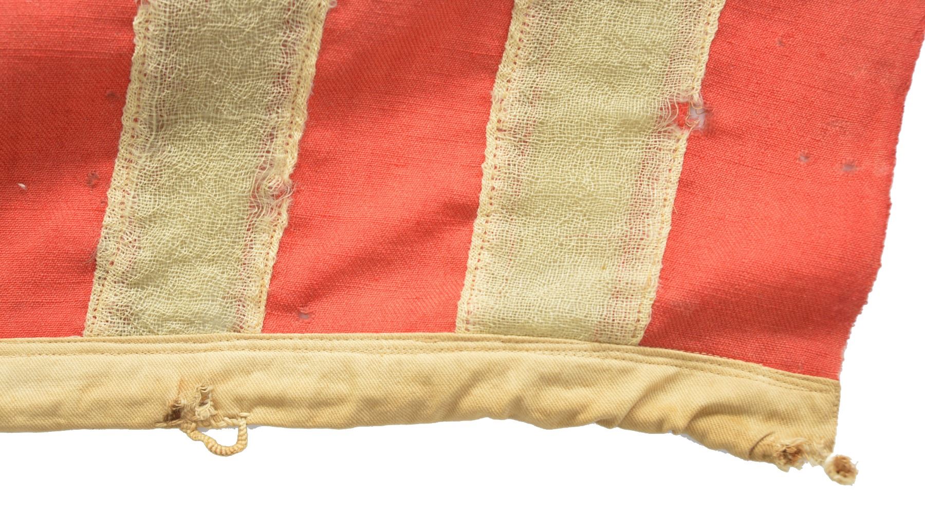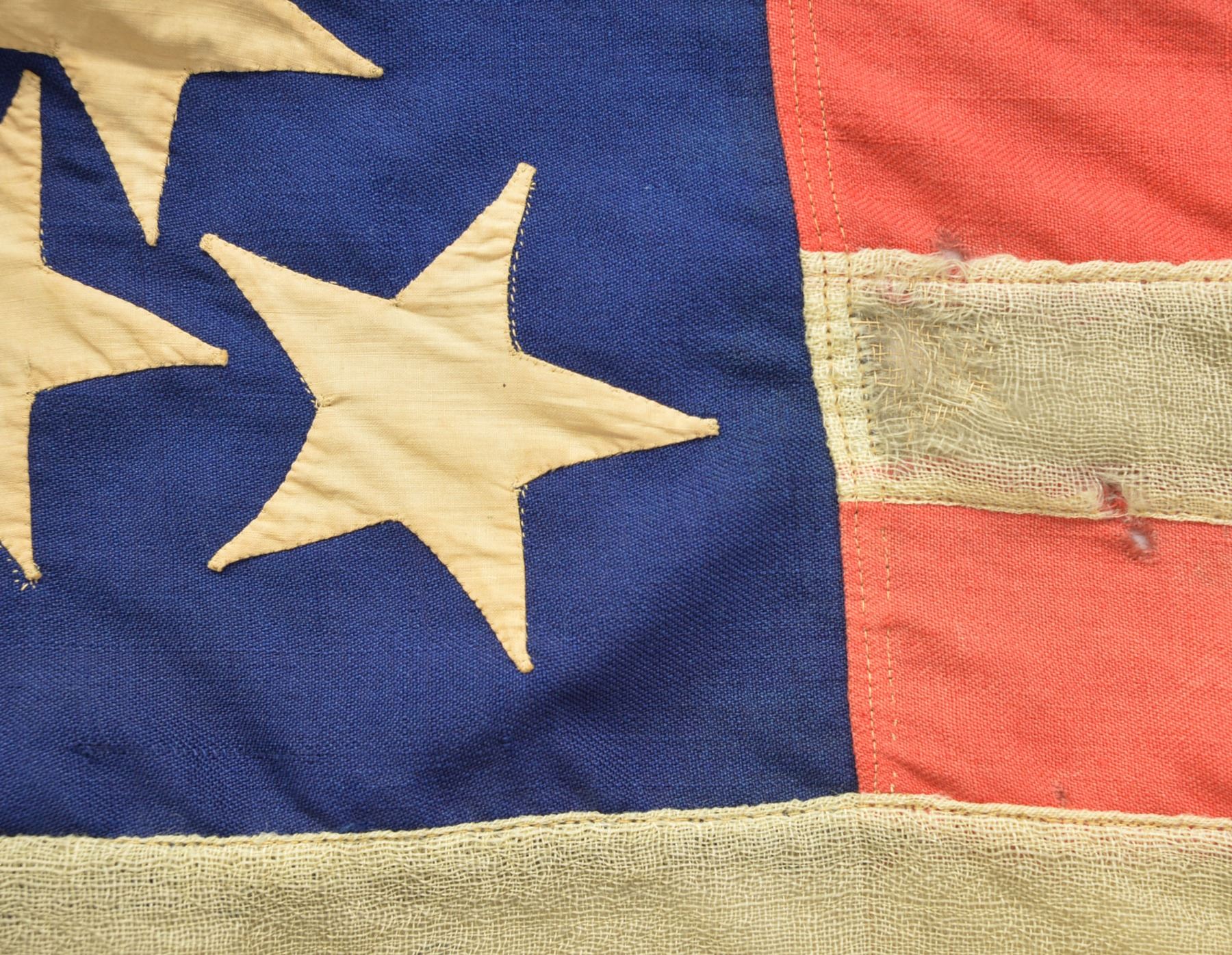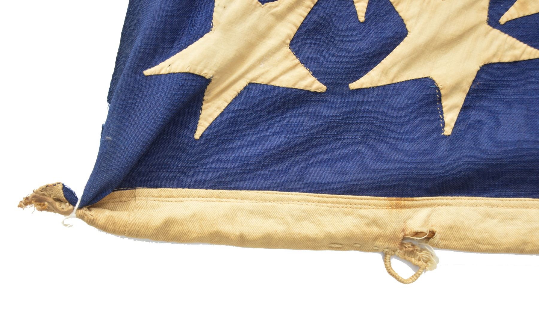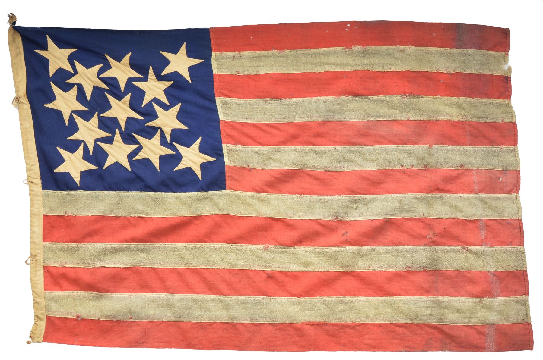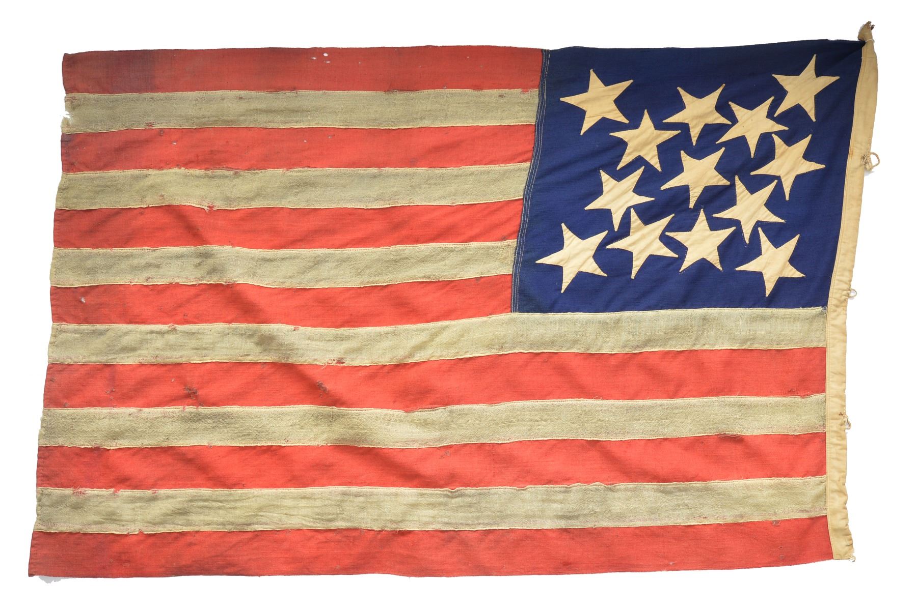 AMERICAN FLAG WITH HANDSTITCHED STARS. 45 1/2" x 29 1/2" Early 13 star flag w/ uniquely arranged stars on the blue canton. Canton measures approx. 17” x 15 1/4" w/ hand sewn, white cotton, double applique stars measuring between 4 1/4" & 3 1/2" from point to point. 1 1/8” Cotton hoist has 5 heavily hand stitched cotton loops approx. every 7” for attachment. Red stripes are single ply, tightly woven wool bunting measuring between 2 1/16” & 2 1/2”. White stripes are a double ply, more loosely woven wool bunting & measure between 2” & 2 1/2”. The hem on the fly end is hand sewn utilizing 2 or 4 layers of fabric. The top & bottom of the flag have selvage edges. Oral history from the consignor states that the flag originated from the Henry Ellis Warren Estate in Ashland, MA. The Warren family has a rich history in the Massachusetts Militia as well as state & federal politics. Among the many famous Warrens in Mass. history, is Joseph Warren who was Henry E. Warren’s third great grandfather. This flag was likely kept around the Warren homestead to honor the service of Captain Joseph Warren in the 6th Middlesex Militia of Massachusetts, otherwise known as Reed’s Regiment. CONDITION: the flag is surprisingly solid & colors remain quite vivid. It shows slight soiling & staining w/ scattered sm. losses & threadbare areas. There are a few scattered hand sewn, period repairs. (02-13502/BF). $4,000-6,000.