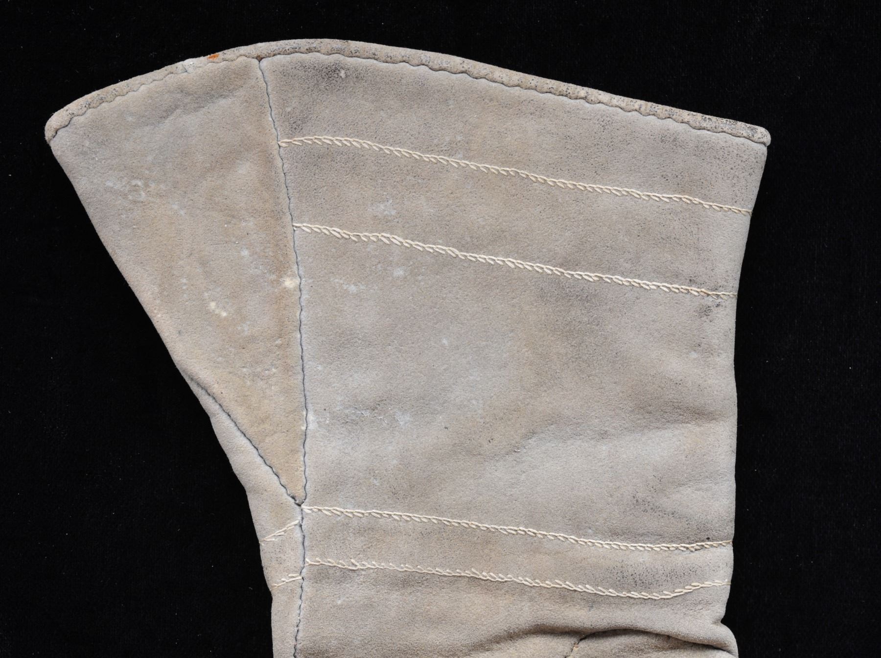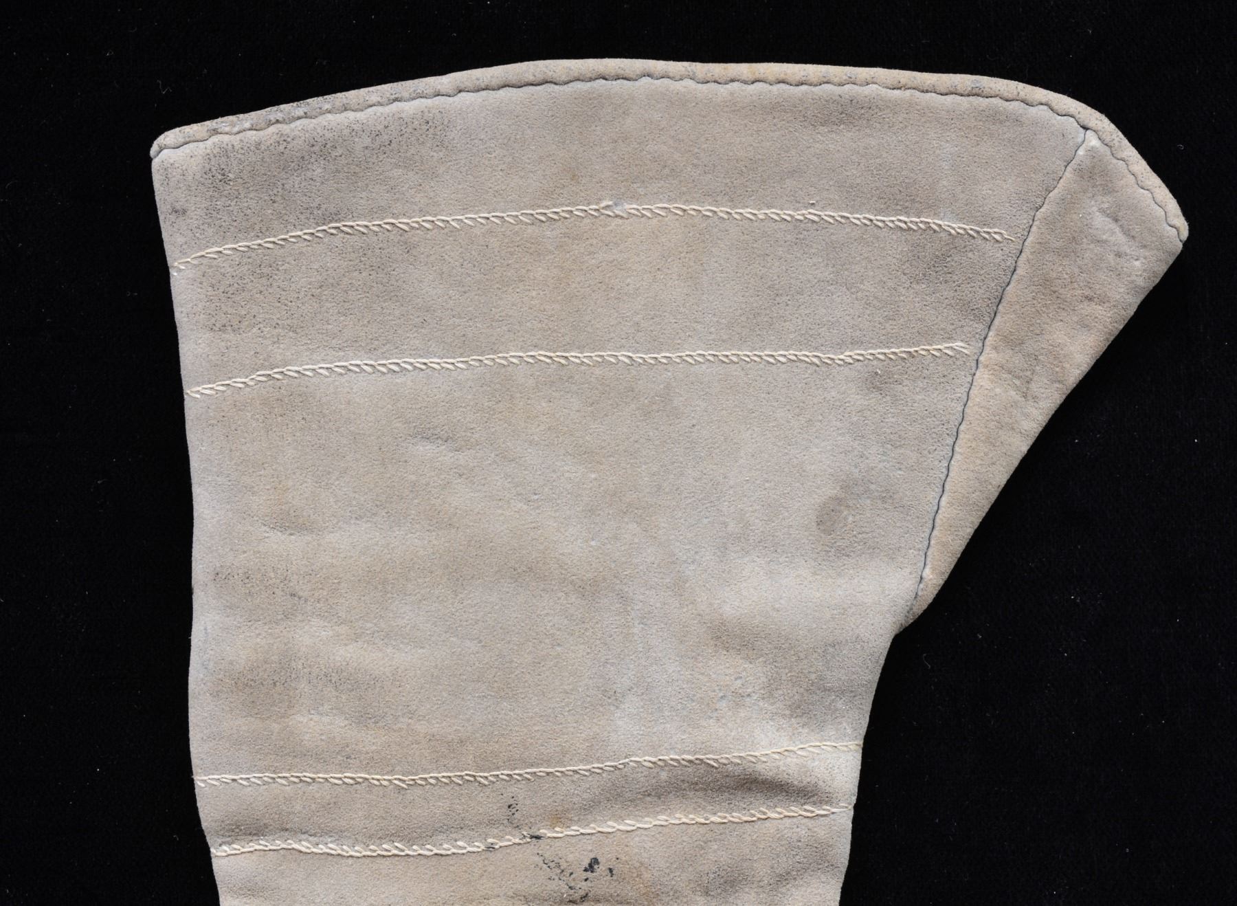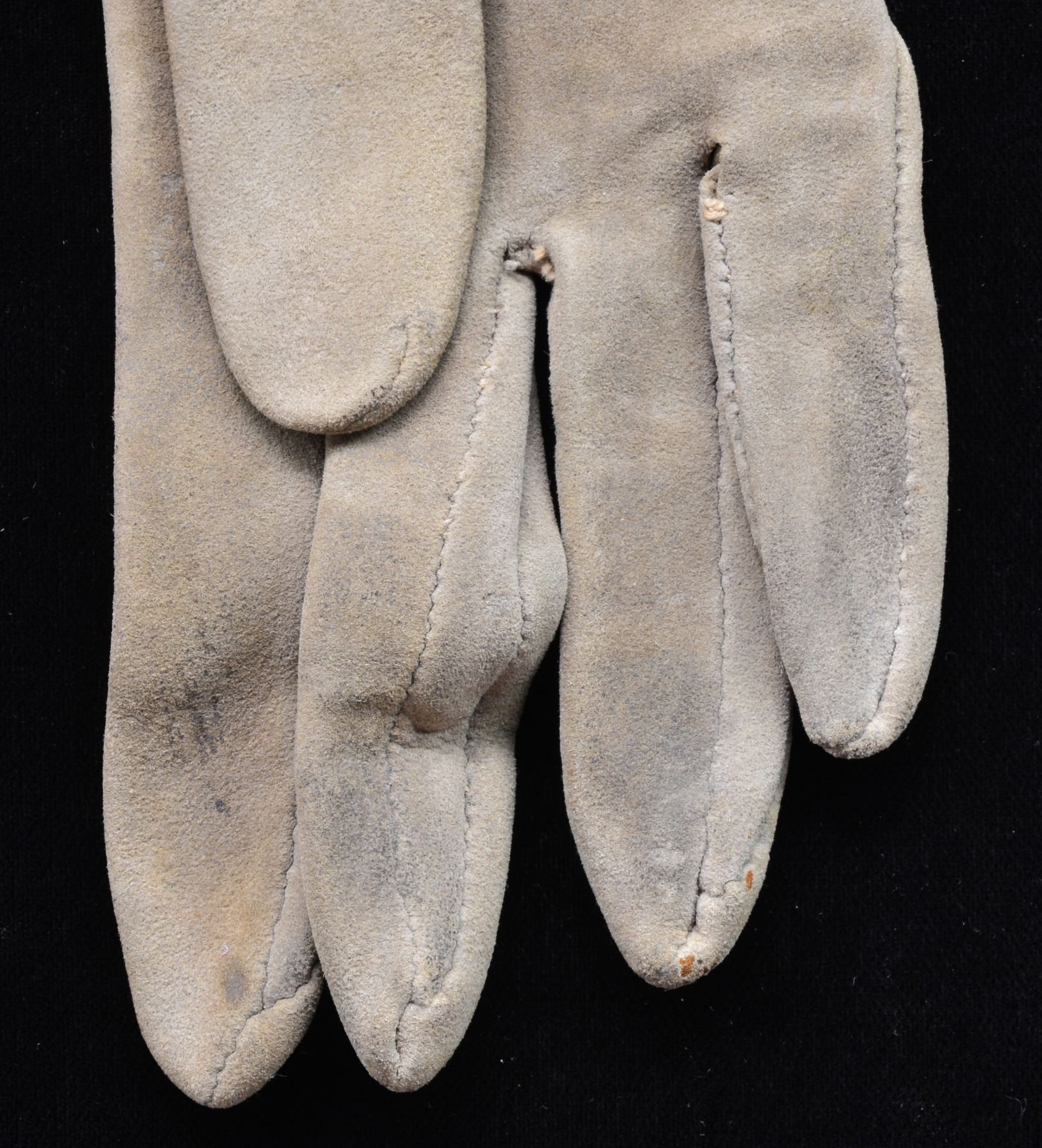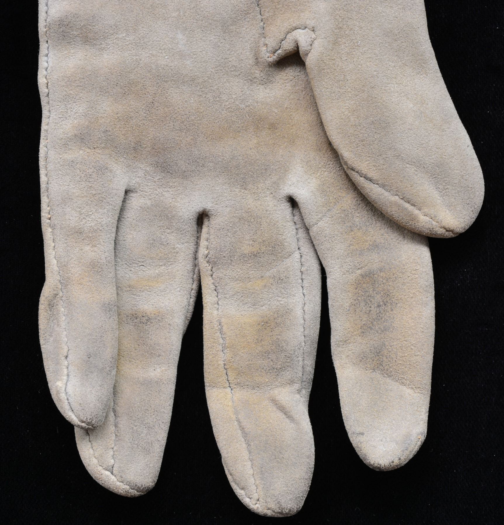 CUTHBERT H. SLOCOMB OF THE WASHINGTON ARTILLERY. A fine pair of Civil War period Confederate officer’s gauntlets worn by Captain C.H. Slocombum while serving with the Washington Artillery of New Orleans, Louisiana. The gloves appear to be gray in color but may have originally been white when worn by Slocombum. The cuffs have 6” wide openings and appear to be lined with goat skin. There are 2 rows of decorative stitching at the lower and upper end of the cuff. The back of the gloves have 3 stitched lines extending from the upper decorative stitched row to the base of the fingers. Penned in period ink on the inside of the cuffs is the name “MAYNARD” and “1864”. This name was originally thought to identify the grouping. It was later realized that Captain C. H. Slocombum had written his name on the back of the hang strap of one of the uniforms, thus finally identifying this incredibly historic uniform group. UNATTACHED ACCESSORIES: Les Jensen authentication letter. CONDITION: the gauntlets remain exceptionally solid with minor insect damage primarily around the base of the right cuff. A few small sections of stitching are missing from the back of the right gauntlet. Expectedly, the gauntlets are a bit dirty and appear gray in color. PROVENANCE: Abraham Lincoln Book Shop, Chicago, IL, to legendary collector George Markham in 1957 to the esteemed collection of Don and Judy Polifka in 1987. (02-13431/BF). $2,400-3,600.
