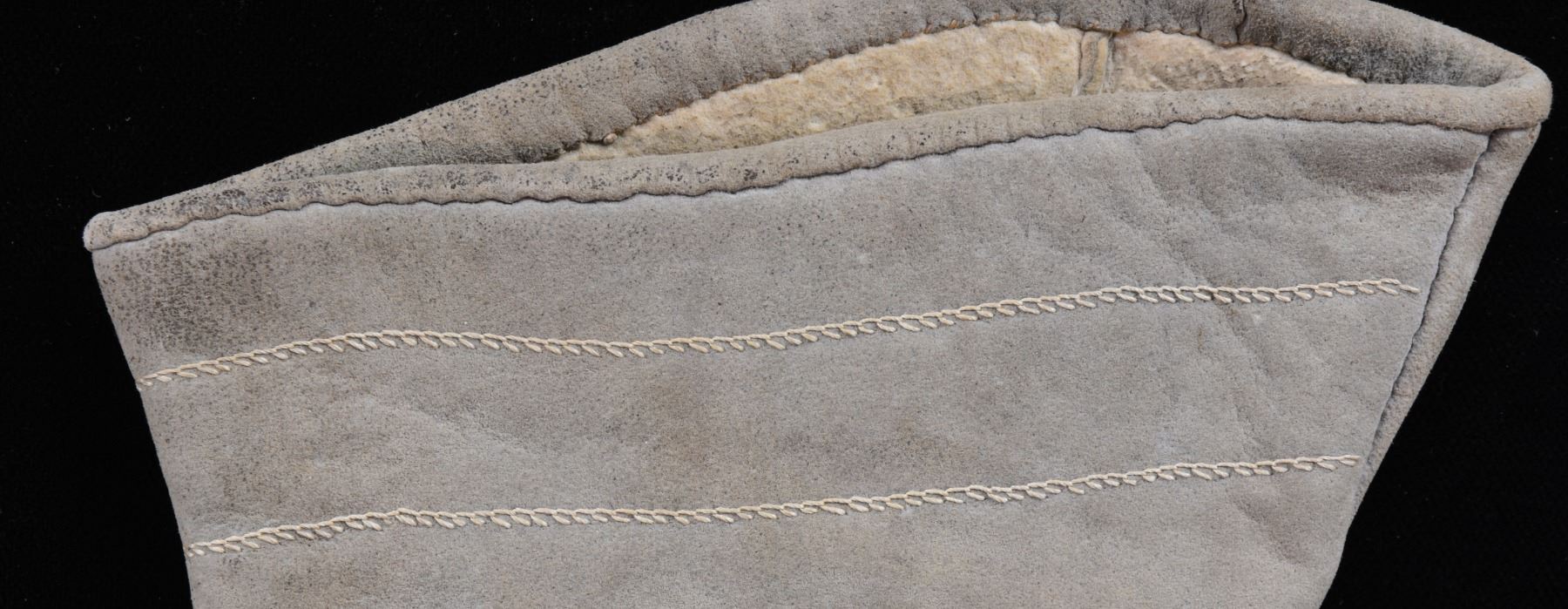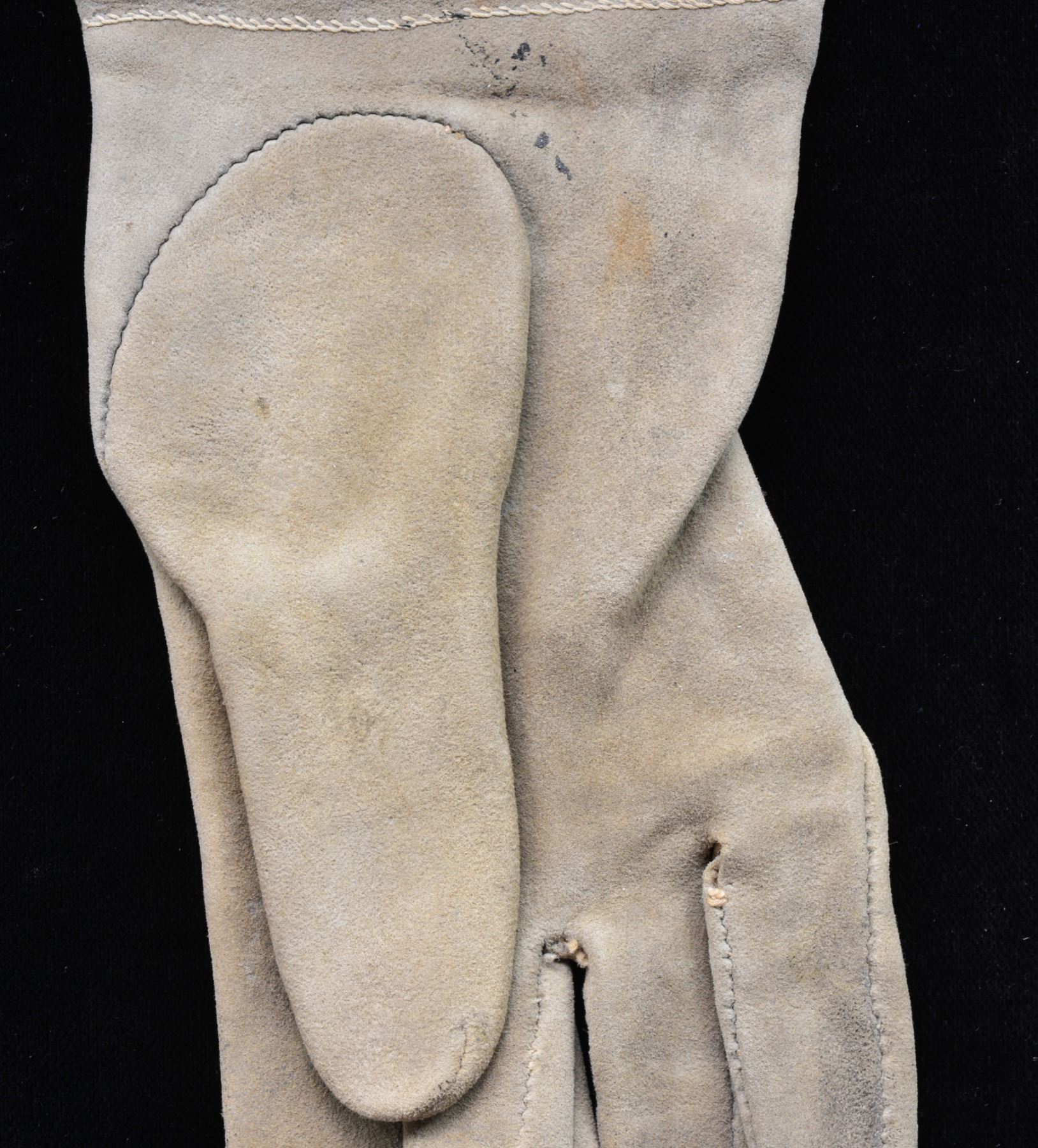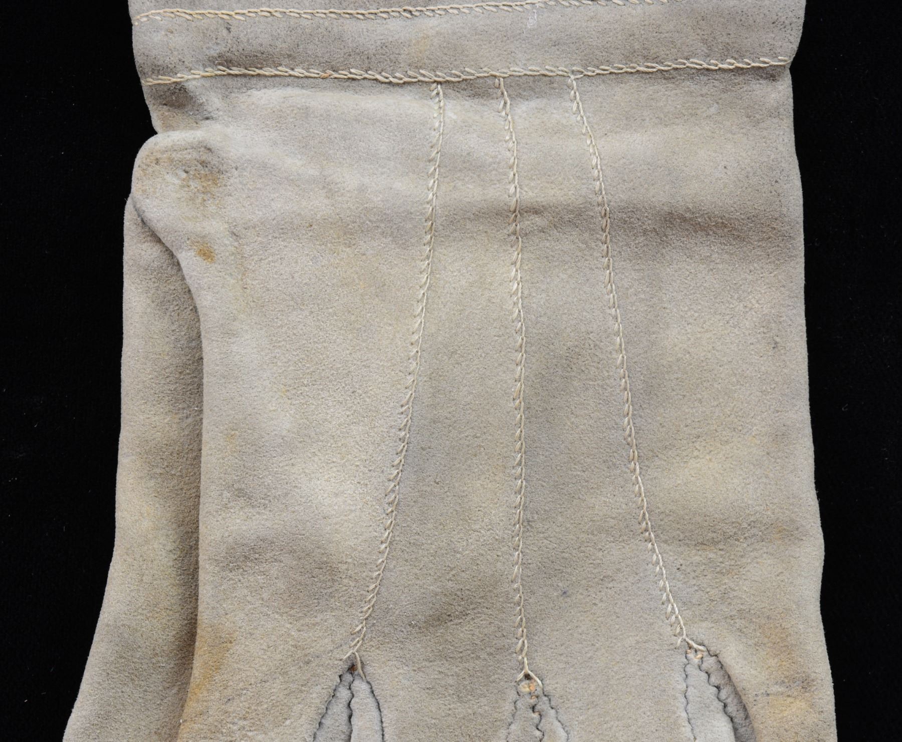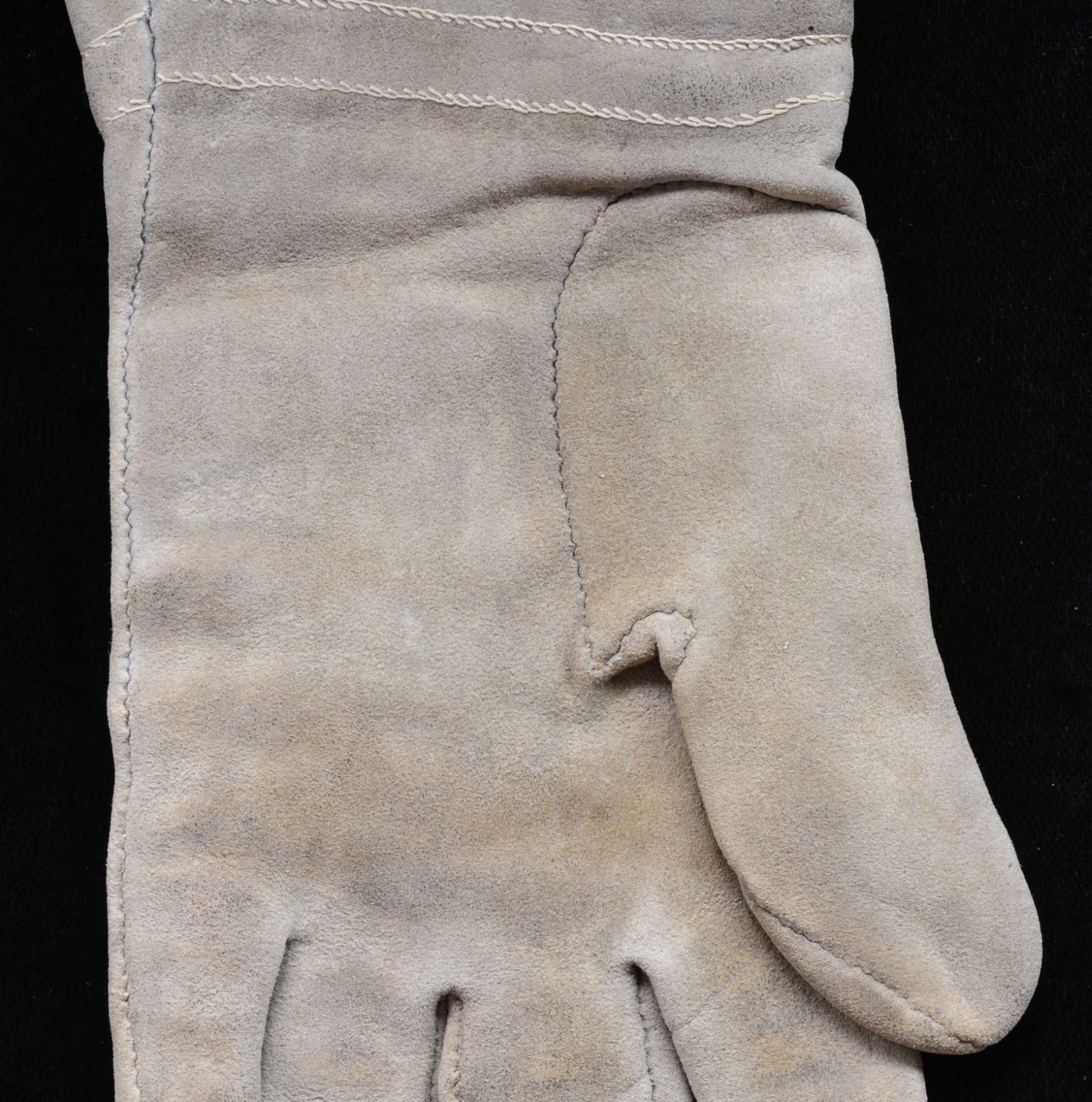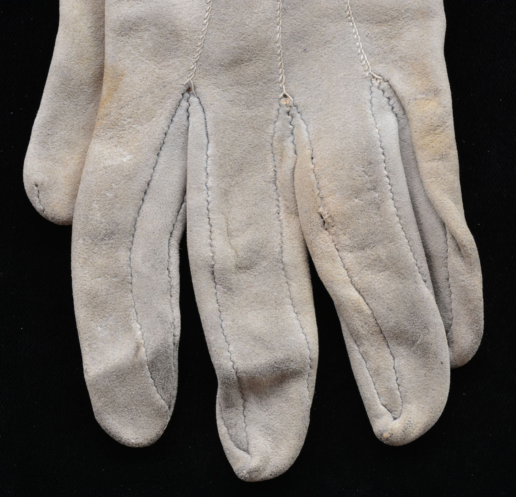 CUTHBERT H. SLOCOMB OF THE WASHINGTON ARTILLERY. A fine pair of Civil War period Confederate officer’s gauntlets worn by Captain C.H. Slocombum while serving with the Washington Artillery of New Orleans, Louisiana. The gloves appear to be gray in color but may have originally been white when worn by Slocombum. The cuffs have 6” wide openings and appear to be lined with goat skin. There are 2 rows of decorative stitching at the lower and upper end of the cuff. The back of the gloves have 3 stitched lines extending from the upper decorative stitched row to the base of the fingers. Penned in period ink on the inside of the cuffs is the name “MAYNARD” and “1864”. This name was originally thought to identify the grouping. It was later realized that Captain C. H. Slocombum had written his name on the back of the hang strap of one of the uniforms, thus finally identifying this incredibly historic uniform group. UNATTACHED ACCESSORIES: Les Jensen authentication letter. CONDITION: the gauntlets remain exceptionally solid with minor insect damage primarily around the base of the right cuff. A few small sections of stitching are missing from the back of the right gauntlet. Expectedly, the gauntlets are a bit dirty and appear gray in color. PROVENANCE: Abraham Lincoln Book Shop, Chicago, IL, to legendary collector George Markham in 1957 to the esteemed collection of Don and Judy Polifka in 1987. (02-13431/BF). $2,400-3,600.