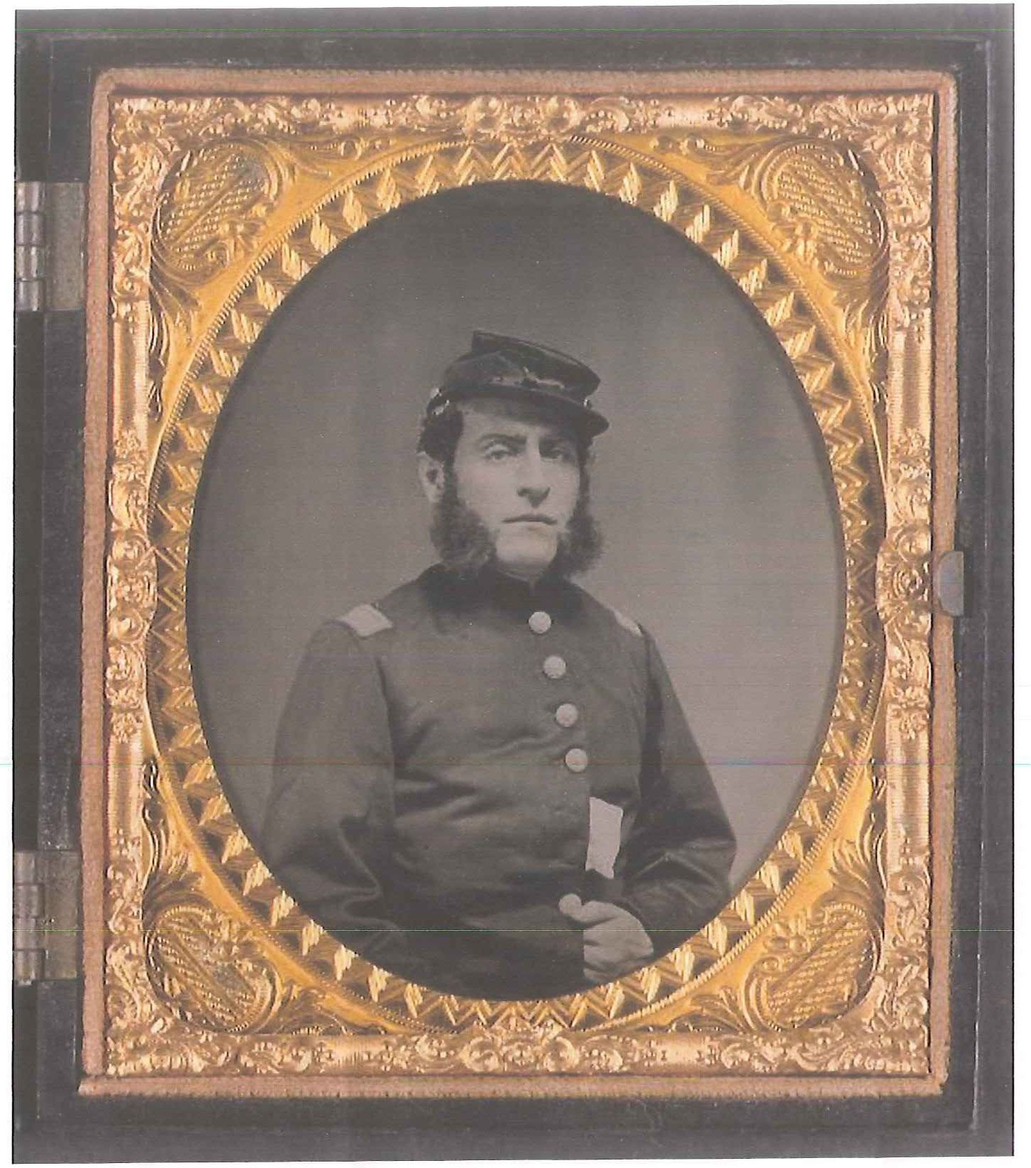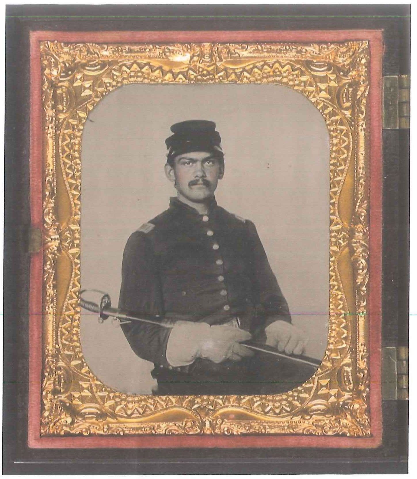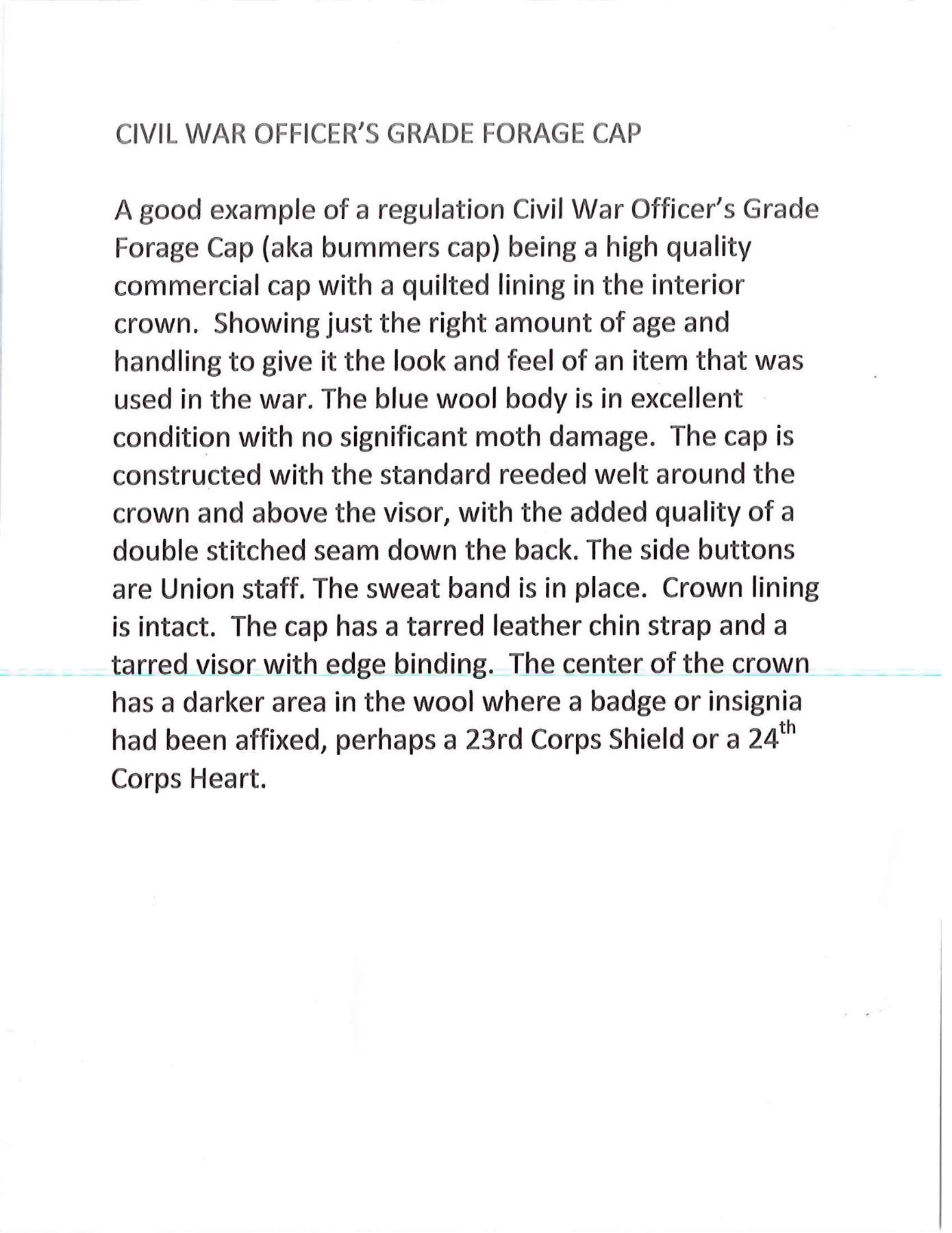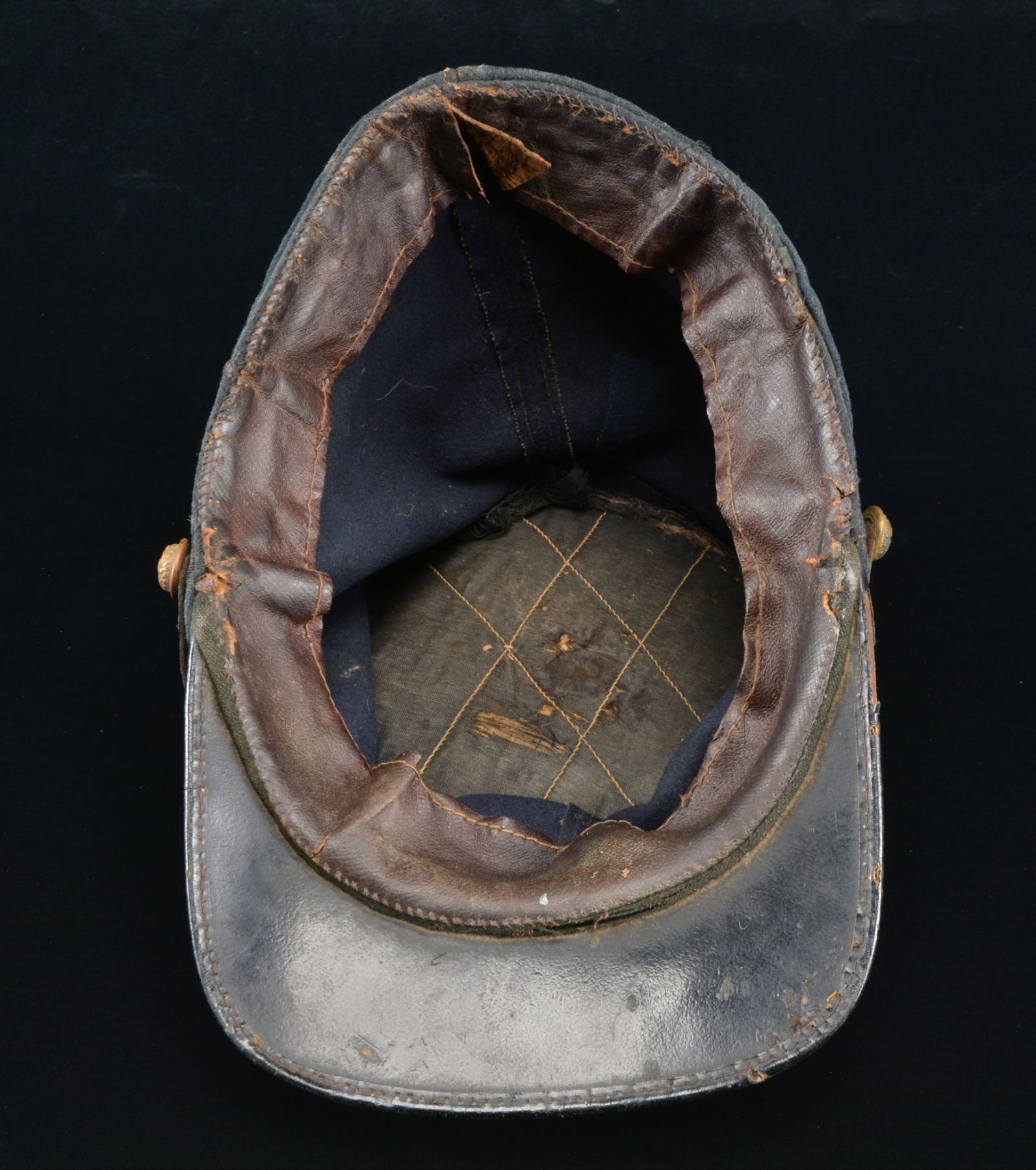 A good example of a regulation Civil War Officer's Grade Forage Cap (aka bummer's kepi) being a high quality commercial cap w/ a quilted lining in the interior crown. This hat no doubt saw war time use as there is still a faded shield shape on crown for possibly a 23rd Army Corp. badge or something of same shape that was attached. The cap is constructed w/ the standard reeded welt around the crown & above the visor, w/ the added quality of a dbl. stitched seam down the back. The side buttons are Union staffs. The original sweat band & chin strap are intact. All in all, a very presentable war time company grade kepi. UNATTACHED ACCESSORIES: custom plexiglass case, picture printouts, plexiglass display plaque. CONDITION: overall very good. The blue wool body has moth tracking & there are 3 well repaired separations done from inside the hat utilizing other material. Hat is missing its silk lining w/ only sm. remnants still attached at edges. Patent leather sweat band is fairly sound & solid w/ some cracking & crazing. Brim is very good including sewn edging. Chin strap is original as are the 2 matching side buttons, though one has plain brass back & the other is more often seen tin-back. PROVENANCE: Herbert "Bert" Murch Collection. (02-12868/JS). $2,400-2,700.