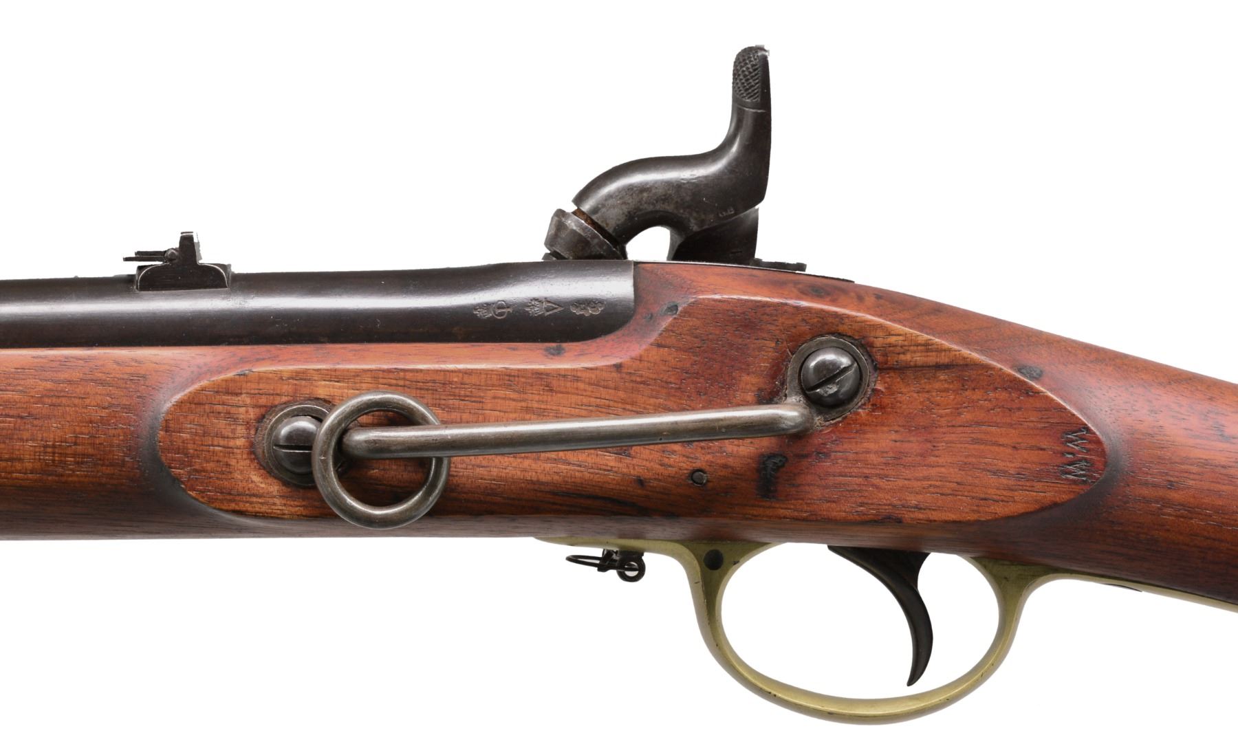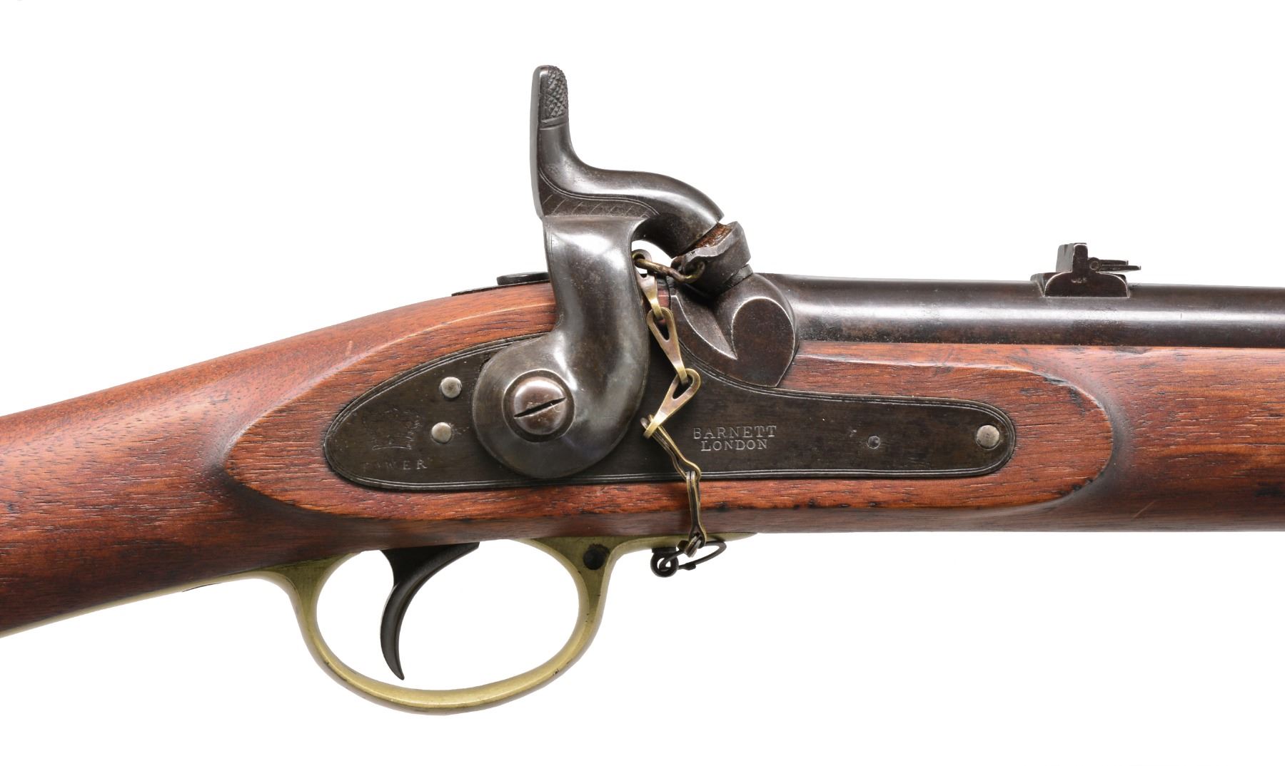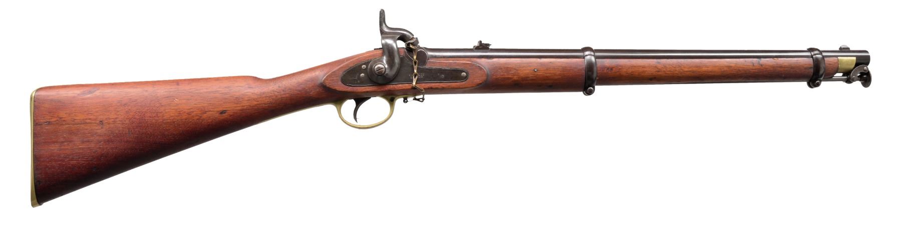 BARNETT SRC. Cal. 577. NSN. Bbl. 21". Standard configuration. Lock is marked w/ crown over "TOWER" rear of hammer & forward "BARNETT / LONDON". One of a handful in extremely fine condition. C.A. Huey & Russ Pritchard speculate in their text "The English Connection" that this handful of exceptional condition carbines were captured & possibly sold in a northern prize court (page 175-176). Over 10,000 were purchased & used & generally were found in well used condition. CONDITION: very fine overall. Bbl. retains strong traces of original blue finish w/ the balance turned plum. Lock & hammer are overall gray/silver. Brass has been cleaned w/ a light mustard patina. Stock is sound & well fit, cleaned but still w/ sharp edges & crisp "JS" / anchor marking on top of comb forward of buttplate tang. Also a crisp "W.W" is found on flat opposite lock. The "JS" / anchor viewer's mark & the "W.W" mark are both seen on Confederate imported weapons. Huey & Pritchard are not positive who "WW" is but state the possibility that he is William Warton, a Birmingham gun maker (page 105). Mechanics crisp & crisp rifled frosted bore. PROVENANCE: Ex-Vince Gill collection; Ex-Jim Foscue collection. (01-17194/JS). ANTIQUE. $5,000-7,000.