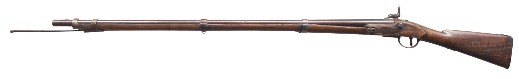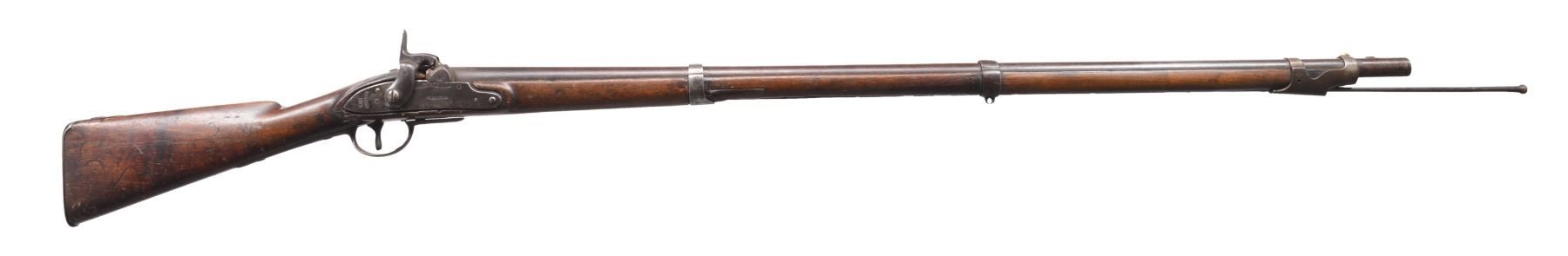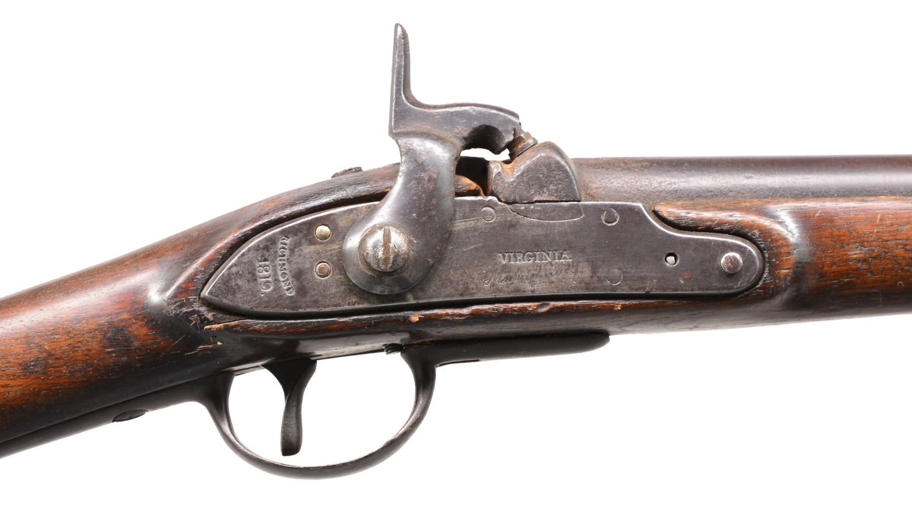 MANUFACTORY MUSKET. Cal. 71. NSN. This gun was just recently discovered in Richmond Virginia still w/ full length 42" bbl. The forestock has been stretched from the middle band forward & the rear & front bands are replaced, otherwise this a complete original S.C. Robinson Confederate conversion of an "1819" dated Virginia Manufactory musket w/ especially fine & crisp lock markings. There is an indiscernible name scratched on left side of buttstock. Assembly no "5" is found on buttplate, trigger guard, sideplate & middle band. CONDITION: good overall. Original w/ exception of wood forward of middle band, rear & front bbl. bands. Ramrod is original & the correct length but has a welded repair approx 15" from tip. Ramrod channel has blockage & ramrod extends approx. 6" past muzzle. Mechanically functional w/ smooth pitted bore. (01-17168/JS). ANTIQUE. $1,200-1,500.