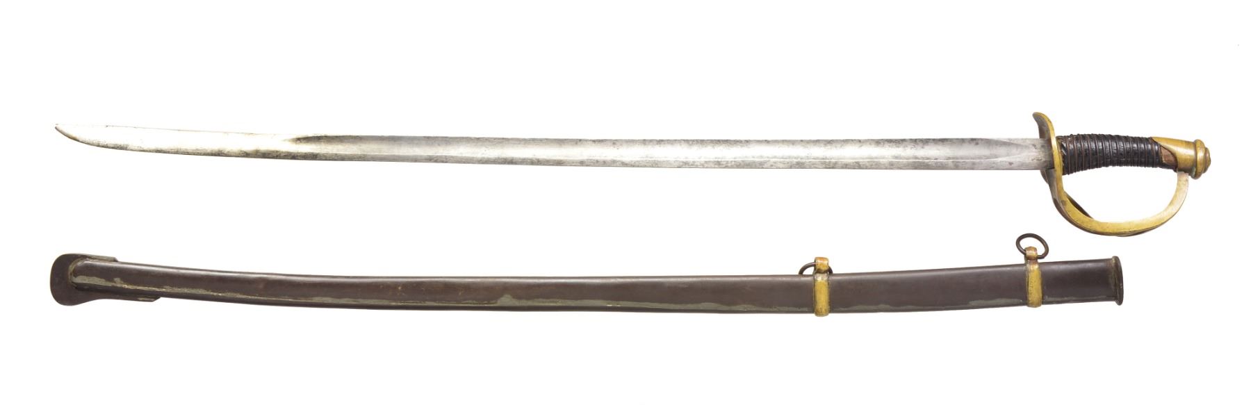 THOMAS GOODE OF 3RD VIRGINIA CAVALRY. Louis Haiman was among the most prolific sword makers in the Confederacy. His cavalry sabers are quite distinctive showing a horizontal "flaw" at ricasso, the braising of iron to steel. His hilts are also distinctive w/ lg. thick pommel, heavy iron wire & often w/ oil cloth grips such as this one. Haiman scabbards are also distinct being lap seamed w/ lead solder, iron flange soldered throats & distinctive heavy brass mts. These swords are not rare, they are commonly encountered, but this example ranks in the top few percent of completeness & condition plus it has history of the original owner. Thomas Francis Goode, a Mecklenburg country lawyer & member of the Virginia Secession Convention carried this sword. He enlisted in the 2nd Virginia Cavalry in May 1861 & was elected Capt. of Co. E. Co. E became a part of the 3rd Virginia Cavalry where Goode rose to the rank of Col., commanding the regiment until Oct. 1862. The 3rd saw action at Yorktown, Williamsburg, the Seven Days Battle, the Battle of 2nd Bull Run, & Antietam. He distinguished himself in battle under J.E.B Stuart, charging two companies of Illinois Cavalry w/ 100 men, driving them back into a lg. Union force. Gen. Bankhead recommended him for promotion to Brigadier General. J.E.B. Stuart wrote his wife a few days later saying, "the 3rd VA cavalry (Col. Goode) is now in my brigade & made a handsome charge". This sword was purchased from the descendants of Thomas Francis Goode as related by consignor. Accompanying the sword is a May 22, 1928 donation card with Daughters of the Confederacy imprint stating “Sword of T.F. Goode 2nd Virginia Cavalry”. Also accompanying sword is a large file of research, correspondence & biographical material. Mr. Murch has displayed this sword in his beautiful cavalry themed displays for many years. UNATTACHED ACCESSORIES: As noted above, large file and donation card. CONDITION: 35 3/4" blade shows original tool marks, is overall gray w/ staining & chipped blade tip. Grip retains most of its original oil cloth still w/ bright black color though worn & chipped at high areas & about 5% missing under pommel. Brass has a medium mustard patina matching on brass scabbard mts. Scabbard is smooth & brown w/ 1 lg. dent near drag. There appears to be additional peening on pommel to tighten hilt, which is very tight now. It is missing its protective leather washer that would have normally kept sword tight. PROVENANCE: Herbert "Bert" Murch Collection. (02-13452/JS). $4,000-6,000.