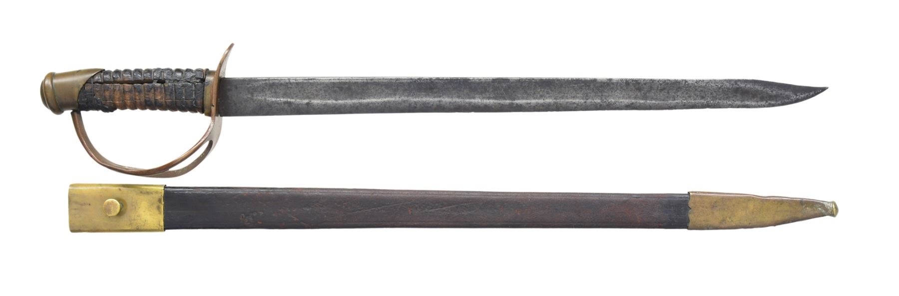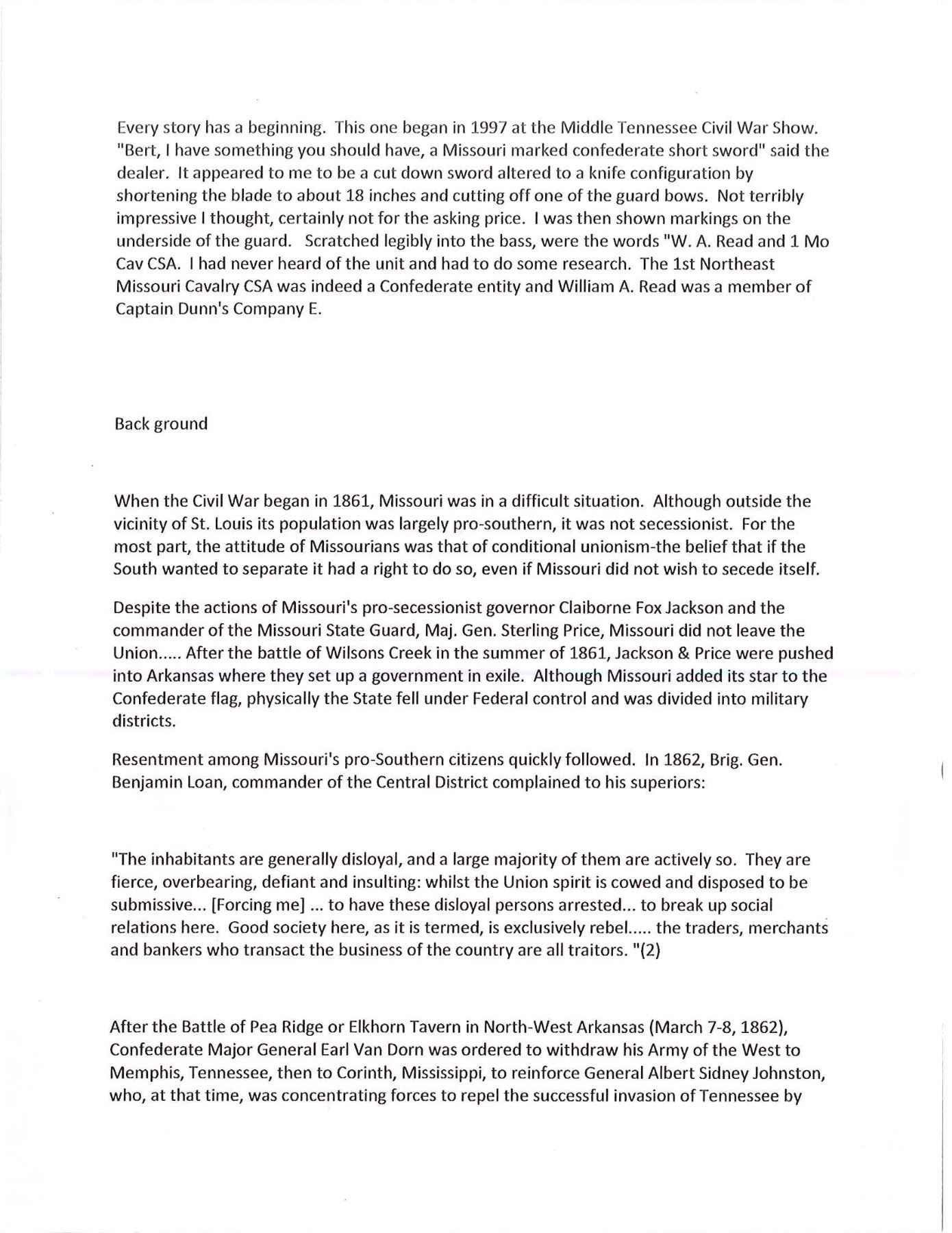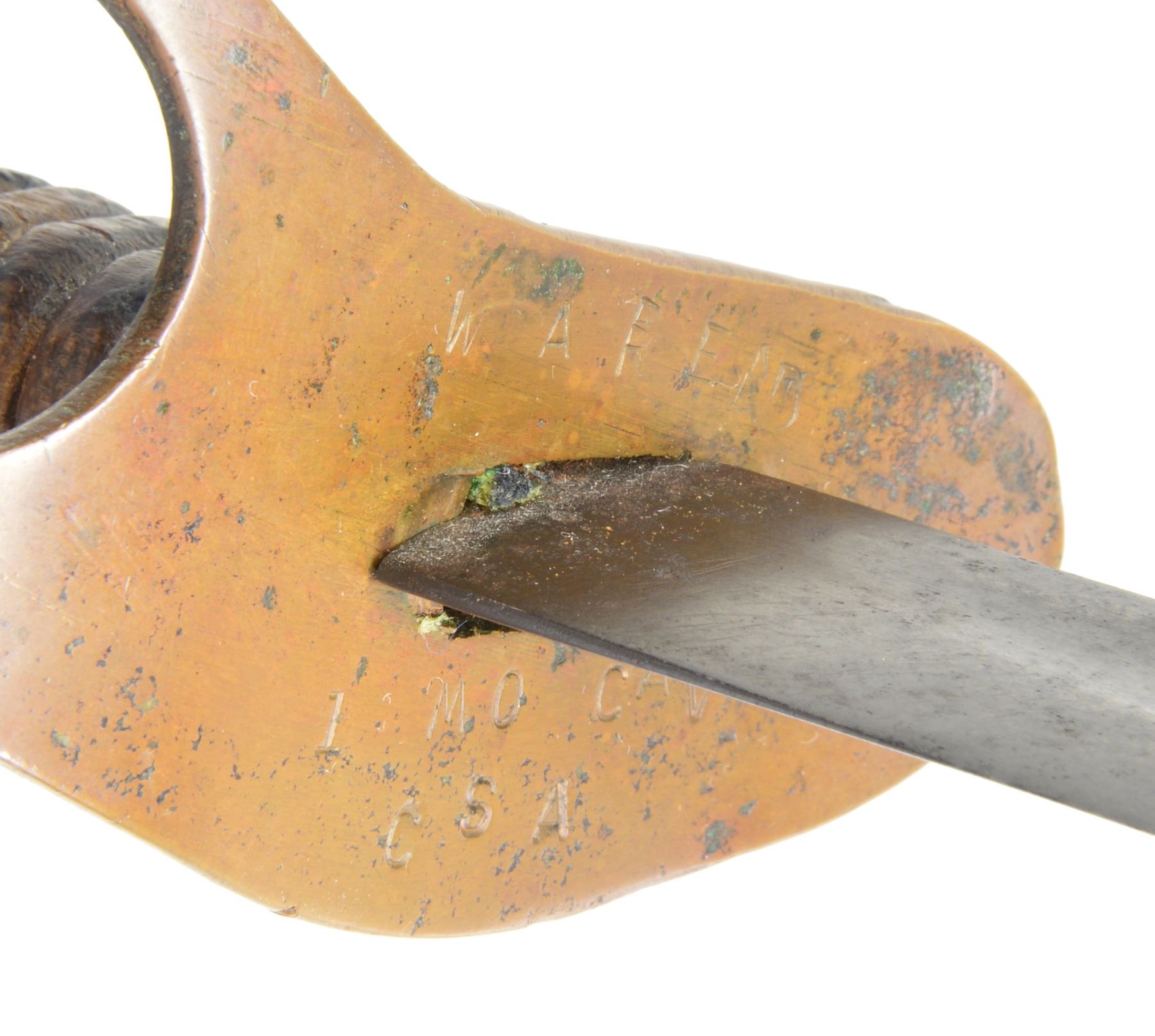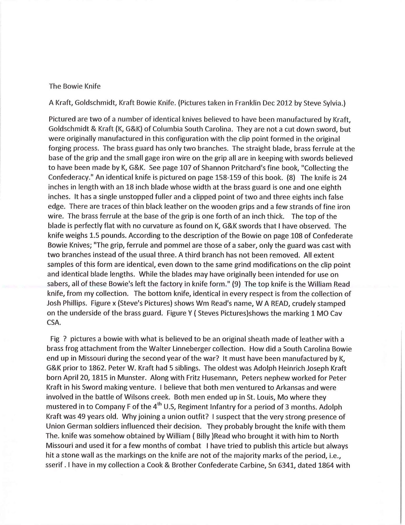 OF MISSOURI SOLDIER. This is one of perhaps 20 identical Bowies in existence today mfg. by K, G & K of Columbia, South Carolina. It is not a cut down sword, but was originally mfg. in this configuration w/ the clip point formed in the original forging process. The brass guard has only 2 branches. The straight blade, brass ferrule at the base of grip & thin leather & sm. gage iron wire on the grip are all keeping w/ swords made by K, G & K. The Bowie is 25" long w/ a blade width at the guard of 1 3/6". The scabbard was not made specifically for this knife, but does fit well. The brass guard is inscribed w/ stamped lettering "W A Read and 1 MO Cal, CSA". Read enlisted in the partisan ranger unit on July 25th, 1862 after at Wilsons Creek where he was wounded in 1861. The unit was formed by Major General Hindman, CSA, under the command of Col. J. C. Porter, a veteran of Wilsons Creek to tie up Union troops & recruit soldiers for Arkansas. The unit fought in sm. skirmishes or battles in northern MO at Florida, Moore's Mill, Kirksville, & Palmyra. On his amnesty report, Read is described as 33 years old, 5'8" tall w/ blue eyes & dark hair. Exploits of the 1st NE MO Cavalry are found in the OR's, the book, "With Porter in North Missouri", by Joseph A. Mudd & The Winter 200 edition of Blue & Gray magazine. UNATTACHED ACCESSORIES: a well researched 10 page unpublished article on this knife. CONDITION: very good overall. Hilt has untouched chocolate/mustard colored patina. Markings in guard are not typical of war time use, but could be a commemorative addition. Regardless; this is a fine example of the only K G & K made knife featured in "Confederate Bowie Knives", pg 108 by Melton, Phillips & Sexton. Blade is extremely sharp & gray overall w/ scattered staining & light pitting. Grip is missing 90% of its leather & retains only 2 strands of well patina iron wire. Grip has 2 lg. aged cracks. Accompanying scabbard is solid & fits sword well. PROVENANCE: Herbert "Bert" Murch Collection. (02-13419/JS). $800-1,200.