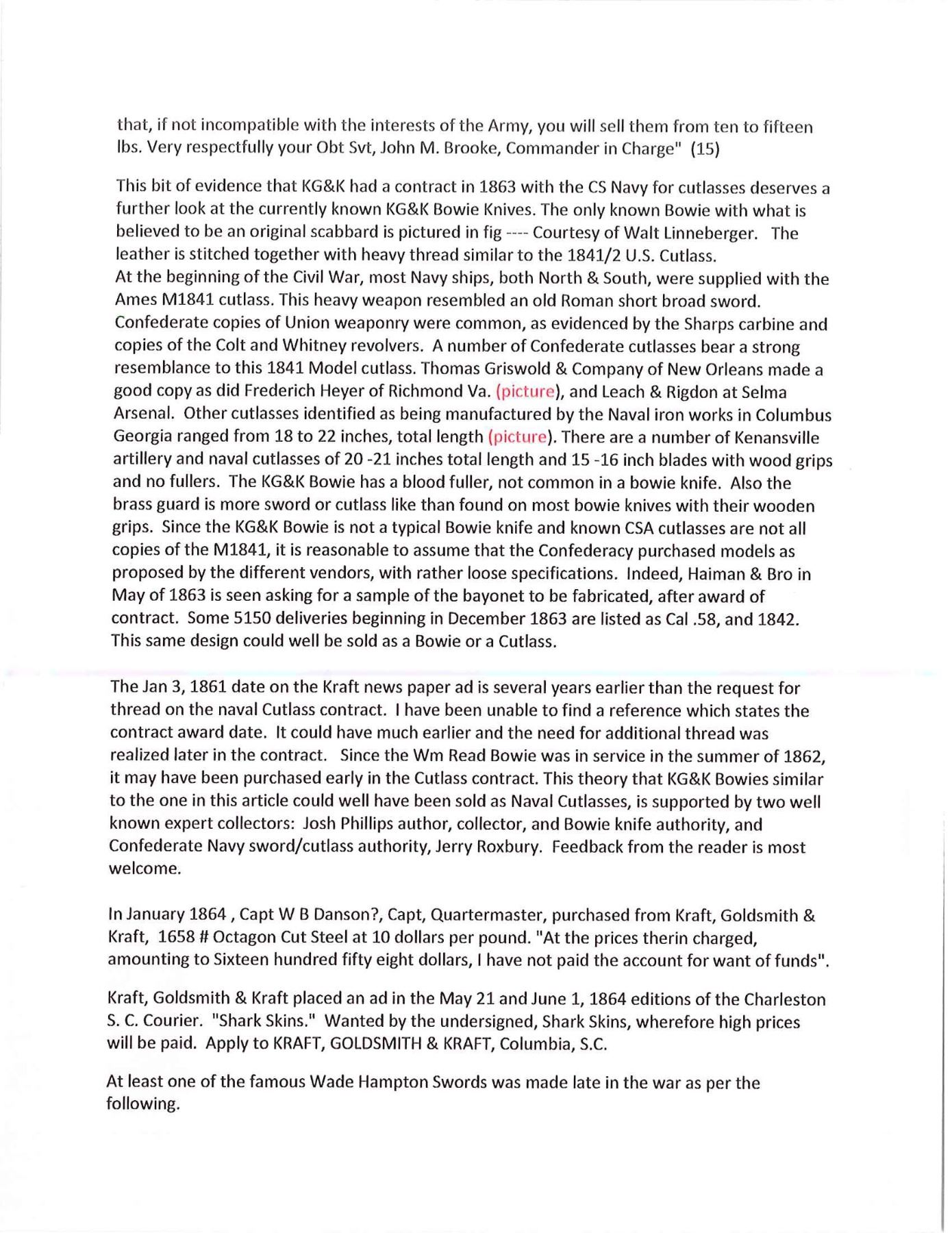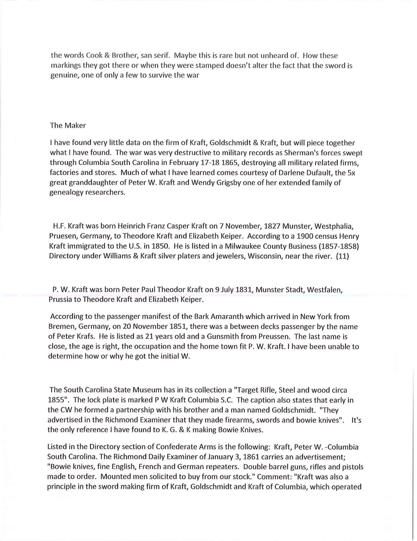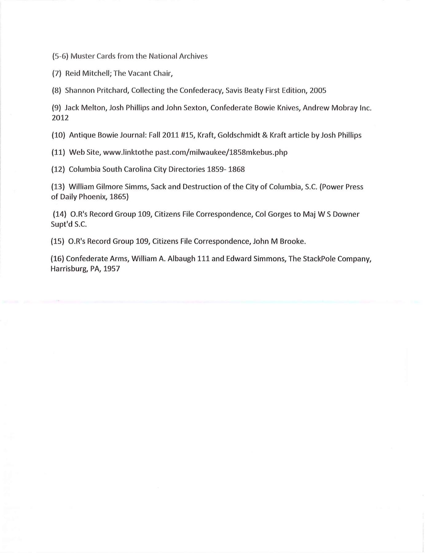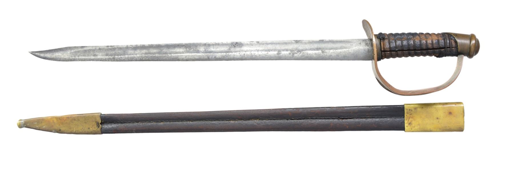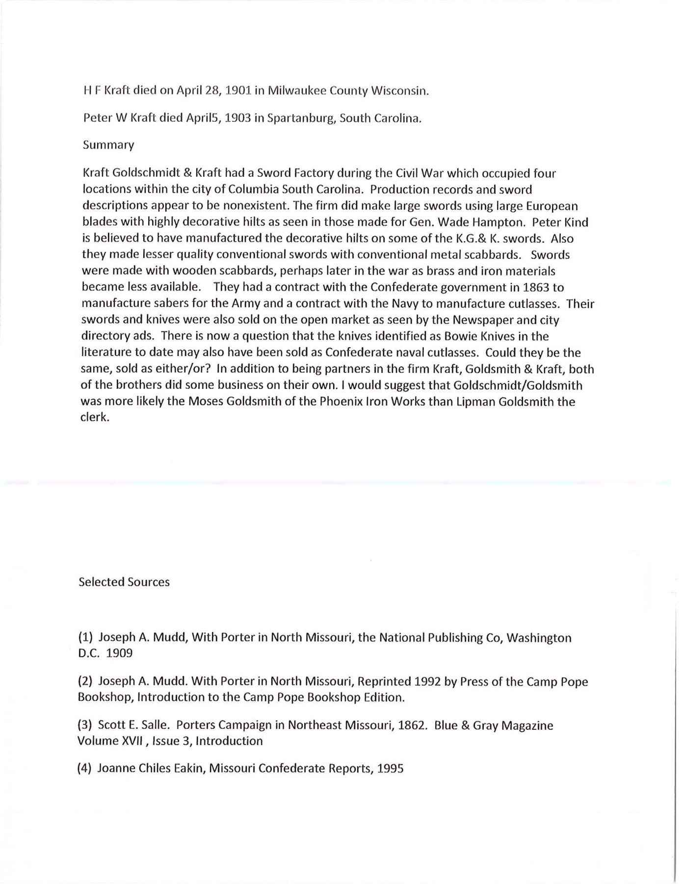 OF MISSOURI SOLDIER. This is one of perhaps 20 identical Bowies in existence today mfg. by K, G & K of Columbia, South Carolina. It is not a cut down sword, but was originally mfg. in this configuration w/ the clip point formed in the original forging process. The brass guard has only 2 branches. The straight blade, brass ferrule at the base of grip & thin leather & sm. gage iron wire on the grip are all keeping w/ swords made by K, G & K. The Bowie is 25" long w/ a blade width at the guard of 1 3/6". The scabbard was not made specifically for this knife, but does fit well. The brass guard is inscribed w/ stamped lettering "W A Read and 1 MO Cal, CSA". Read enlisted in the partisan ranger unit on July 25th, 1862 after at Wilsons Creek where he was wounded in 1861. The unit was formed by Major General Hindman, CSA, under the command of Col. J. C. Porter, a veteran of Wilsons Creek to tie up Union troops & recruit soldiers for Arkansas. The unit fought in sm. skirmishes or battles in northern MO at Florida, Moore's Mill, Kirksville, & Palmyra. On his amnesty report, Read is described as 33 years old, 5'8" tall w/ blue eyes & dark hair. Exploits of the 1st NE MO Cavalry are found in the OR's, the book, "With Porter in North Missouri", by Joseph A. Mudd & The Winter 200 edition of Blue & Gray magazine. UNATTACHED ACCESSORIES: a well researched 10 page unpublished article on this knife. CONDITION: very good overall. Hilt has untouched chocolate/mustard colored patina. Markings in guard are not typical of war time use, but could be a commemorative addition. Regardless; this is a fine example of the only K G & K made knife featured in "Confederate Bowie Knives", pg 108 by Melton, Phillips & Sexton. Blade is extremely sharp & gray overall w/ scattered staining & light pitting. Grip is missing 90% of its leather & retains only 2 strands of well patina iron wire. Grip has 2 lg. aged cracks. Accompanying scabbard is solid & fits sword well. PROVENANCE: Herbert "Bert" Murch Collection. (02-13419/JS). $800-1,200.