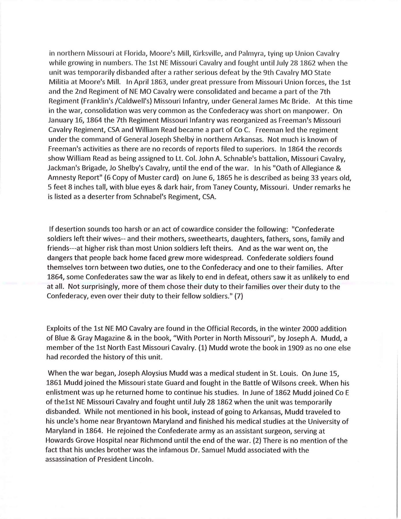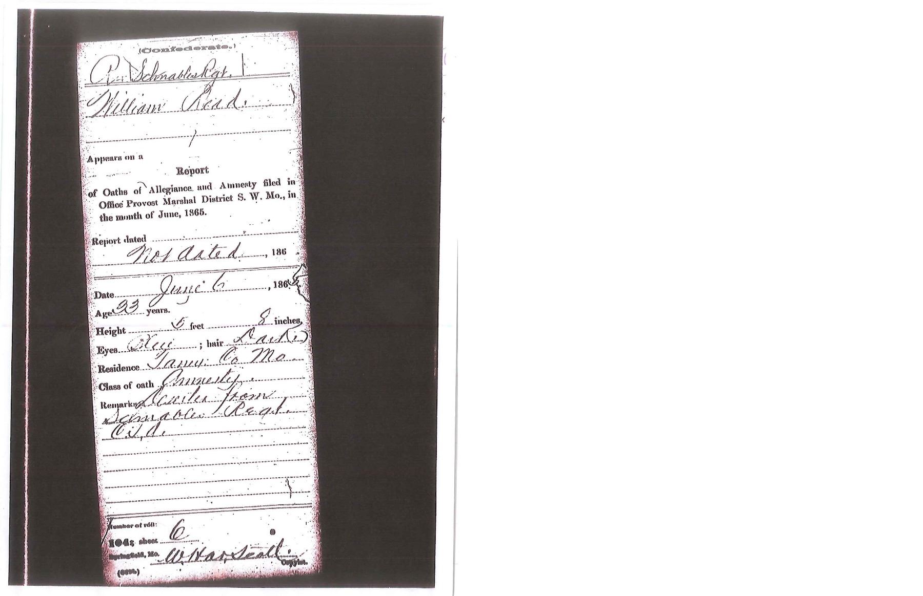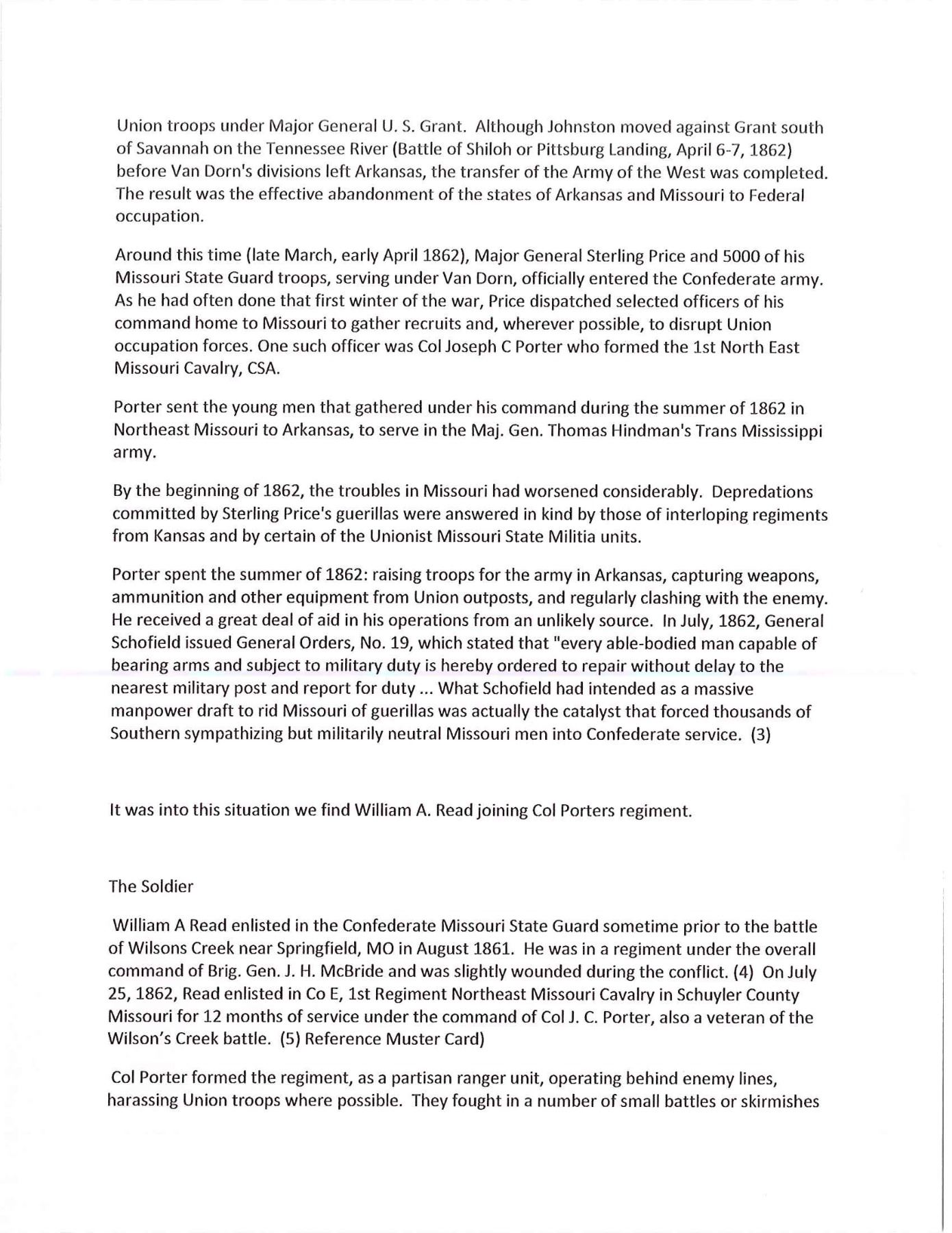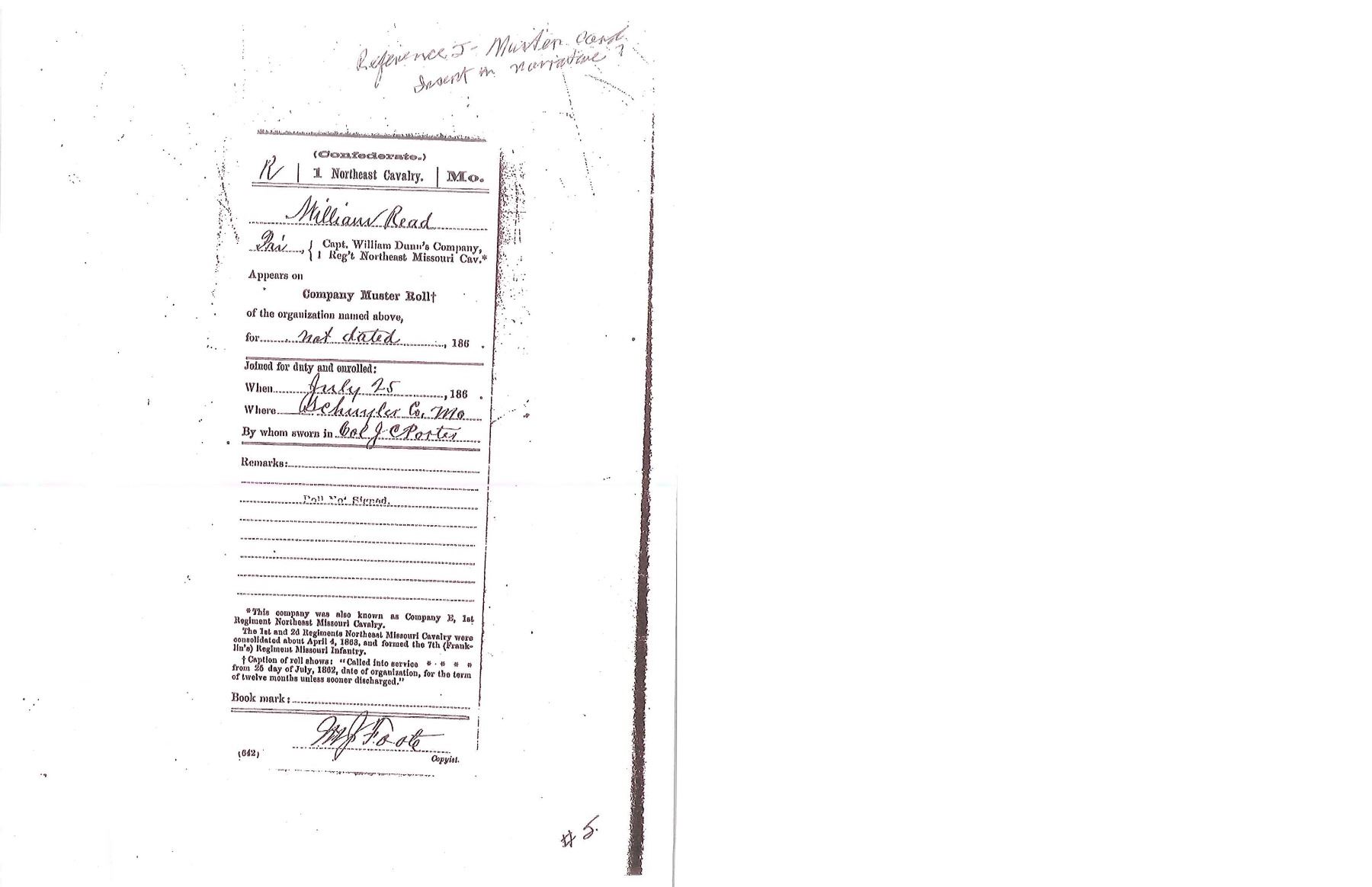 OF MISSOURI SOLDIER. This is one of perhaps 20 identical Bowies in existence today mfg. by K, G & K of Columbia, South Carolina. It is not a cut down sword, but was originally mfg. in this configuration w/ the clip point formed in the original forging process. The brass guard has only 2 branches. The straight blade, brass ferrule at the base of grip & thin leather & sm. gage iron wire on the grip are all keeping w/ swords made by K, G & K. The Bowie is 25" long w/ a blade width at the guard of 1 3/6". The scabbard was not made specifically for this knife, but does fit well. The brass guard is inscribed w/ stamped lettering "W A Read and 1 MO Cal, CSA". Read enlisted in the partisan ranger unit on July 25th, 1862 after at Wilsons Creek where he was wounded in 1861. The unit was formed by Major General Hindman, CSA, under the command of Col. J. C. Porter, a veteran of Wilsons Creek to tie up Union troops & recruit soldiers for Arkansas. The unit fought in sm. skirmishes or battles in northern MO at Florida, Moore's Mill, Kirksville, & Palmyra. On his amnesty report, Read is described as 33 years old, 5'8" tall w/ blue eyes & dark hair. Exploits of the 1st NE MO Cavalry are found in the OR's, the book, "With Porter in North Missouri", by Joseph A. Mudd & The Winter 200 edition of Blue & Gray magazine. UNATTACHED ACCESSORIES: a well researched 10 page unpublished article on this knife. CONDITION: very good overall. Hilt has untouched chocolate/mustard colored patina. Markings in guard are not typical of war time use, but could be a commemorative addition. Regardless; this is a fine example of the only K G & K made knife featured in "Confederate Bowie Knives", pg 108 by Melton, Phillips & Sexton. Blade is extremely sharp & gray overall w/ scattered staining & light pitting. Grip is missing 90% of its leather & retains only 2 strands of well patina iron wire. Grip has 2 lg. aged cracks. Accompanying scabbard is solid & fits sword well. PROVENANCE: Herbert "Bert" Murch Collection. (02-13419/JS). $800-1,200.