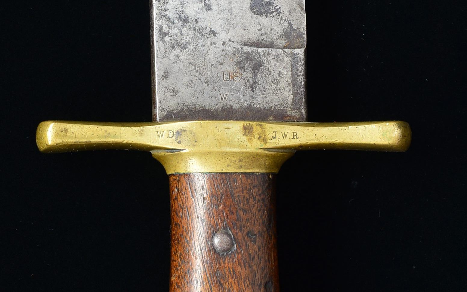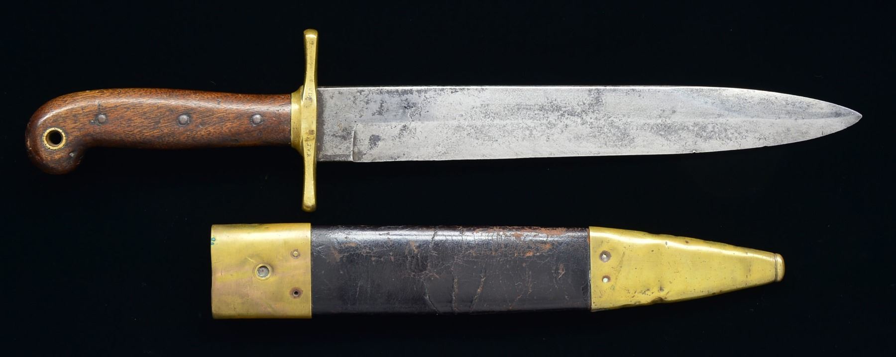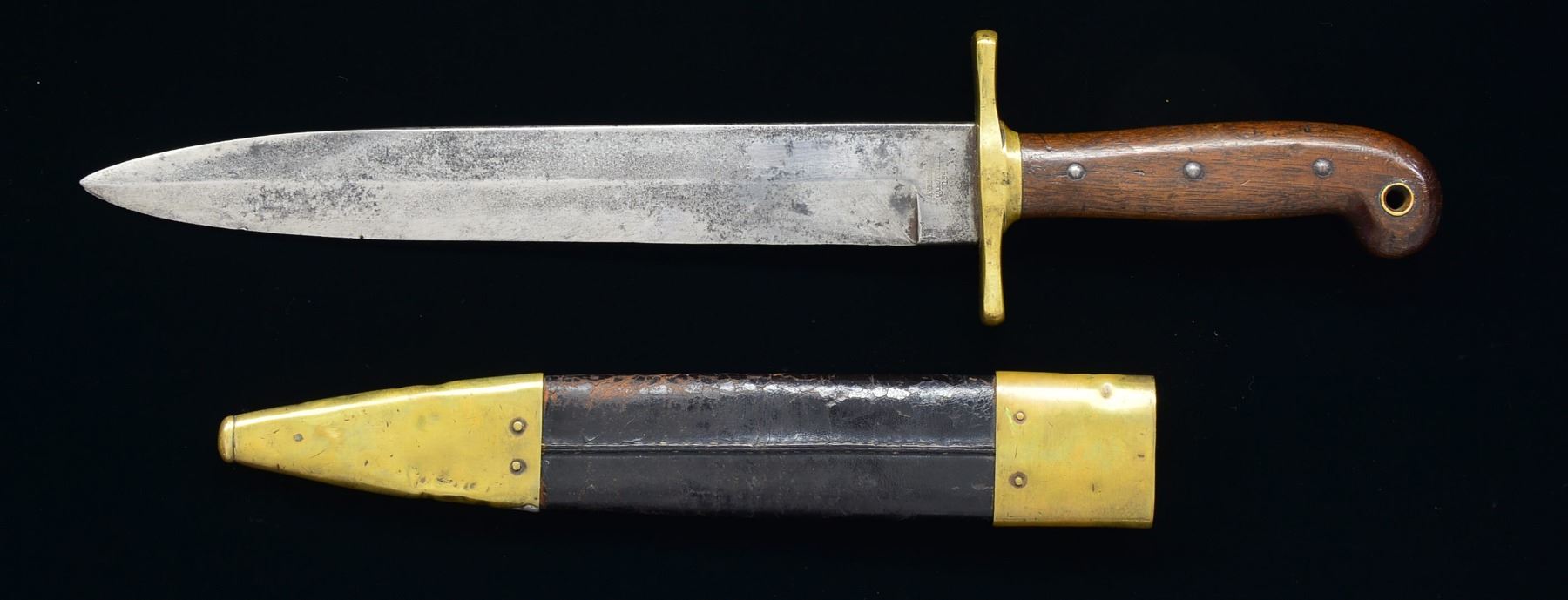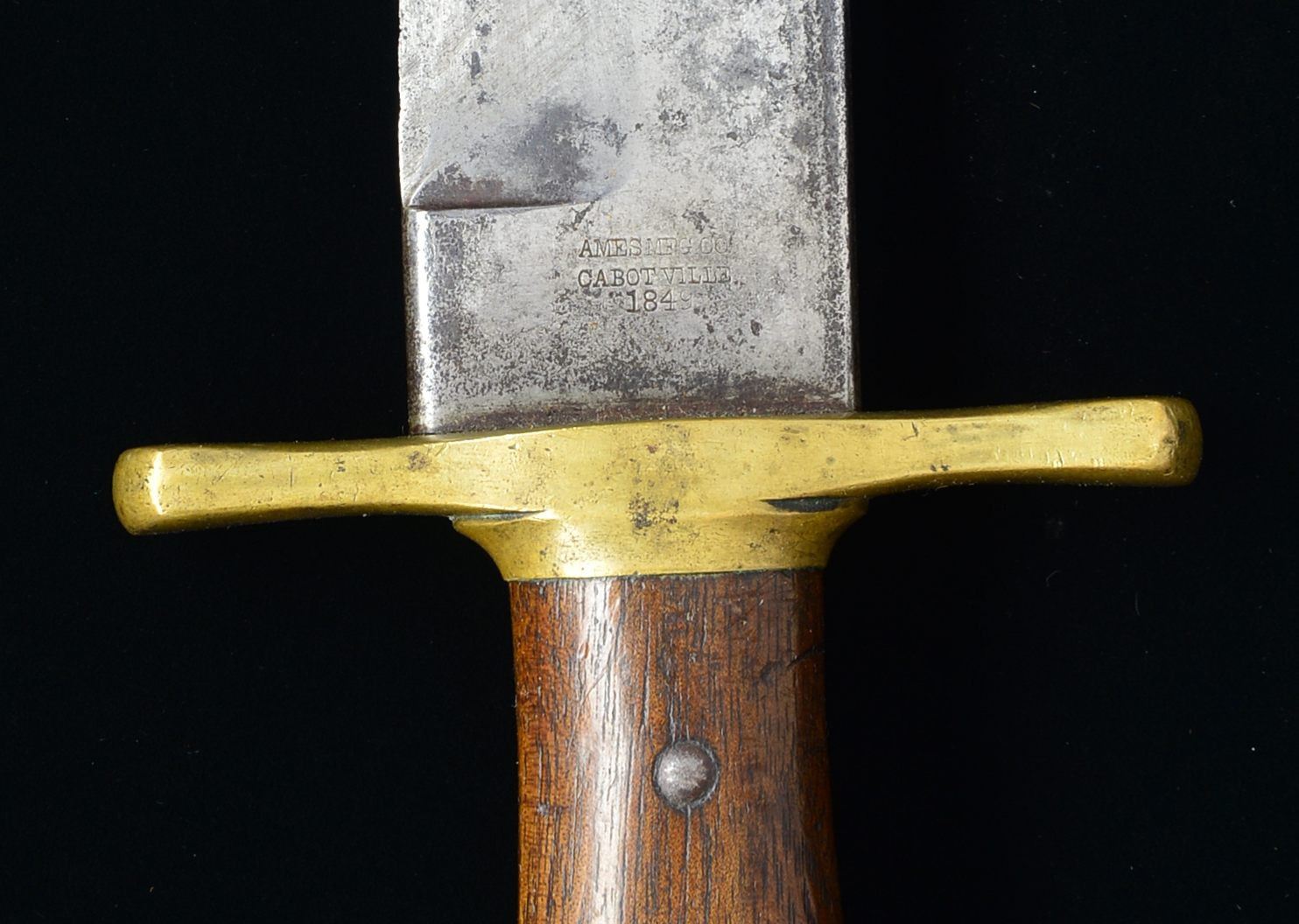 This is an honest, original & complete scarce American knife w/ original sheath, 18 1/4" overall in sheath, blade 11 3/4". CONDITION: good to very good overall, blade has discernable “AMES MFG CO / CABOTVILLE / 1849” on ricasso & “US / WD” on opposite ricasso, brass cross guard is also inspected “WD” & “JWR”, blade overall clean w/ sharpening & pitting, 2 piece wood slab grip has hand worn patina w/ scattered sm. cosmetic blemishes, correct brass mounted sheath has no discernable inspector, is missing 3 mt. attachment pins & frog button. (02-13692/JS). $800-1,200.