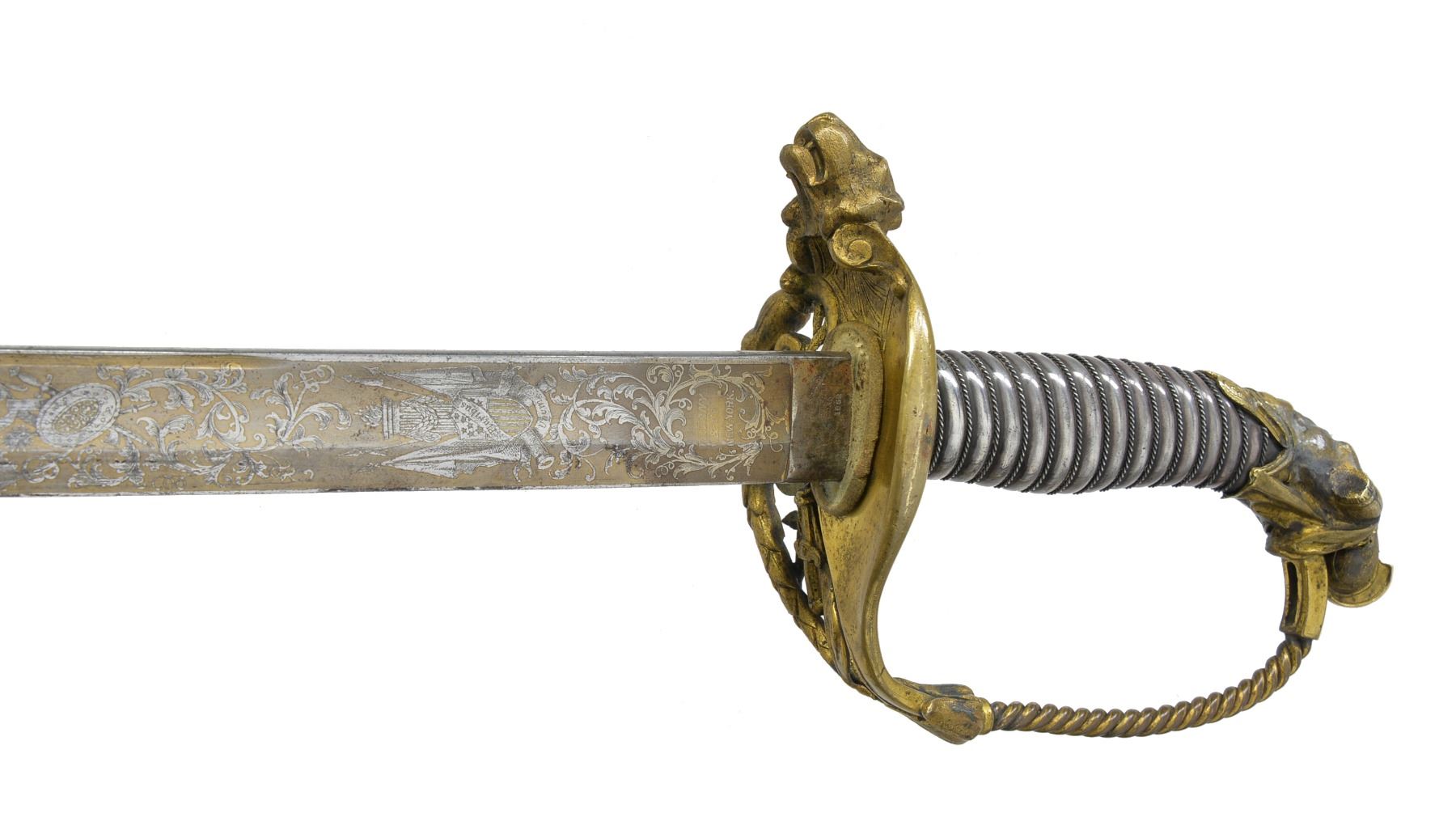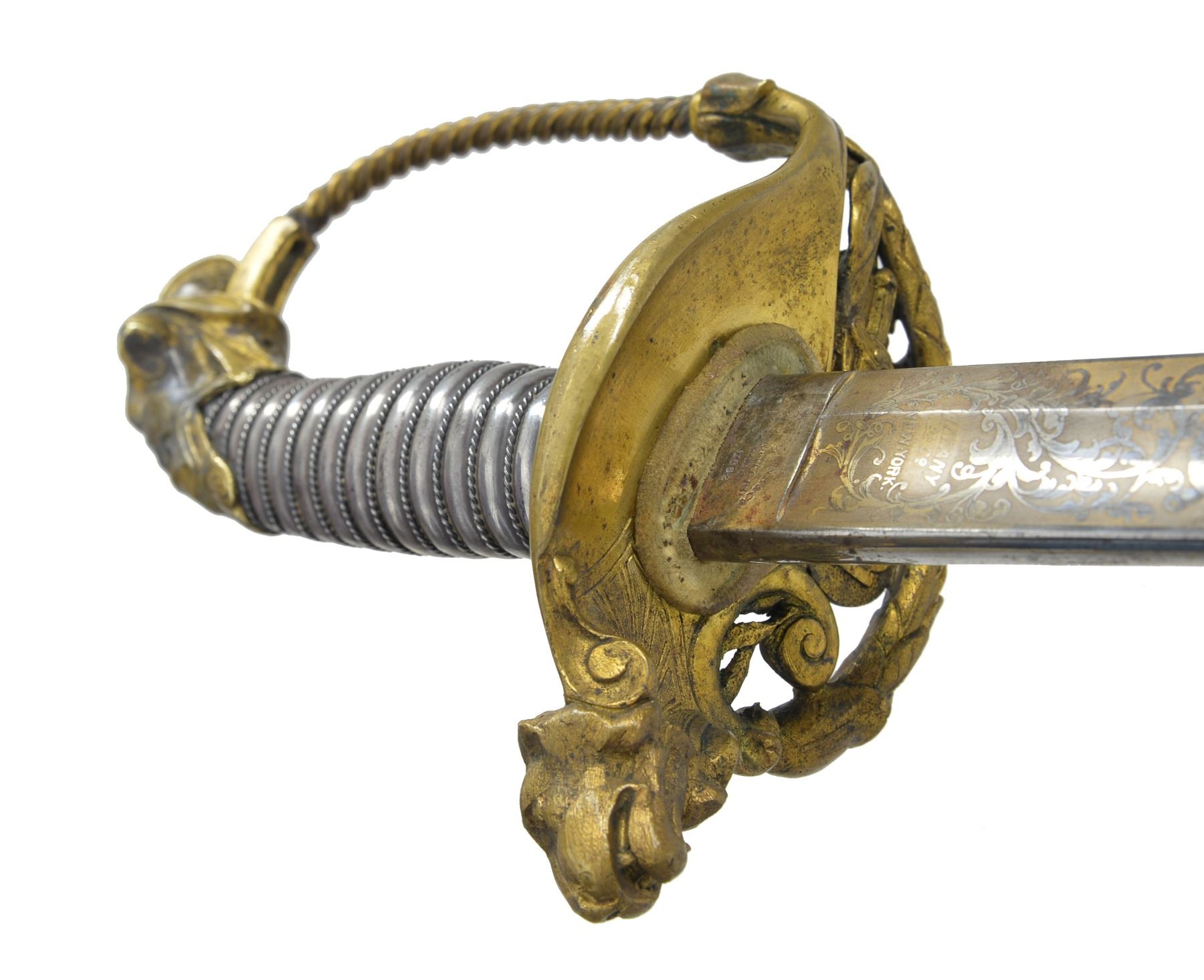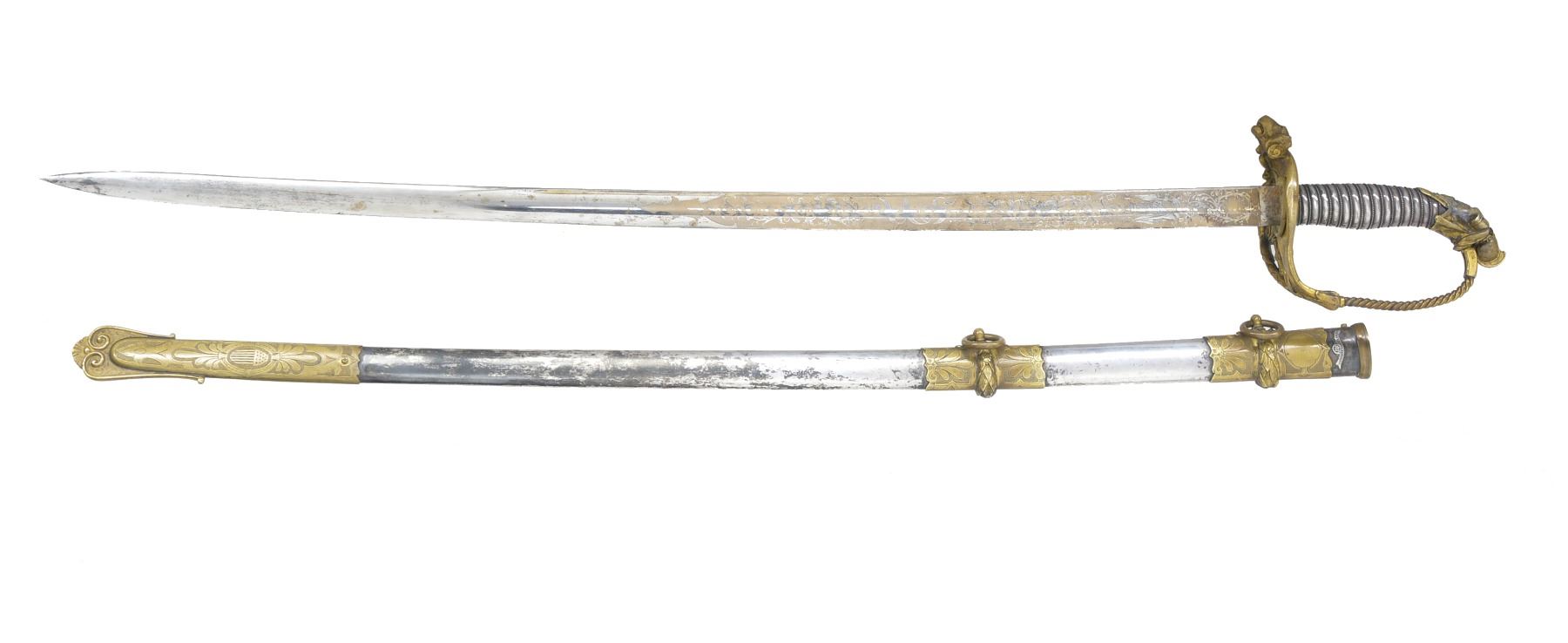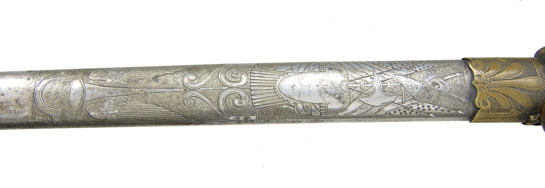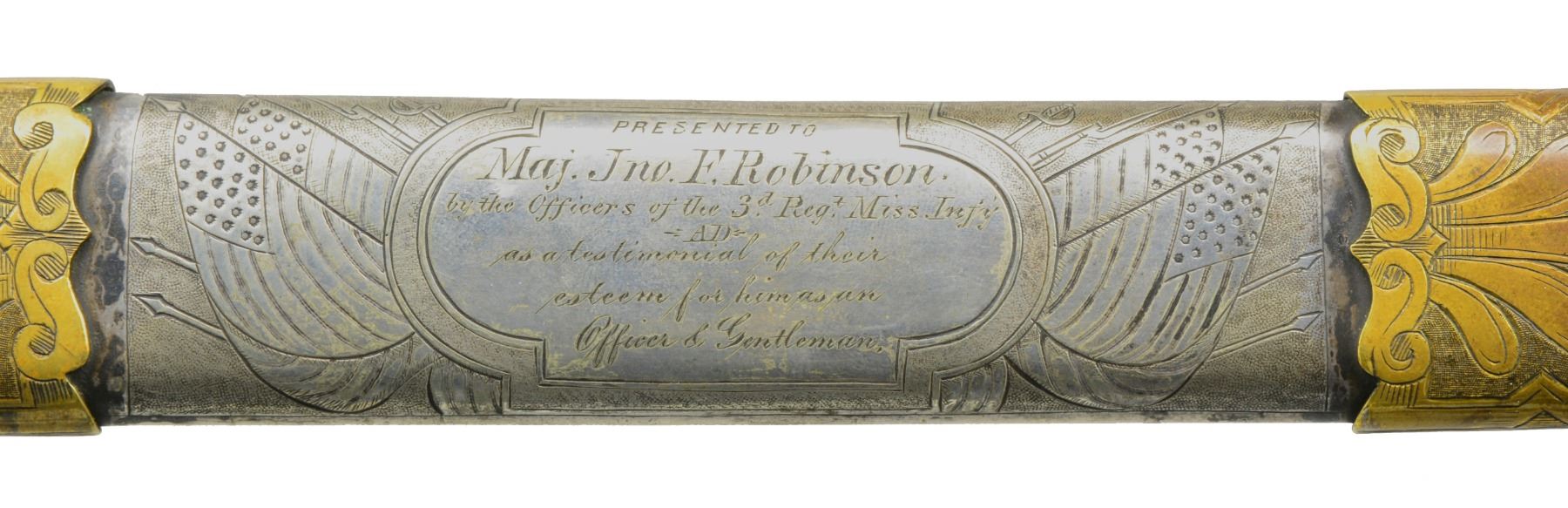 JOHN F. ROBINSON 3RD MISSISSIPPI INFANTRY OF AFRICAN DESCENT. This beautiful sword has a large presentation engraved on the silver scabbard body between top mounts surrounded by panoply of American flags “PRESENTED TO MAJ. JNO. F. ROBINSON / BY THE OFFICERS OF THE 3d REGT MISS. INFY / AD / AS A TESTIMONIAL OF THEIR ESTEEM FOR HIM AS AN / OFFICER & GENTLEMAN”. The “AD” in presentation is abbreviation for “AFRICAN DESCENT”. John F. Robinson (1841-1877) enlisted along with two of his brothers in the 42nd Ohio Infantry whose Col. would be later General and President John Garfield. Robinson enlisted as a 21-year-old Sgt. but soon had several promotions, he mustered out to accept a commission in the 3rd Mississippi Infantry of African Descent. Robinson was wounded by concussion of an exploding artillery shell May 19, 1863 at Vicksburg and suffered for his remaining time in the War. Robinson saw service w/ the 3rd Mississippi of African Descent in the Vicksburg district of war where one of the very few Civil War monuments honoring black Union soldiers is found. Robinson ended his service as Lt. Col. in the 53rd USCT (US Colored Troops) August 22nd 1864 due to lingering ill health. After the war John left for the west engaging in fur trading and ending up as a hotelier in Pembina, Dakota Territory, finally ending up in Blue Earth County Minnesota where he farmed. He died at 36 years old May 22nd, 1877 and is buried in Mankato, Minnesota. This high grade pattern Tiffany sword is often seen presented to Civil War Generals. This was an expensive sword in its day w/ all the gold and silver work. Sword features large lion headed quillon, Roman suit of armor pommel and spiral cut sheet silver grip with silver wire wrap. Silver scabbard has fine relief engraved mounts and engraved patriotic panels. Reverse of scabbard above throat has applied Tiffany and Company’s maker’s mark with script “M” denoting silver. The 32" blade is finely engraved with gold background to 16" patriotic etched panels, “TIFFANY & CO / NEW YORK” etched on one ricasso and blade makers mark stamped below “COLLINS & CO / HARTFORD / CONN / 1862”. Hilt has round central device with superimposed "US" with applied panoply of arms toward knucklebow. This is the highest grade presentation sword to a non general officer of a black Civil War regiment we are aware of. UNATTACHED ACCESSORIES: detailed biography of Maj. Robinson. CONDITION: fine overall. Blade retains most of its original luster with light staining and gold background is dull, retains original protective washer, hilt retains much of its original gold wash with worn areas light to medium mustard patina, scabbard mounts have traces of gold in protected areas with overall medium mustard patina, silver scabbard body has dark black/silver patina in some areas though overall silver/gray w/ crisp, well defined engraving, scabbard still retains original wood liner that protects blade. (02-13751/JS). $8,000-12,000.