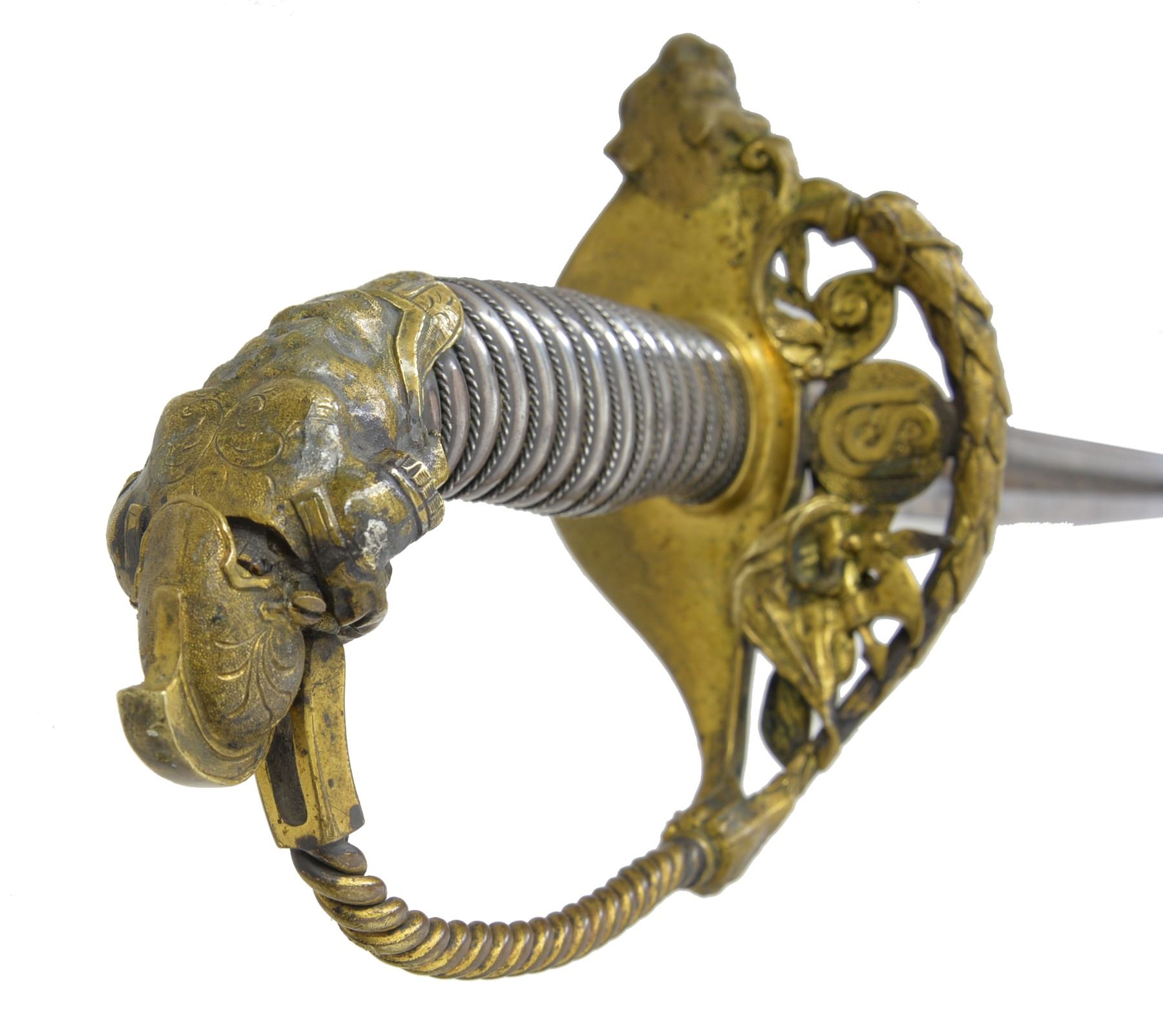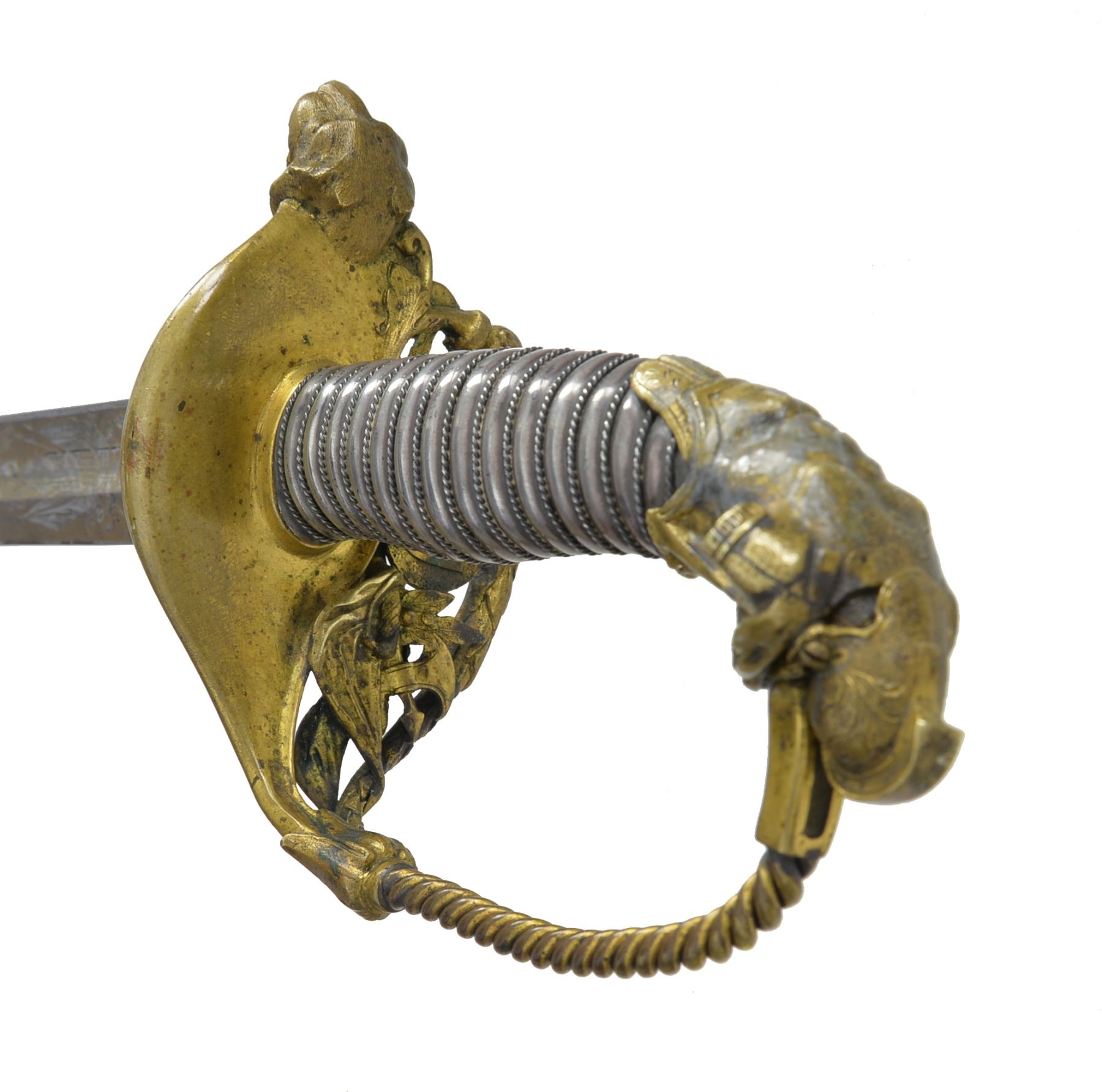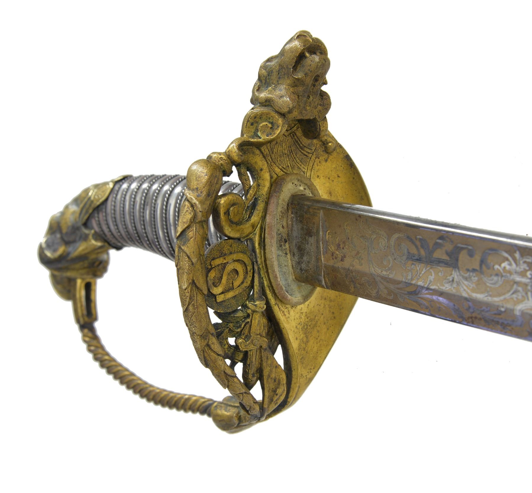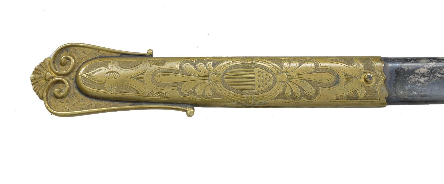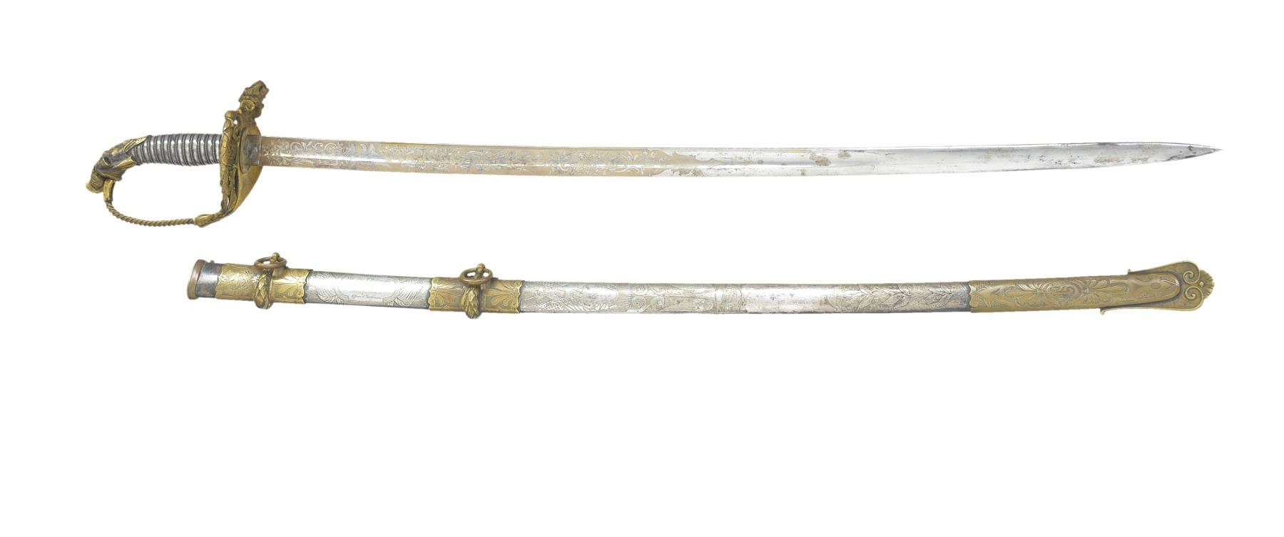 JOHN F. ROBINSON 3RD MISSISSIPPI INFANTRY OF AFRICAN DESCENT. This beautiful sword has a large presentation engraved on the silver scabbard body between top mounts surrounded by panoply of American flags “PRESENTED TO MAJ. JNO. F. ROBINSON / BY THE OFFICERS OF THE 3d REGT MISS. INFY / AD / AS A TESTIMONIAL OF THEIR ESTEEM FOR HIM AS AN / OFFICER & GENTLEMAN”. The “AD” in presentation is abbreviation for “AFRICAN DESCENT”. John F. Robinson (1841-1877) enlisted along with two of his brothers in the 42nd Ohio Infantry whose Col. would be later General and President John Garfield. Robinson enlisted as a 21-year-old Sgt. but soon had several promotions, he mustered out to accept a commission in the 3rd Mississippi Infantry of African Descent. Robinson was wounded by concussion of an exploding artillery shell May 19, 1863 at Vicksburg and suffered for his remaining time in the War. Robinson saw service w/ the 3rd Mississippi of African Descent in the Vicksburg district of war where one of the very few Civil War monuments honoring black Union soldiers is found. Robinson ended his service as Lt. Col. in the 53rd USCT (US Colored Troops) August 22nd 1864 due to lingering ill health. After the war John left for the west engaging in fur trading and ending up as a hotelier in Pembina, Dakota Territory, finally ending up in Blue Earth County Minnesota where he farmed. He died at 36 years old May 22nd, 1877 and is buried in Mankato, Minnesota. This high grade pattern Tiffany sword is often seen presented to Civil War Generals. This was an expensive sword in its day w/ all the gold and silver work. Sword features large lion headed quillon, Roman suit of armor pommel and spiral cut sheet silver grip with silver wire wrap. Silver scabbard has fine relief engraved mounts and engraved patriotic panels. Reverse of scabbard above throat has applied Tiffany and Company’s maker’s mark with script “M” denoting silver. The 32" blade is finely engraved with gold background to 16" patriotic etched panels, “TIFFANY & CO / NEW YORK” etched on one ricasso and blade makers mark stamped below “COLLINS & CO / HARTFORD / CONN / 1862”. Hilt has round central device with superimposed "US" with applied panoply of arms toward knucklebow. This is the highest grade presentation sword to a non general officer of a black Civil War regiment we are aware of. UNATTACHED ACCESSORIES: detailed biography of Maj. Robinson. CONDITION: fine overall. Blade retains most of its original luster with light staining and gold background is dull, retains original protective washer, hilt retains much of its original gold wash with worn areas light to medium mustard patina, scabbard mounts have traces of gold in protected areas with overall medium mustard patina, silver scabbard body has dark black/silver patina in some areas though overall silver/gray w/ crisp, well defined engraving, scabbard still retains original wood liner that protects blade. (02-13751/JS). $8,000-12,000.