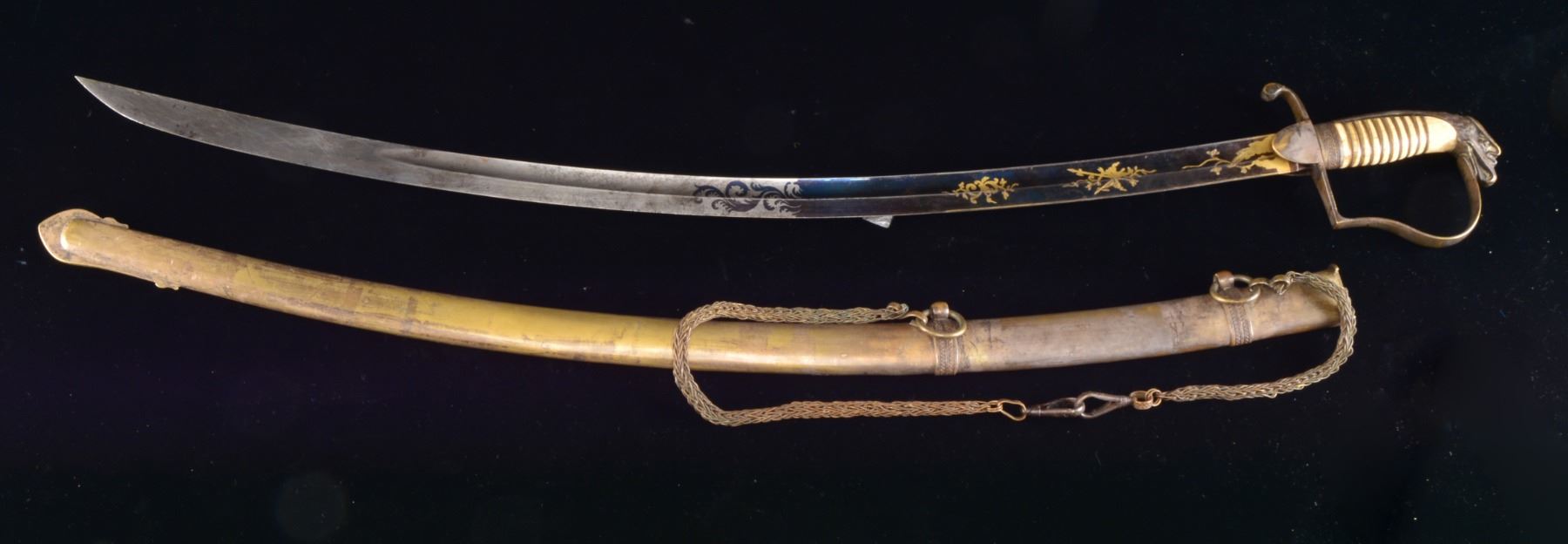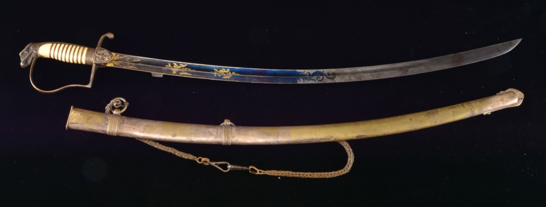 Overall length: 36 3/4". Blade length: 31”. Single fullered blade w/ gold highlighted etching on a blued field. Etching includes various military & foliate motifs. Silvered brass hilt has an American eagle on the front languet. Plain crossguard & knuckle bow w/ an eagle head pommel. Wire wrapped, “certifiably antique ivory” grip. Silvered brass scabbard w/ hanging chains attached. CONDITION: blade retains 95% blue & gold decoration. Balance of the blade has a light gray, slightly mottled patina. Hilt is loose, but retains 50% of its original silver plate. Grip has a sm. chip at the inside of the pommel. Wire is complete. Scabbard plating is 25% intact. Scabbard body has a few shallow dents. Hanging chains show wear but are undamaged. (02-13459/BF). $500-800.
