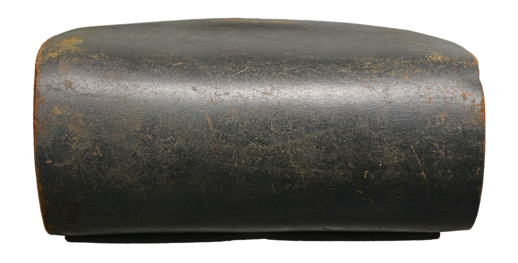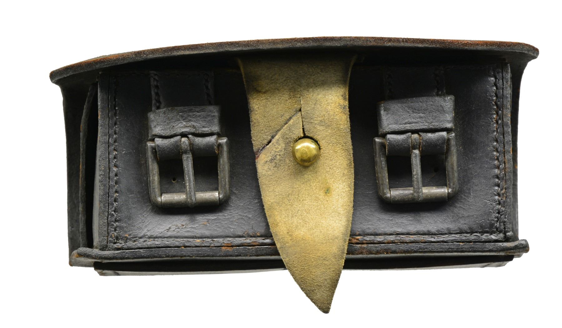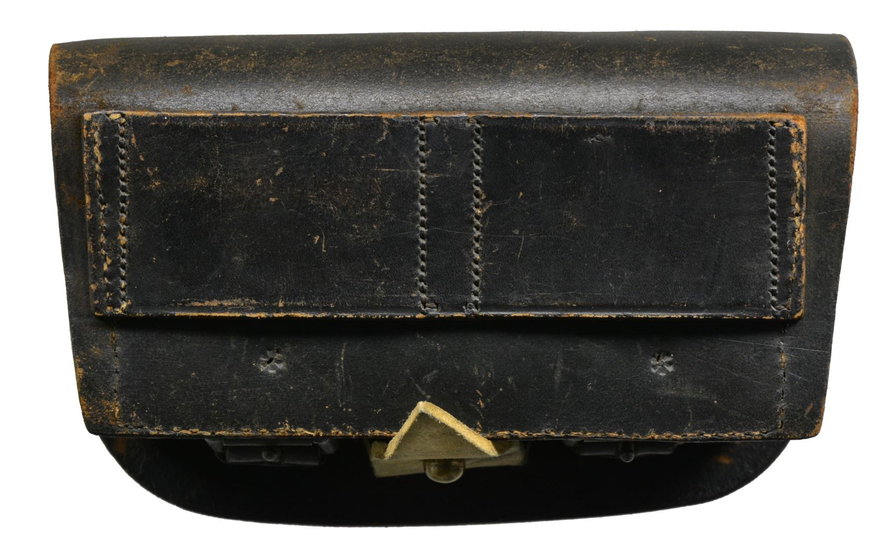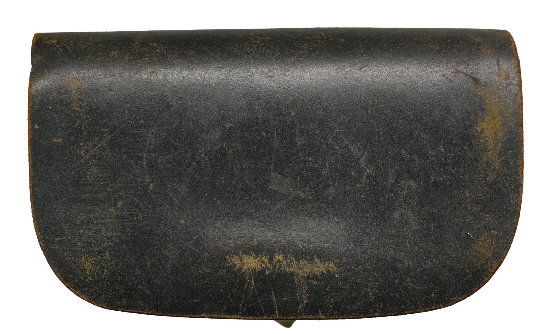 CARTRIDGE POUCH. Pouch measures 8 1/2" x 5” x 3 1/2”. A rare Civil War period English made Confederate cartridge pouch produced by the firm S. Isaac Campbell & Co. of London. This pattern pouch does not have the integral inside cap pouch & gun tool compartment as seen on the Pattern 1859, hence the name “New Pattern”. The box would have been supported by an over the shoulder cross belt passing through a center sewn 2” x 7 1/4" strap guide on the reverse of the box. The strap would have been secured w/ 2 iron roller buckles on the base of the box. The outer flap closes by use of a white buff billet secured over a brass finial on the base of the box. The billet has a cut on 1 side. The cut is thought to have been done by Confederate Ordnance authorities in order to facilitate easier opening & closing of the box. An inner flap closed by means of gravity & was secured by closing the outer flap. There is no tin liner in this box. The box is clearly stamped on the inside of the outer flap, just below the stitching on the closing tab, “S ISAAC CAMPBELL & CO 71 JERMYN ST LONDON” inside a tombstone shaped border. CONDITION: box is in extremely solid condition, showing only light wear throughout. There is a bit of mold on the inside flap. (02-13498-3/BF). $3,500-5,000.