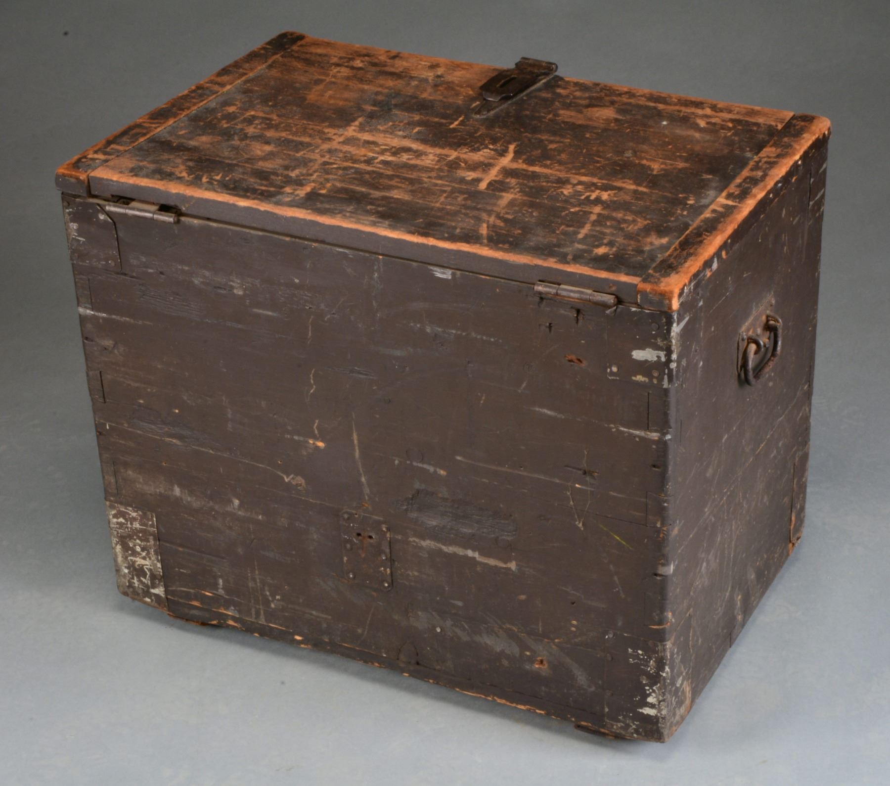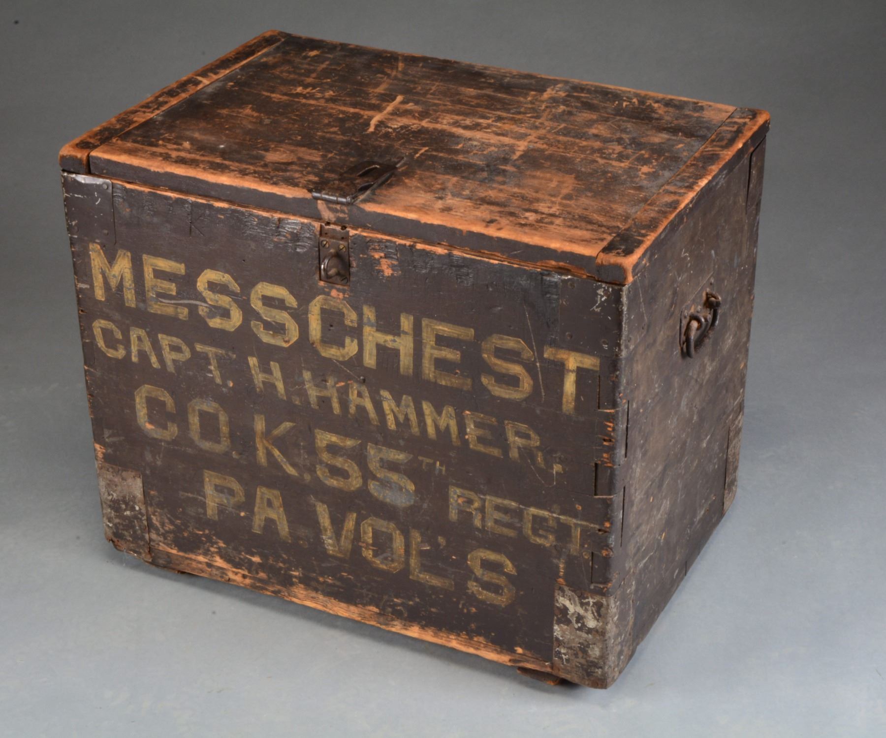VOLUNTEERS. This empty, flat topped wooden chest measures approx. 25 1/4” in length, 17” in width & 21” in height. The upper & lower corners are reinforced w/ sheet metal. There are 2 iron handles on each end & an iron hasp in the front to facilitate locking. The chest would have originally held various cooking & serving equipment used in feeding the officers of the regiment. The chest is painted in a dark blue/green w/ white painted letters on the front that read, “MESS CHEST CAPT. H. HAMMER. CO. K. 55TH REGT. PA. VOL’S”. Captain Hezekiah Hammer enlisted on November 5, 1861 w/ the 55th Pennsylvania. He was promoted to corporal late in 1863 & then sergeant June 1, 1864. 3 Months later he became first sergeant. On October 3rd he was commissioned second lieutenant & 5 weeks later first lieutenant. On Nov. 7th, he was promoted to captain of the 55th Pennsylvania Volunteers. Captain Hammer lost an arm at Petersburg, Va. on April 2, 1865. The 55th Pennsylvania saw service in South Carolina until April 12, 1864 when they embarked for Virginia. The regiment was involved in the Battle of Drewry’s Bluff, Bermuda Hundred, Cold Harbor, Siege of Petersburg including the mine explosion & the 55th was present during the surrender of Lee at Appomattox Court House. CONDITION: shows light to moderate wear to the paint throughout. Structurally the box is extremely solid. The painted letters on the front are quite clear & easily read. (02-13490/BF). $800-1,200.